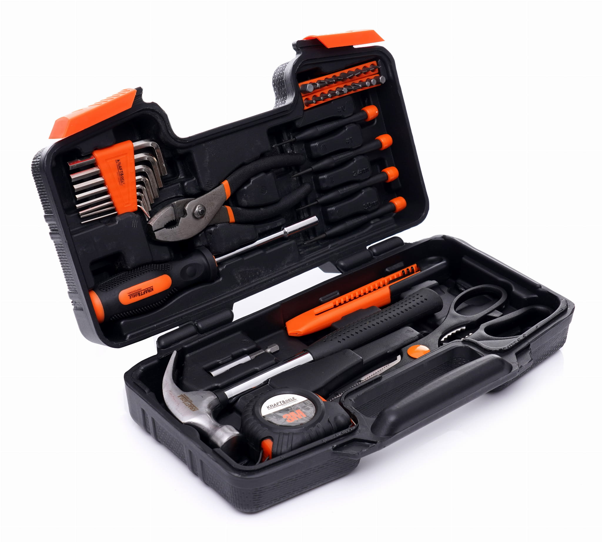 Kompaktowy zestaw narzędzi warsztatowych obejmujący nasadki 1/4", bity wielofunkcyjne, grzechotkę 72-zębową oraz akcesoria pomocnicze. Wszystkie elementy wykonano ze stali chromowo-wanadowej (CrV), a zestaw dostarczany jest w walizce transportowej z formowanymi gniazdami na każde narzędzie.