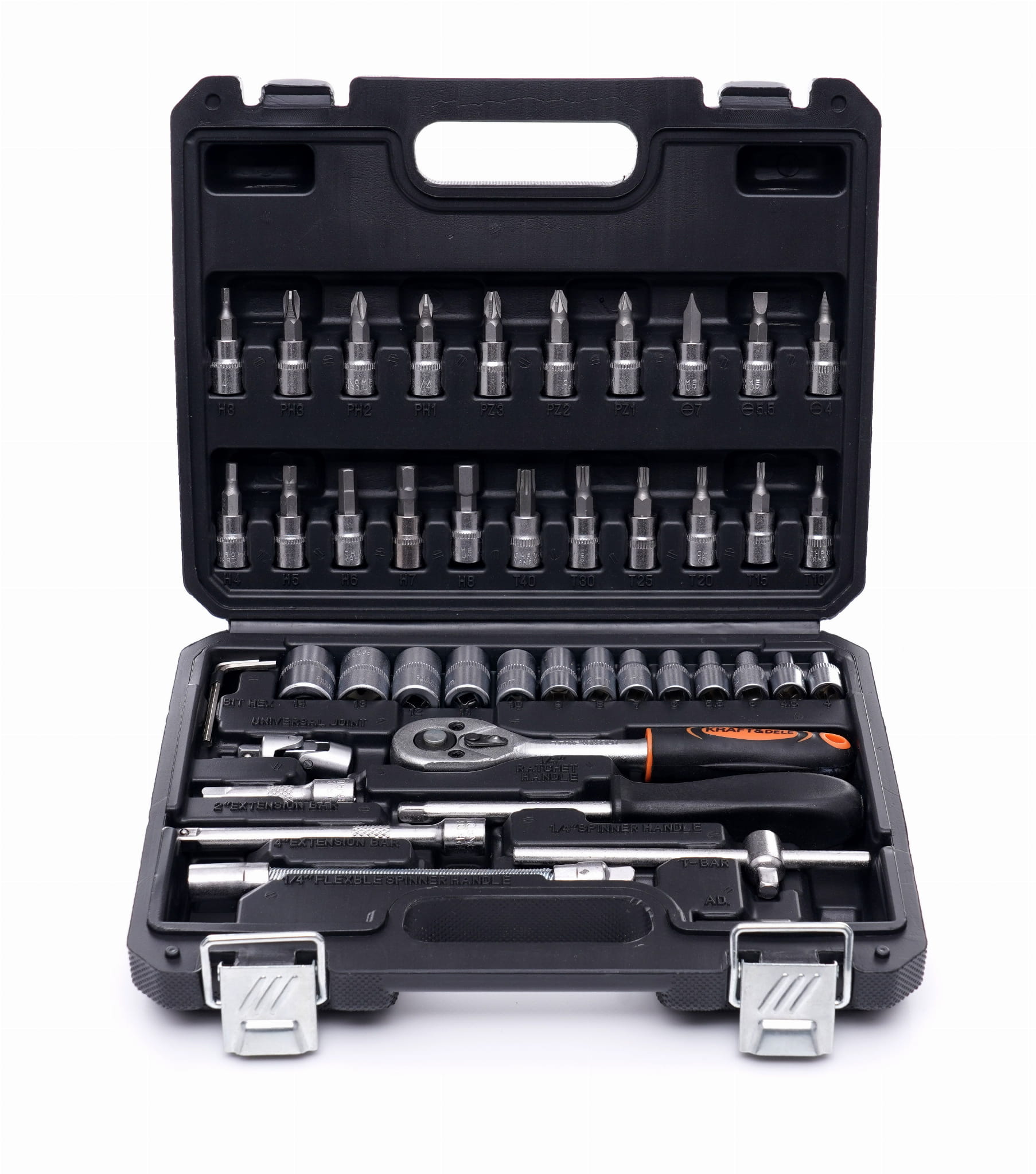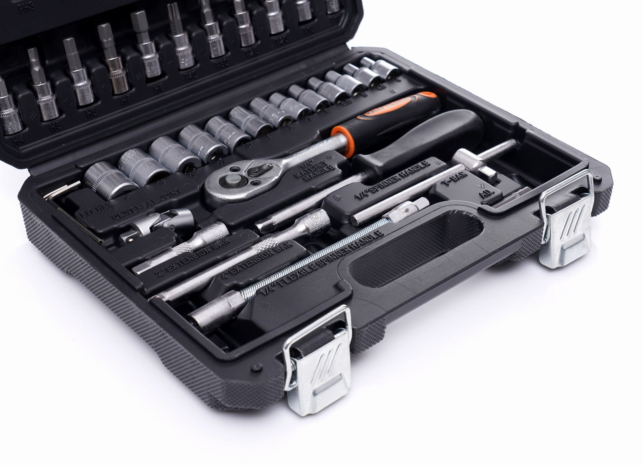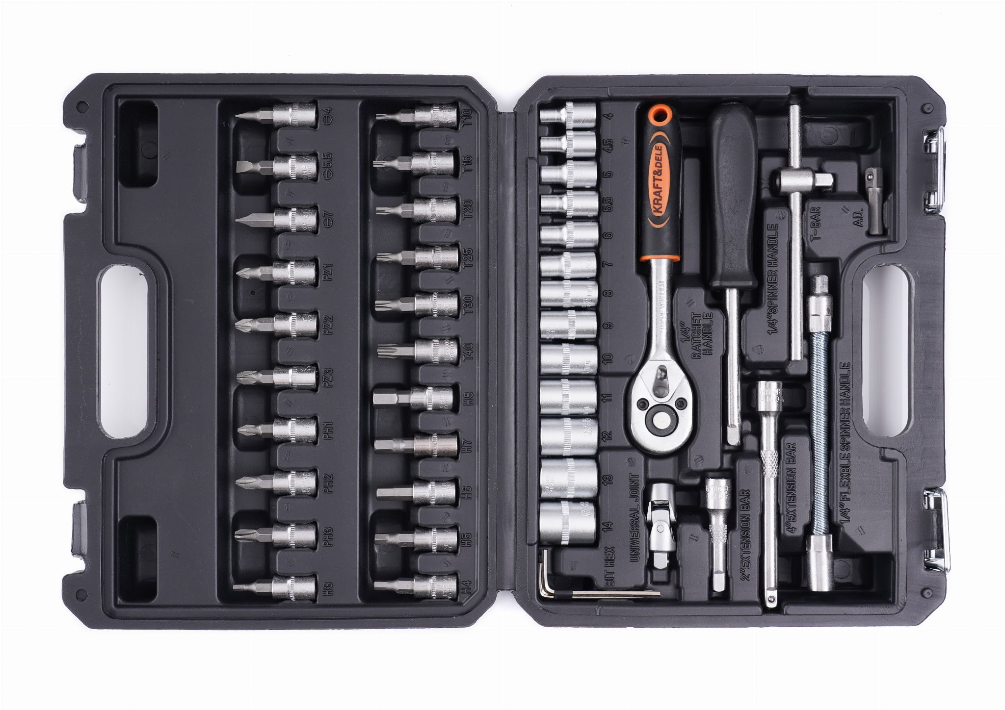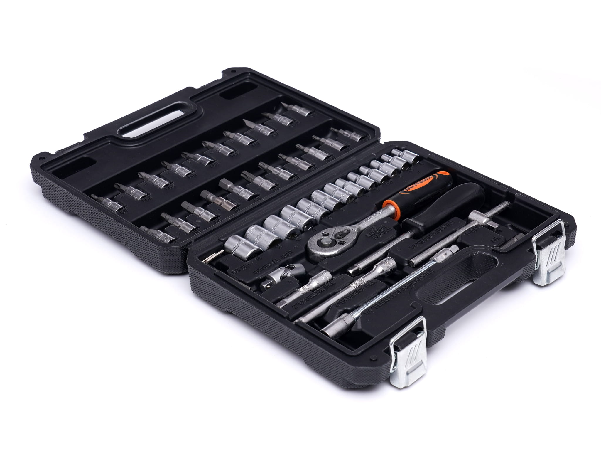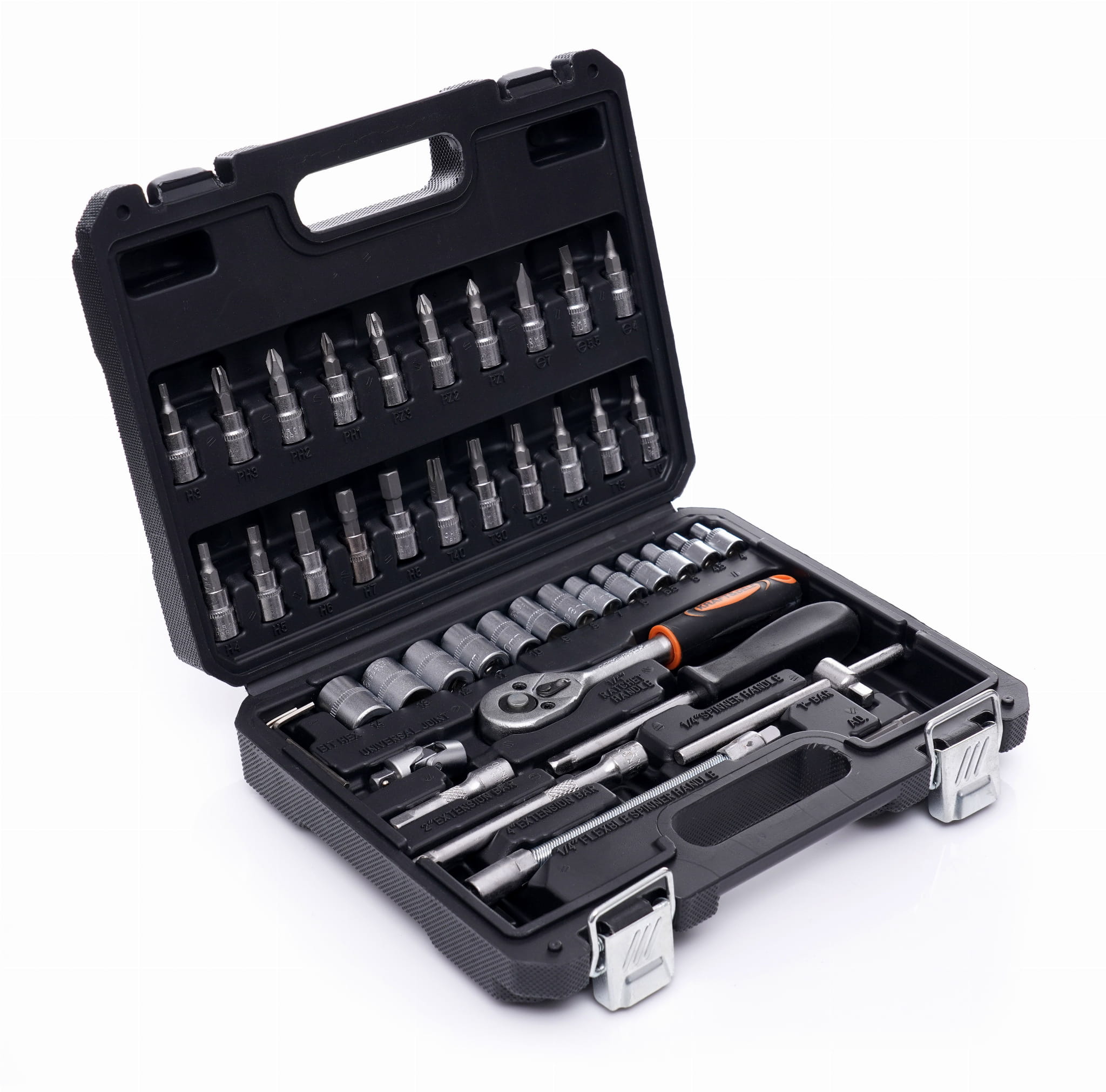 Kompaktowy zestaw narzędzi ręcznych napędu 1/4" przeznaczony do prac montażowych, serwisowych i warsztatowych. Obejmuje nasadki, bity wieloprofilowe, grzechotkę, przedłużki oraz akcesoria uzupełniające — wszystkie wykonane ze stali chromowo-wanadowej (CrV) i zapakowane w walizkę z formowanymi gniazdami.