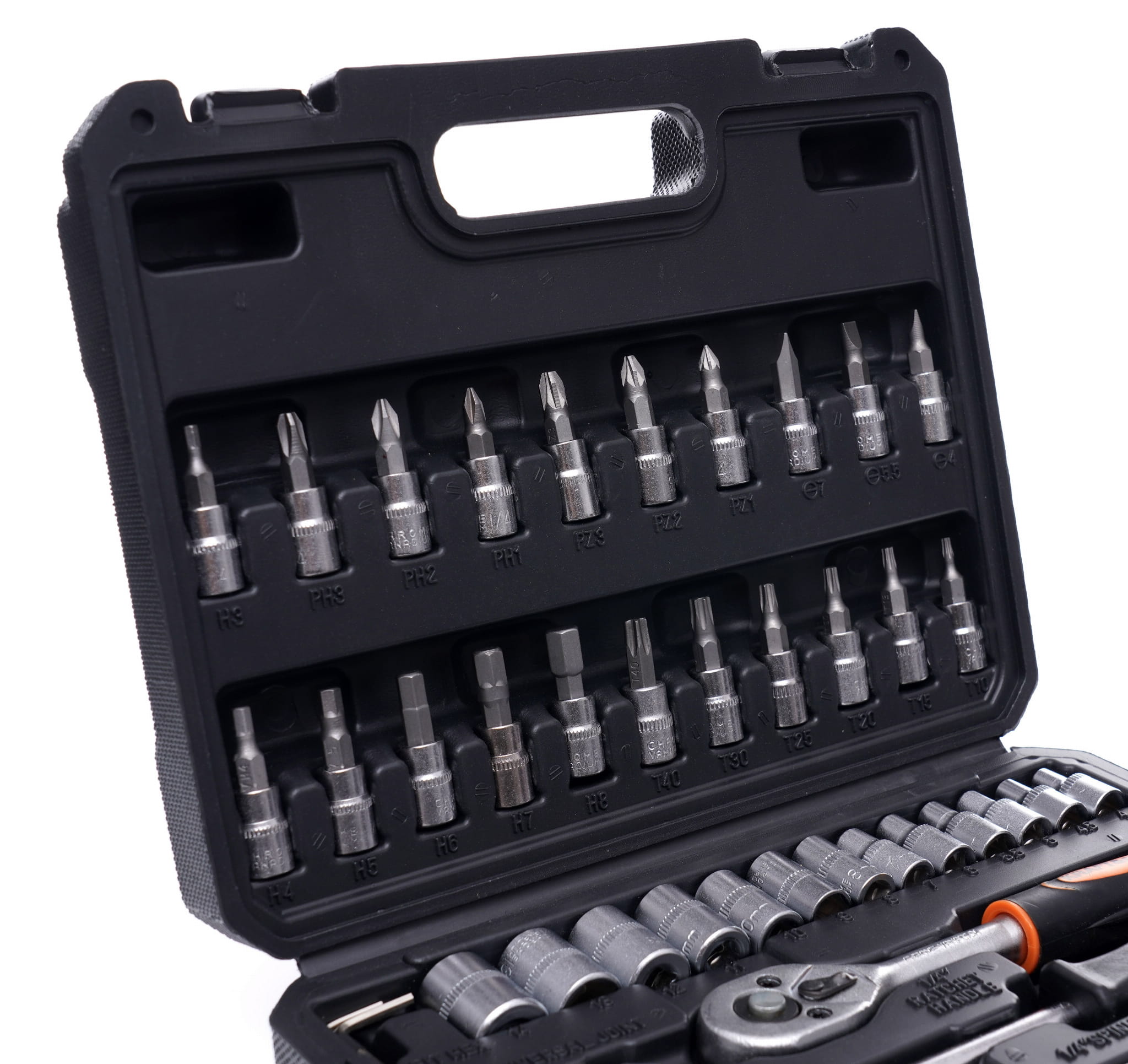 Wszystkie nasadki, przedłużki, pokrętła i przeguby w zestawie pracują w systemie napędu 1/4". Bity wymagają adaptera do końcówek (dołączonego w zestawie), który pośredniczy między uchwytem grzechotki lub pokrętła a standardowym trzpieniem bitu. Przed zakupem należy upewnić się, że posiadane narzędzia napędowe obsługują kwadrat 1/4".