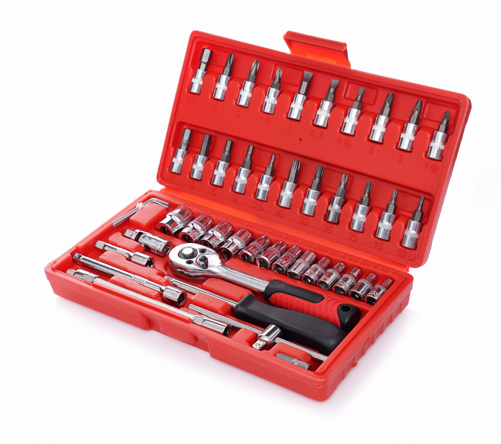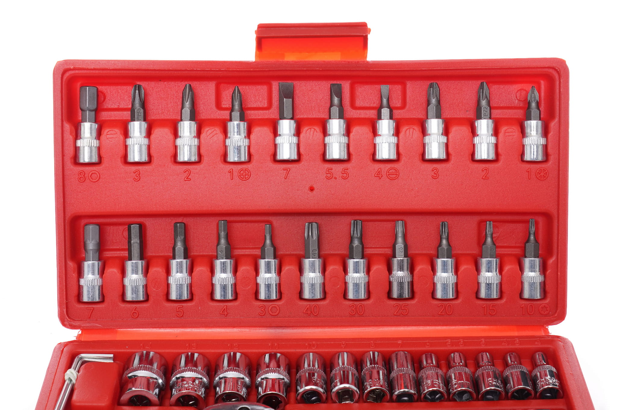 Kompaktowy zestaw kluczy nasadowych z napędem 1/4" wykonanych ze stali chromowo-wanadowej. Obejmuje grzechotkę z mechanizmem 72 zębów, pełny zakres nasadek metrycznych, końcówki wkrętakowe sześciu typów oraz akcesoria montażowe — wszystko posegregowane w sztywnej walizce transportowej.