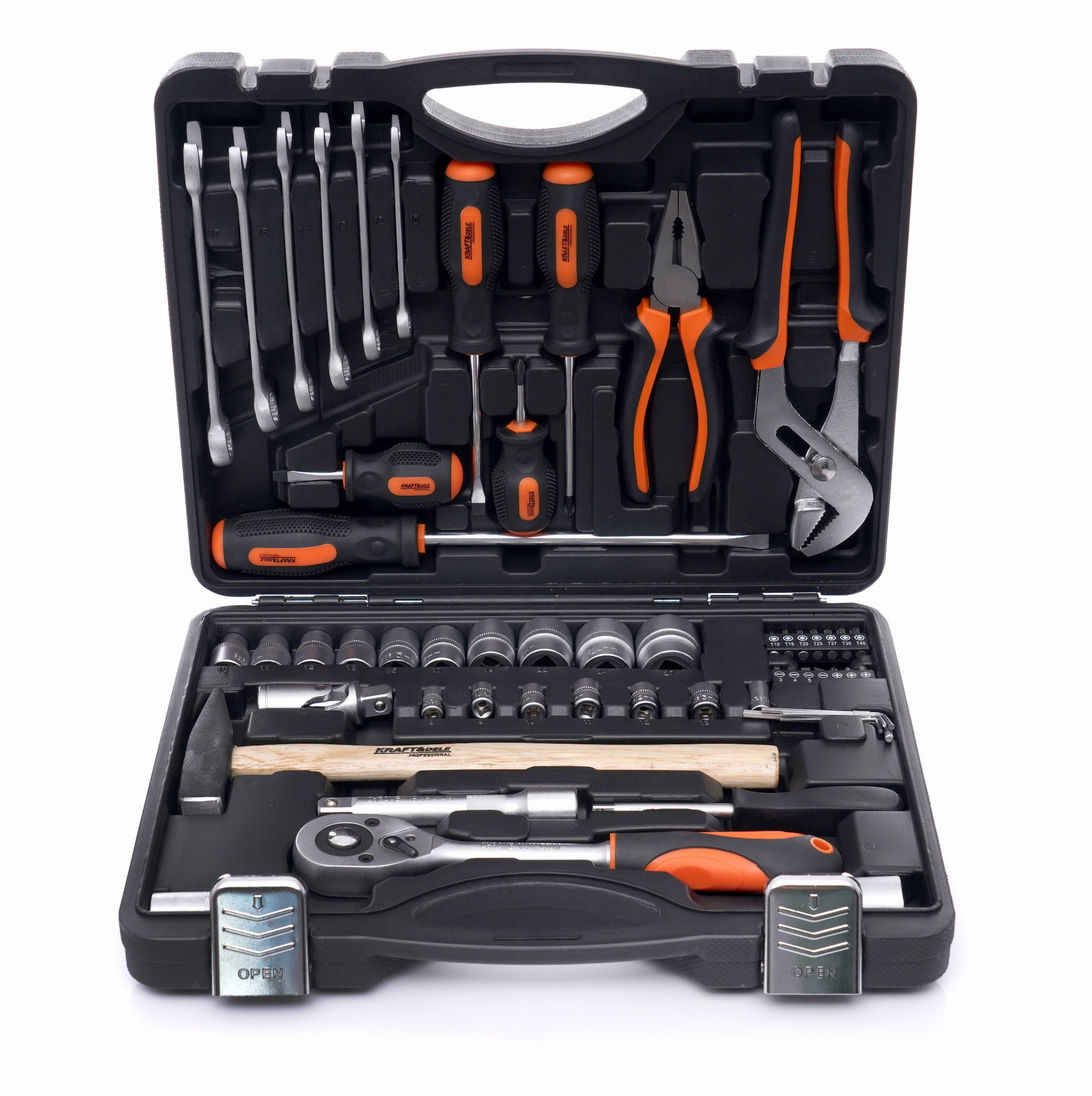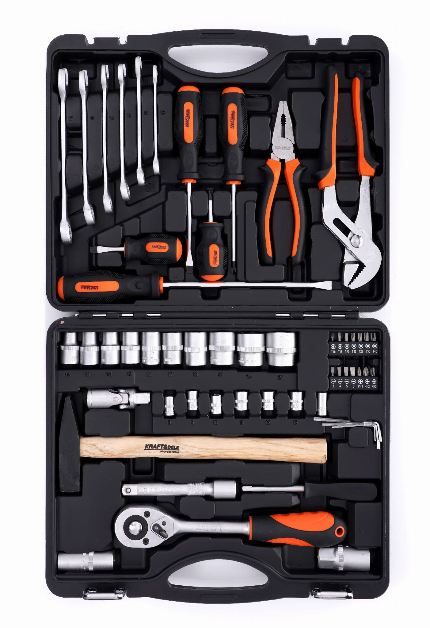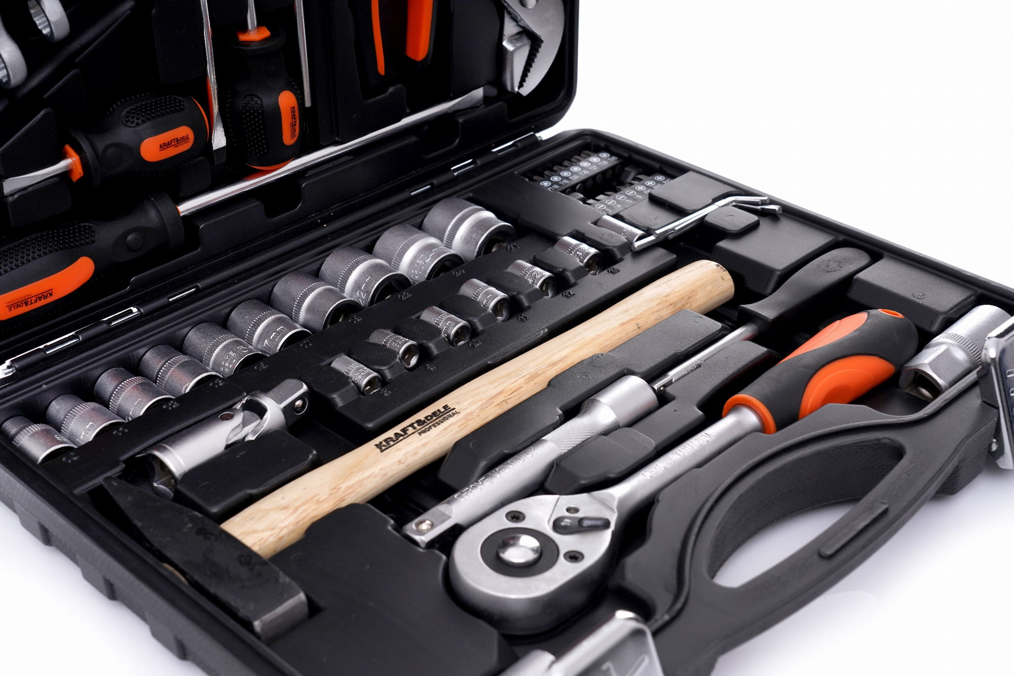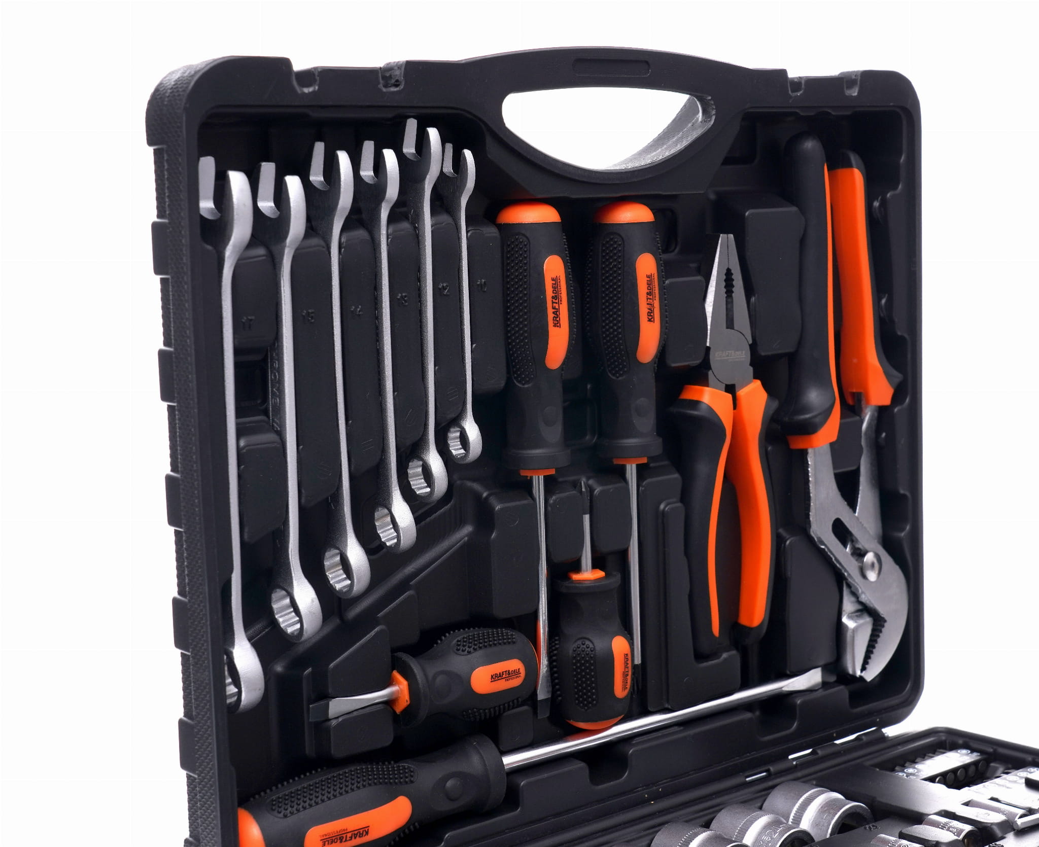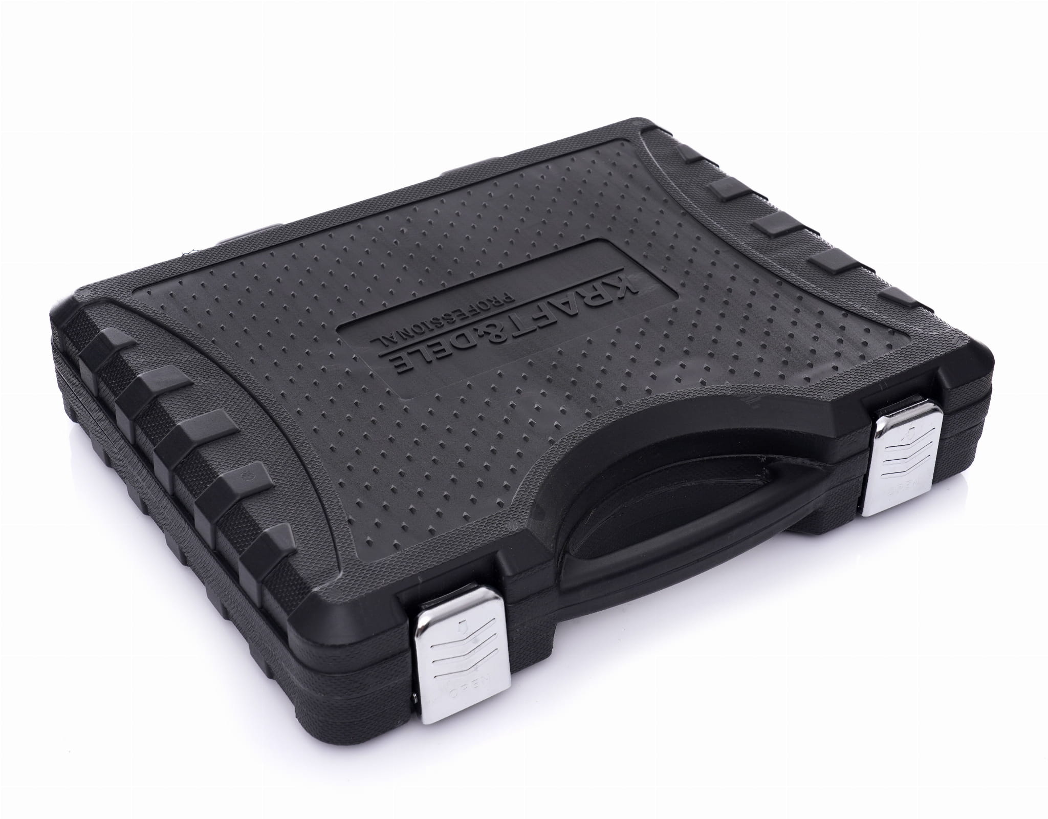 Kompletny zestaw narzędzi warsztatowych w walizce transportowej, obejmujący nasadki 1/4" i 1/2", klucze płasko-oczkowe, grzechotkę, śrubokręty, szczypce oraz bity. Narzędzia wykonane ze stali chromowo-wanadowej (CrV), przeznaczone do prac mechanicznych, samochodowych i remontowo-budowlanych.
