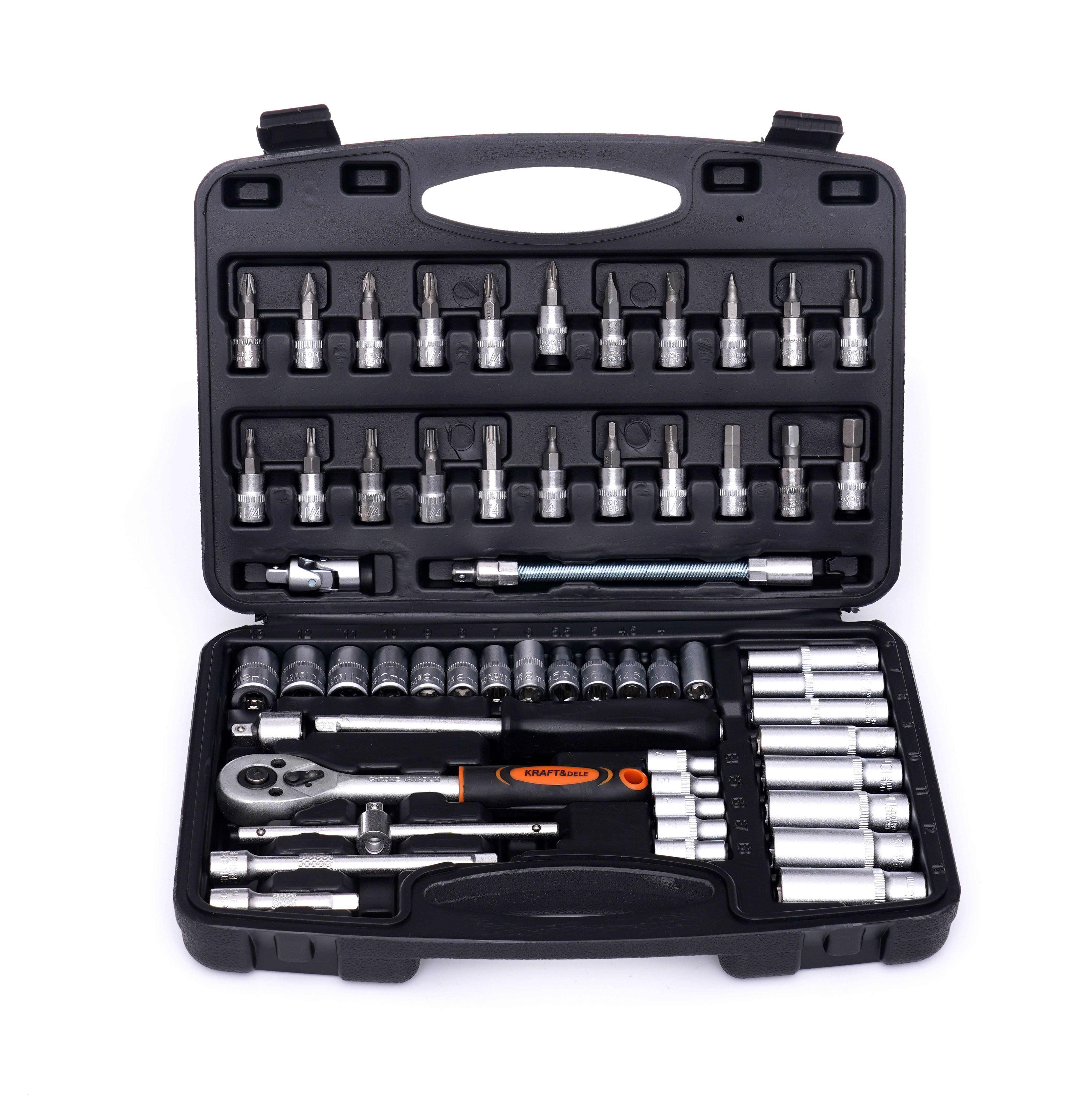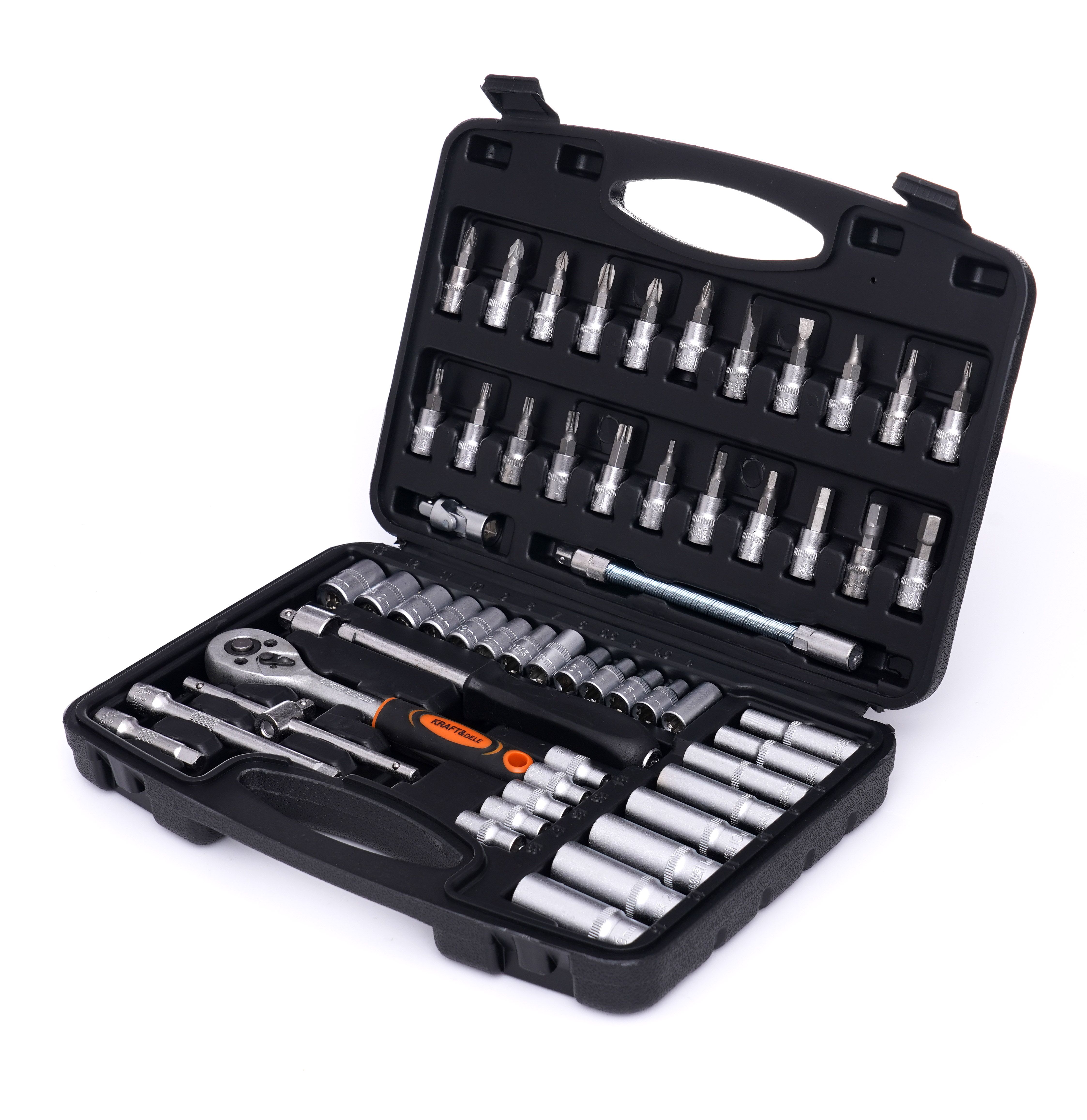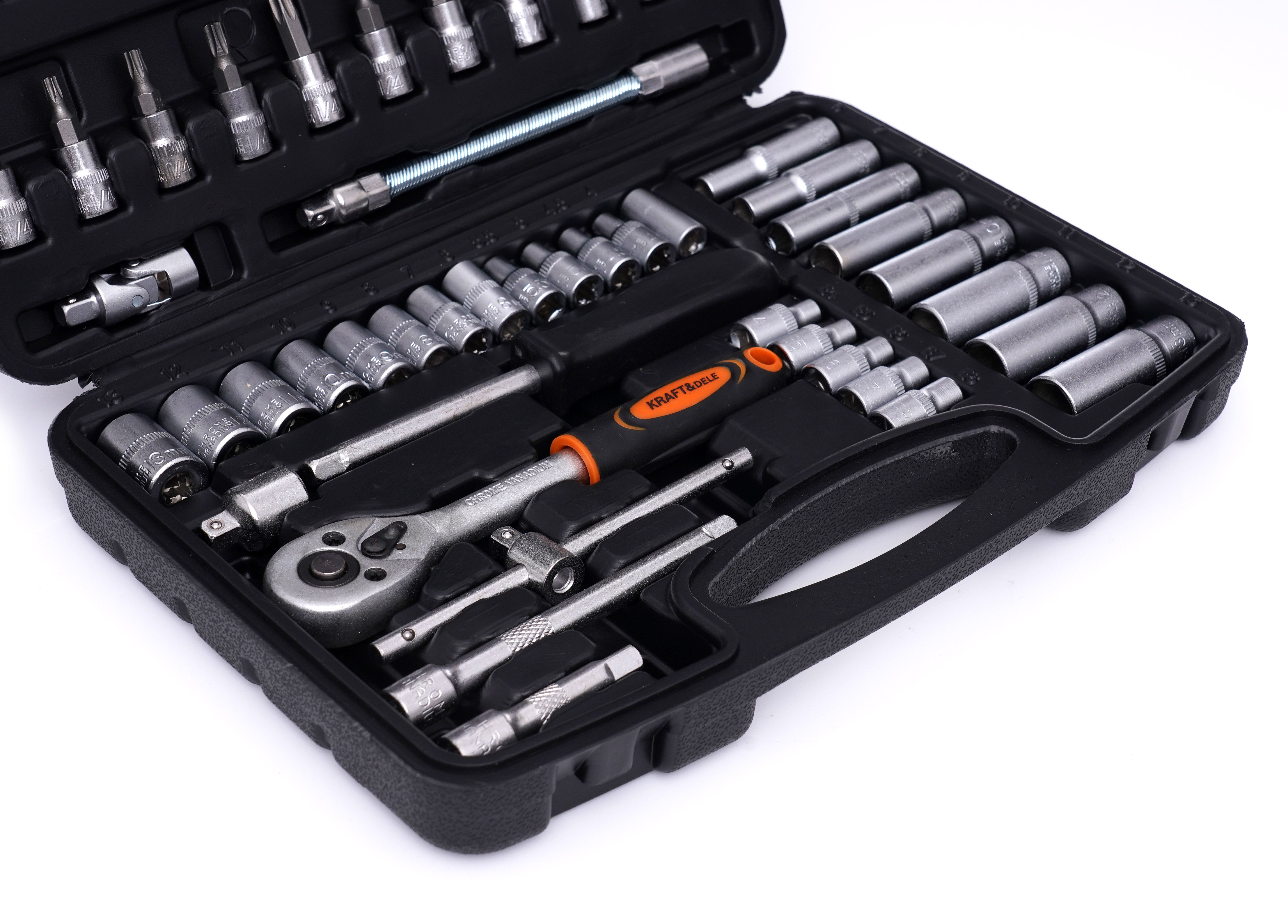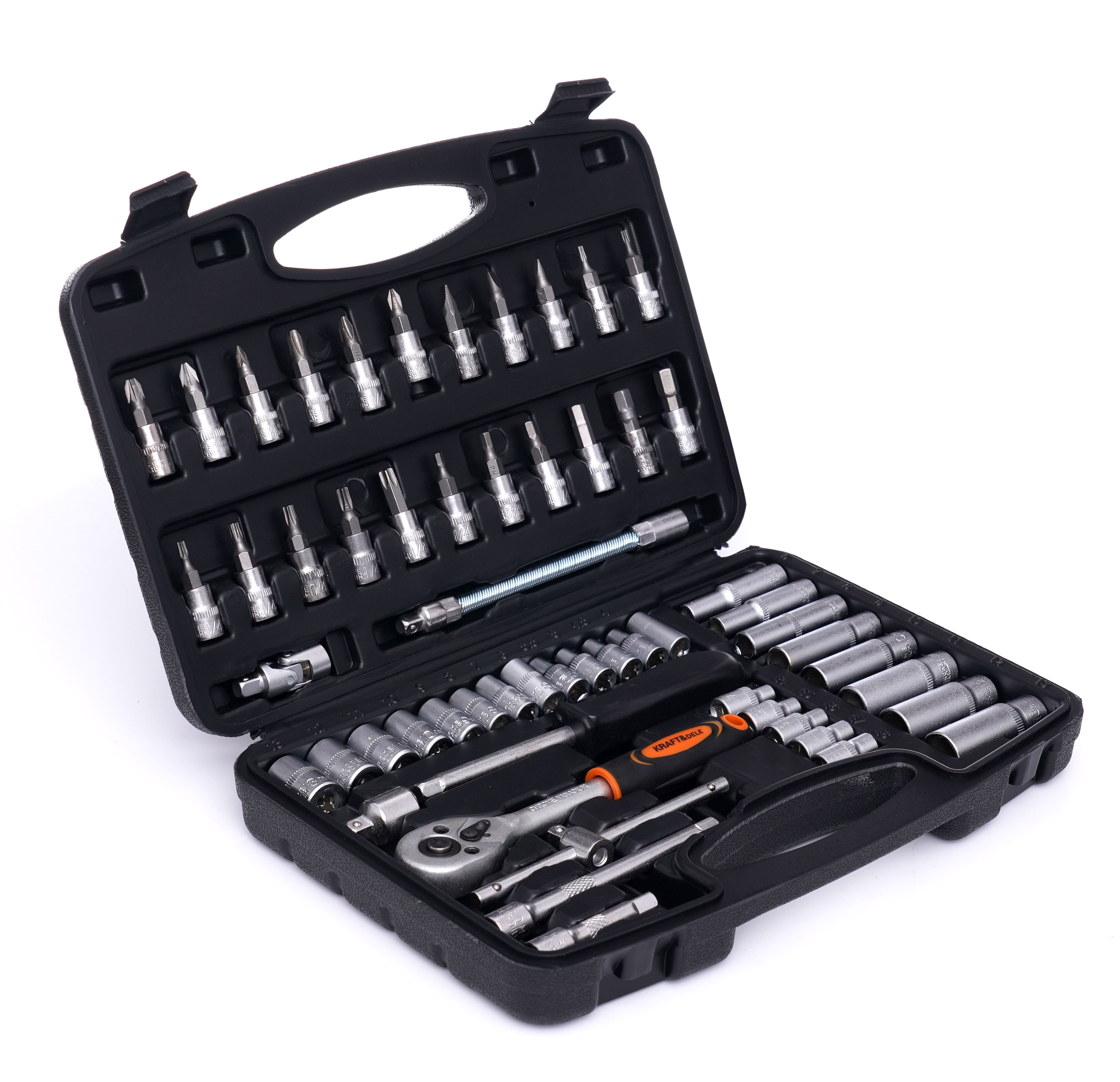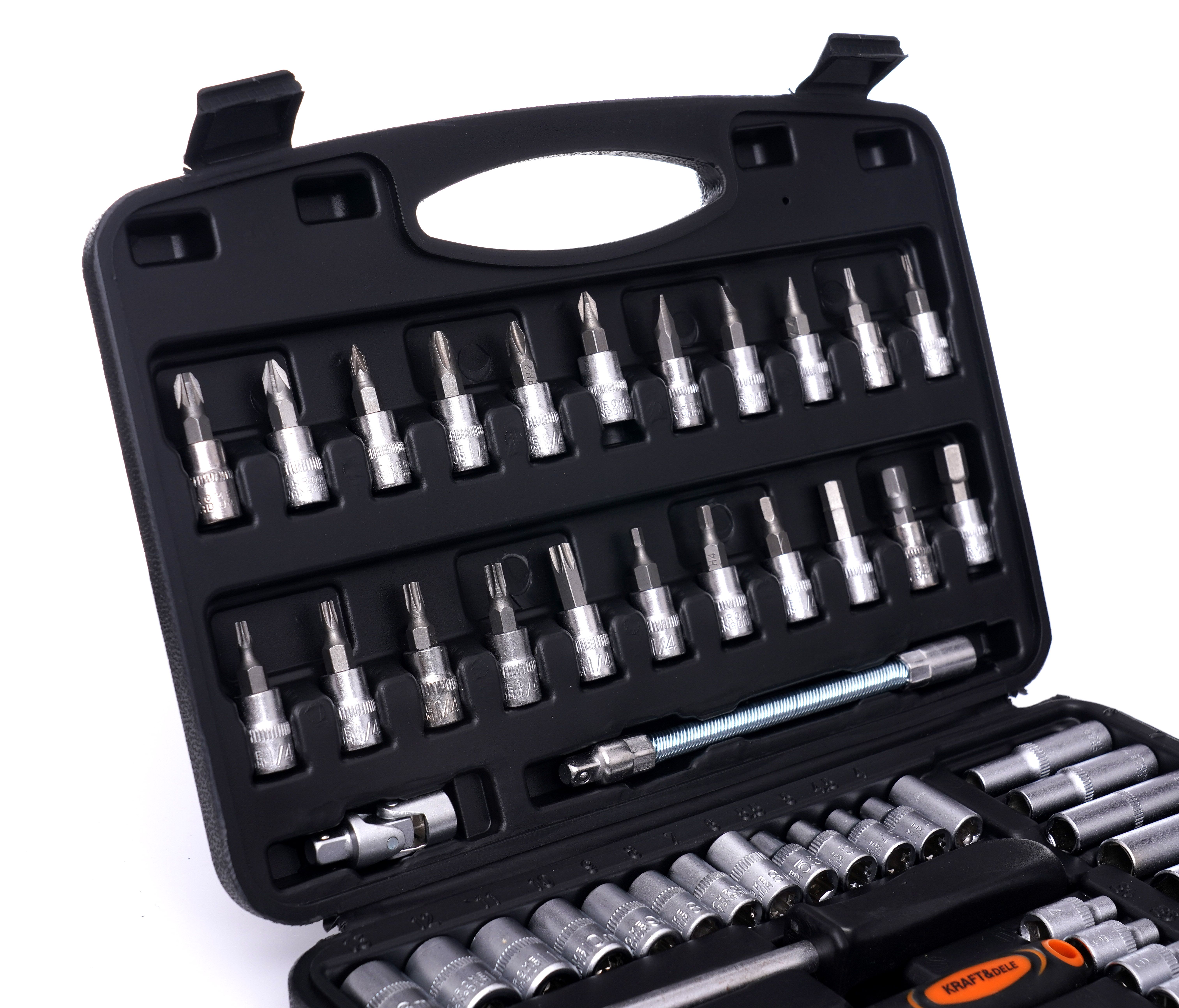 Zestaw narzędzi 56el. KD10834 sprawdzi się wszędzie tam, gdzie potrzebujesz kompaktowego kompletu do typowych połączeń śrubowych. Dzięki walizce łatwo zabierzesz zestaw narzędzi w walizce do garażu, na budowę lub do samochodu.