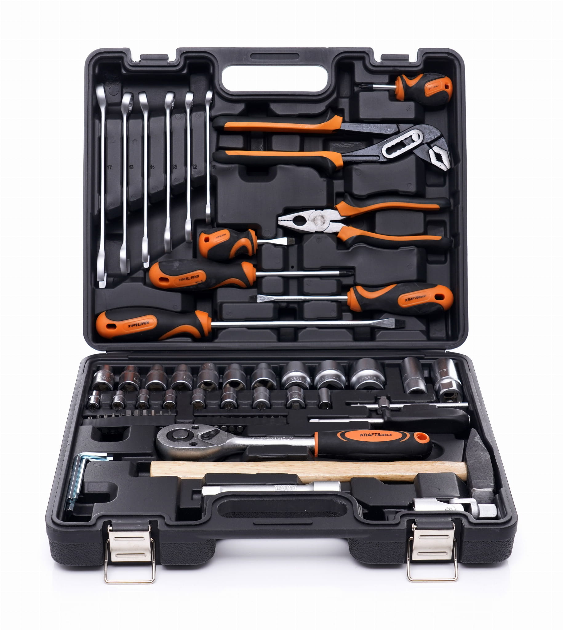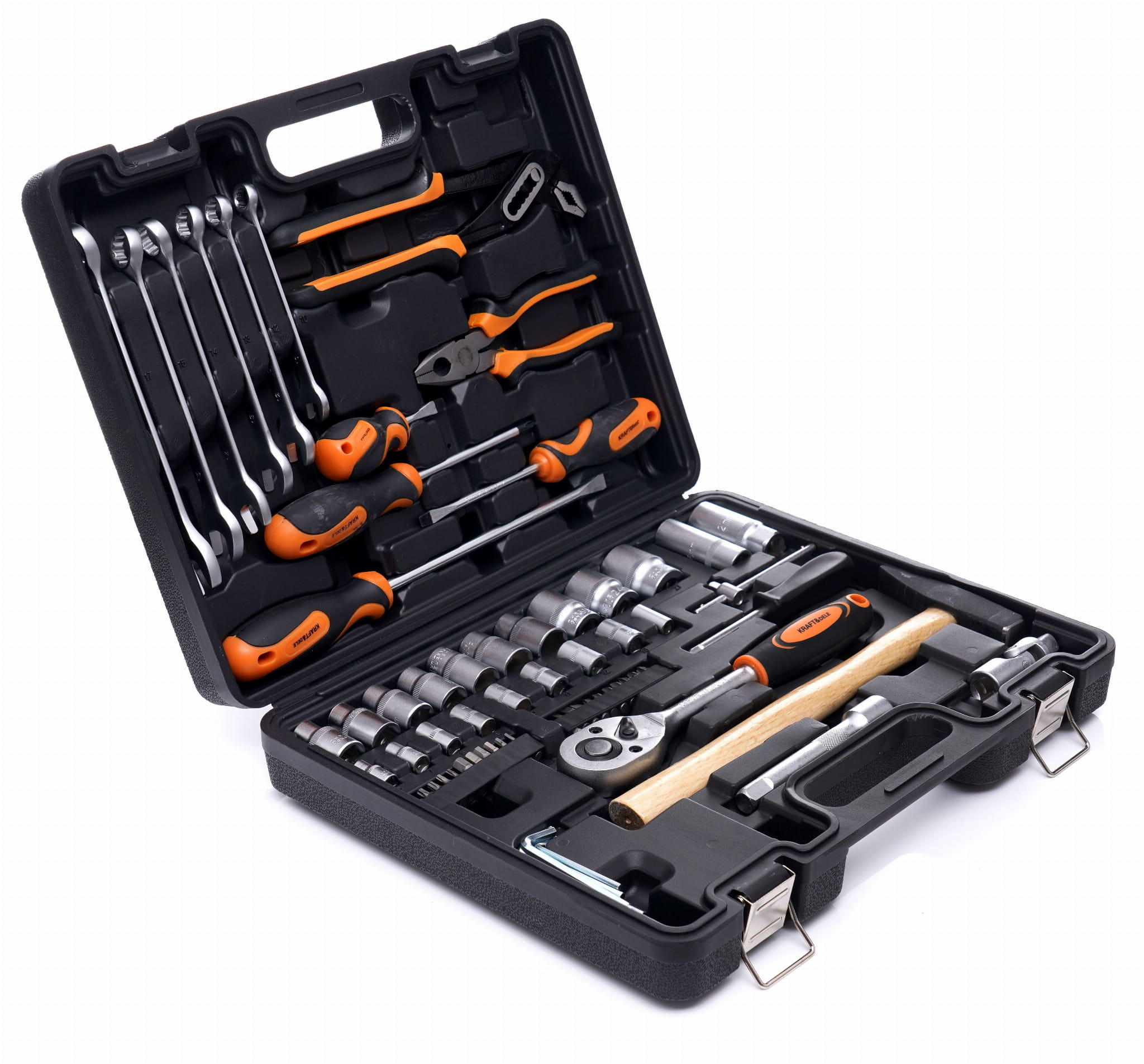 Kompletny zestaw narzędzi warsztatowych wykonanych ze stali chromowo-wanadowej (CrV), obejmujący klucze płasko-oczkowe, grzechotkę z nasadkami 1/2", bity, wkrętaki, szczypce oraz młotek. Całość zapakowana w walizkę z tworzywa sztucznego z wyprofilowanymi gniazdami dla każdego elementu.