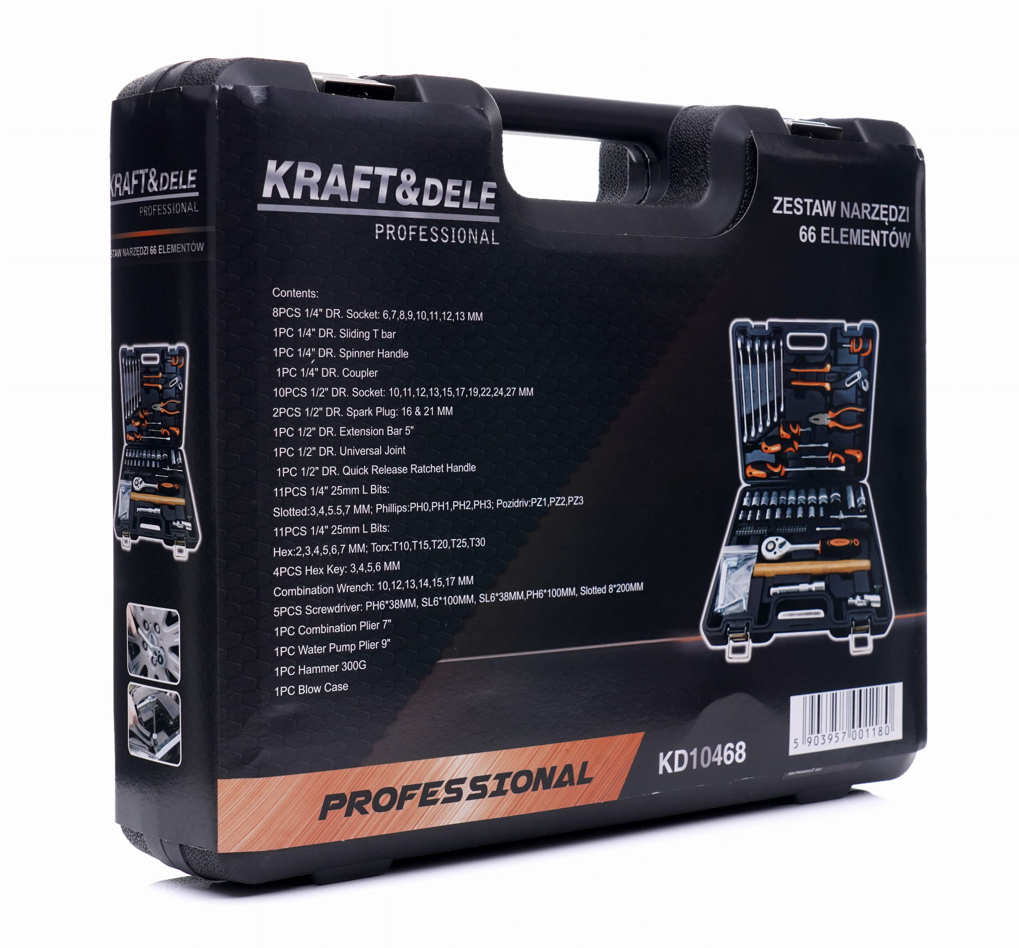 Obudowa z tworzywa sztucznego z wyprofilowanymi gniazdami dla każdego narzędzia umożliwia szybką identyfikację brakującego elementu po powrocie z pracy. Uchwyty i zatrzaski pozwalają na bezpieczny transport zestawu.