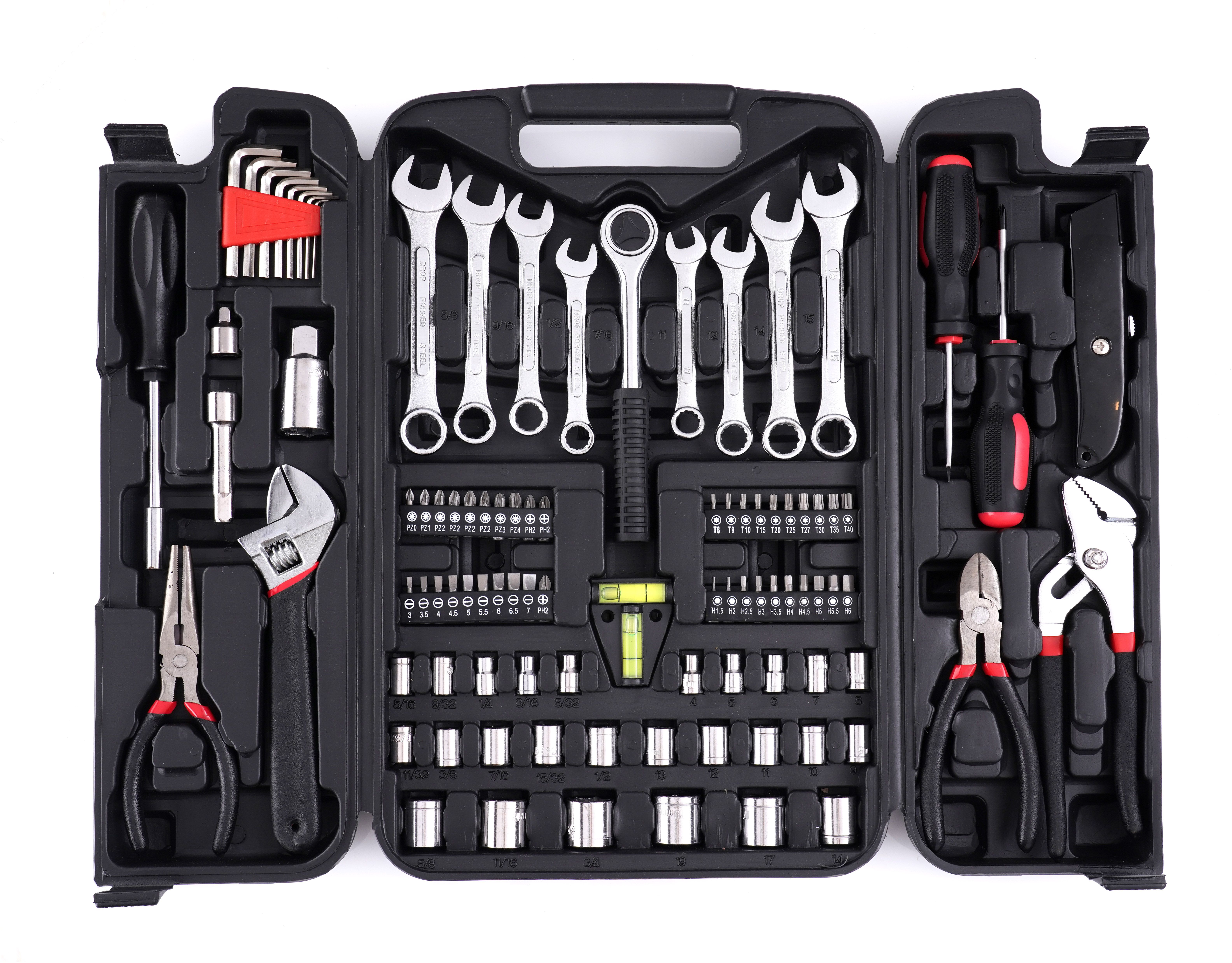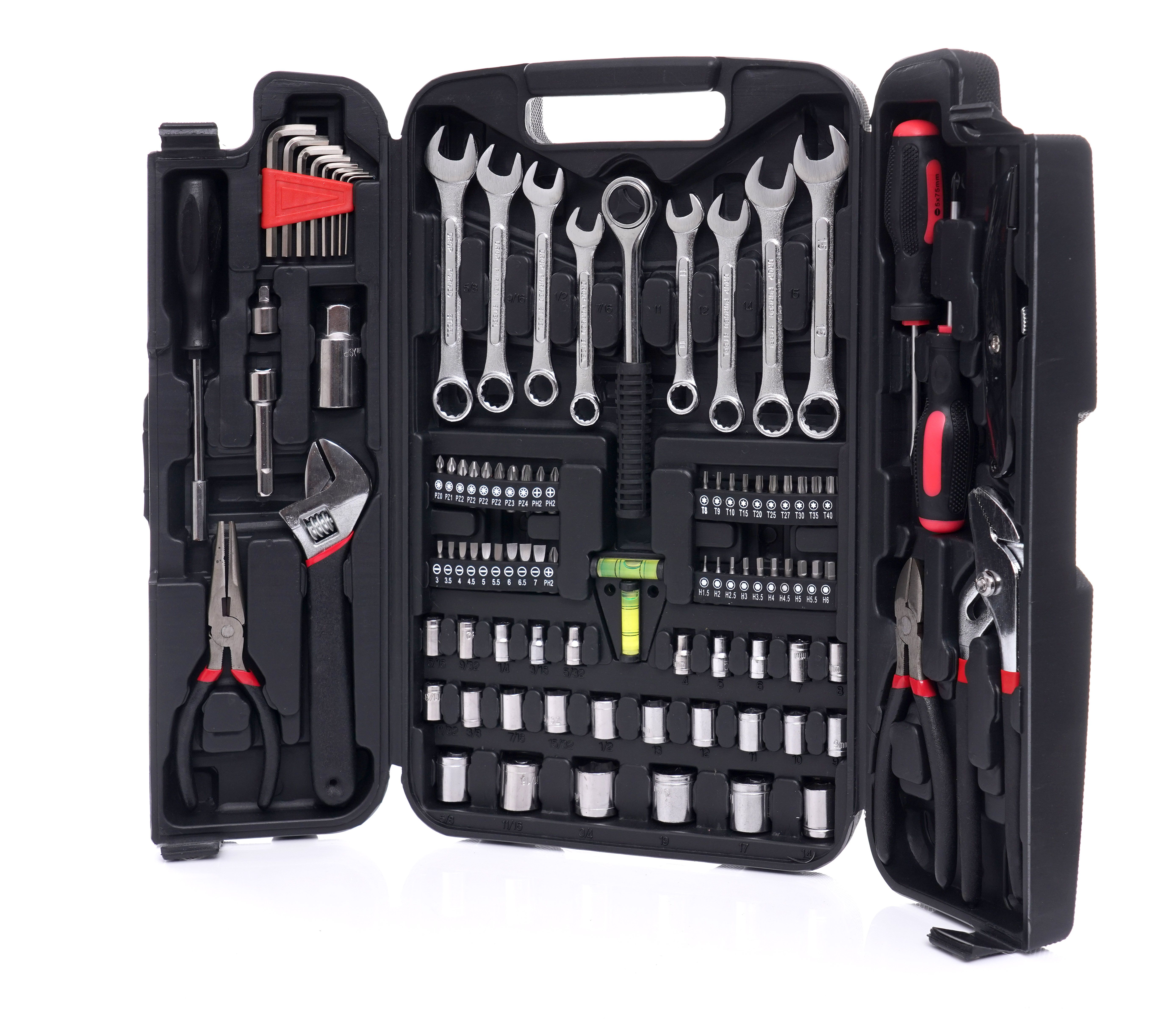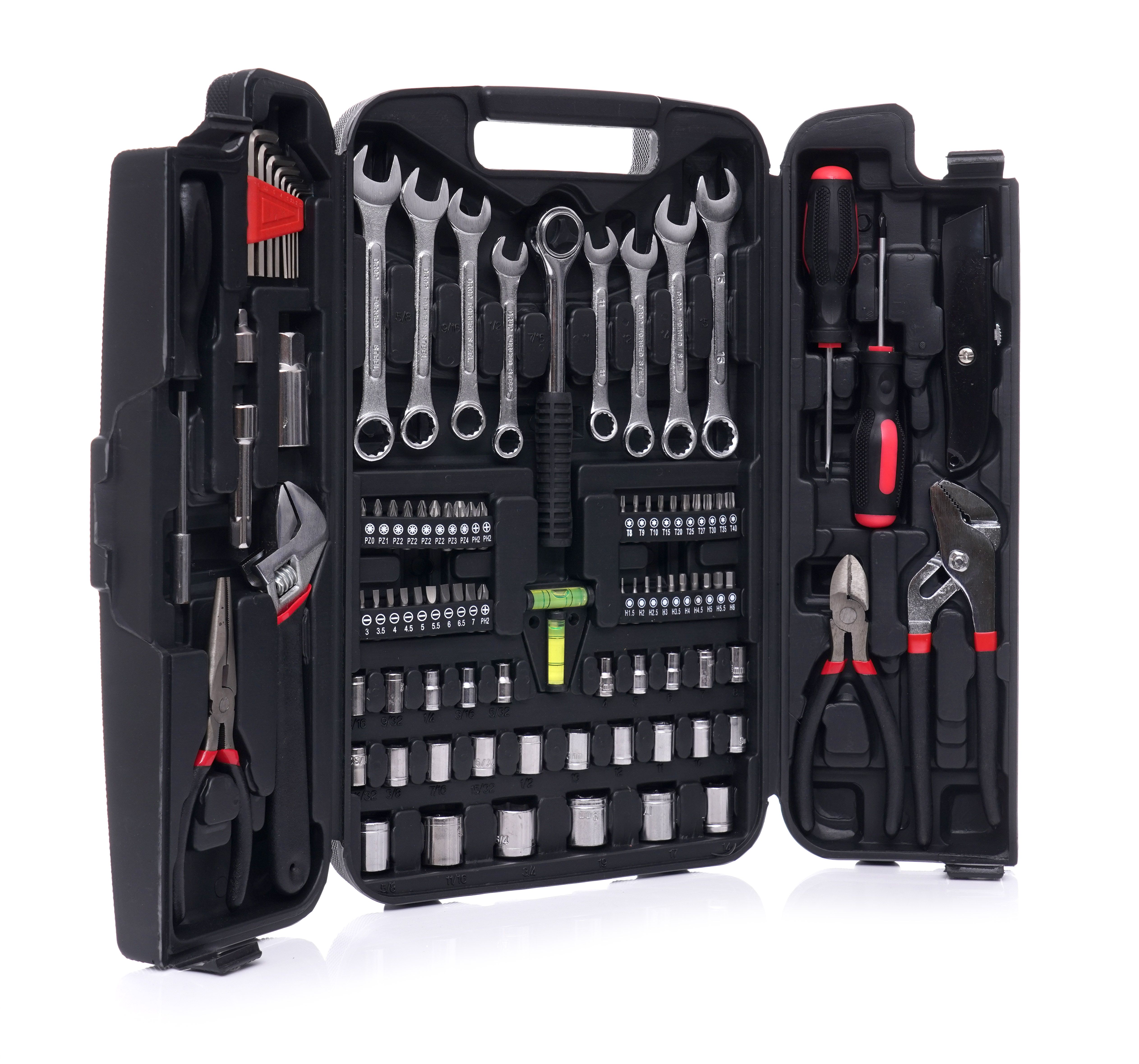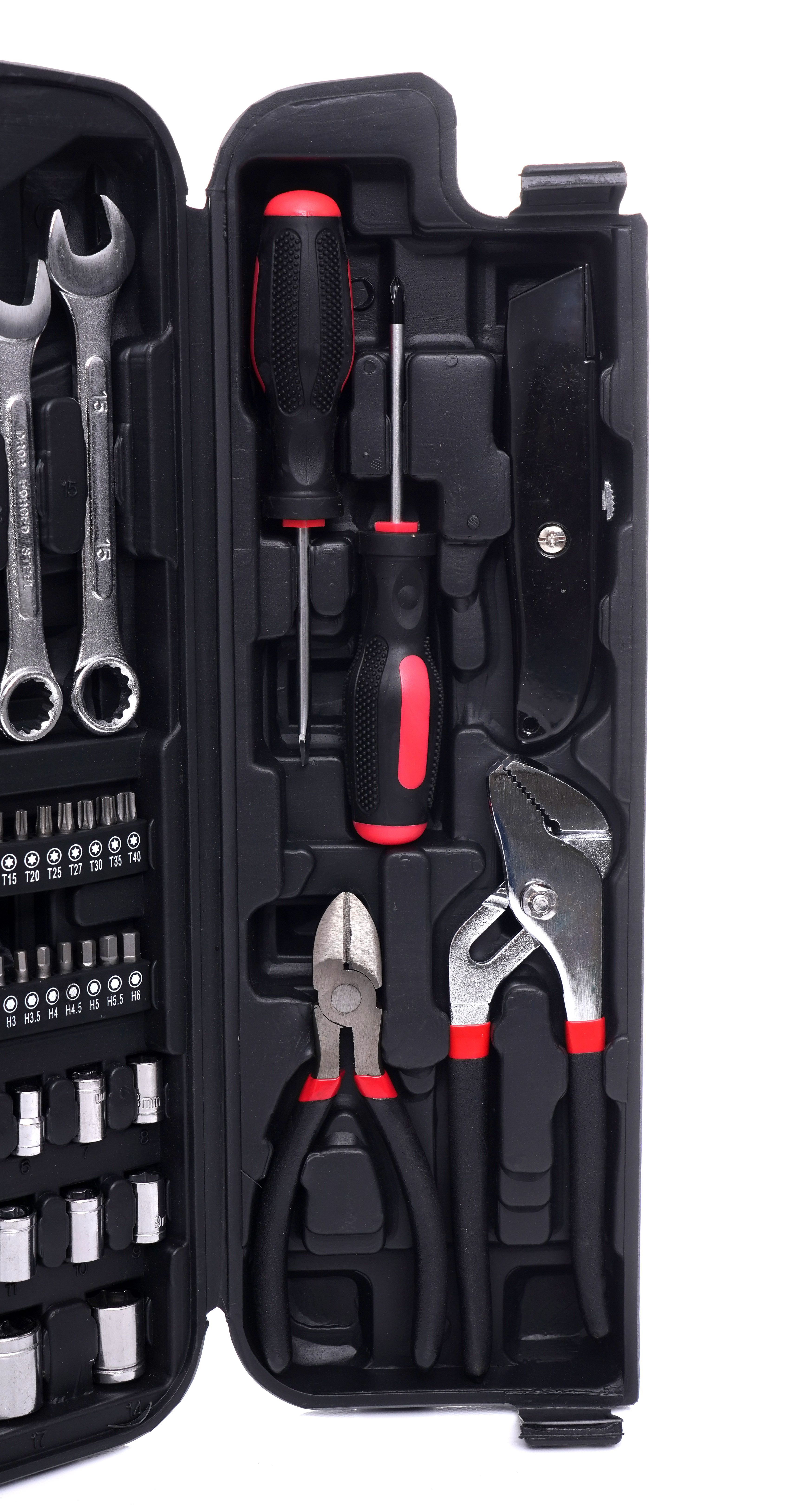 W jednym komplecie otrzymujesz klucze, nasadki, grzechotkę, szczypce i bity, co ułatwia obsługę wielu typowych prac.