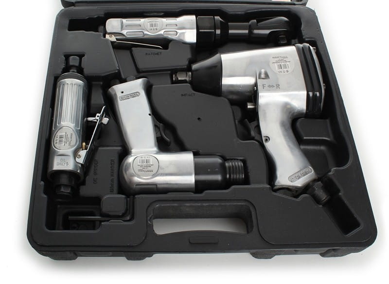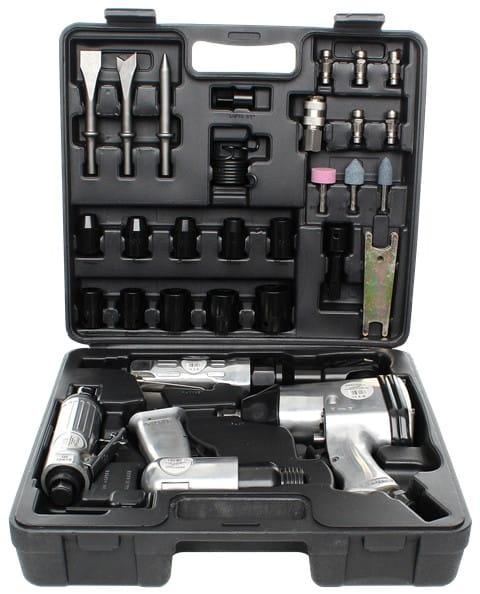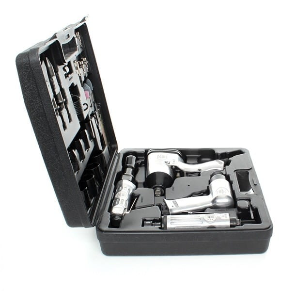 Zestaw łączy narzędzia do skręcania (klucz udarowy, wkrętak), obróbki powierzchni (szlifierka trzpieniowa) i prac udarowych (młotek pneumatyczny), co eliminuje konieczność osobnego kompletowania urządzeń do typowych prac warsztatowych.