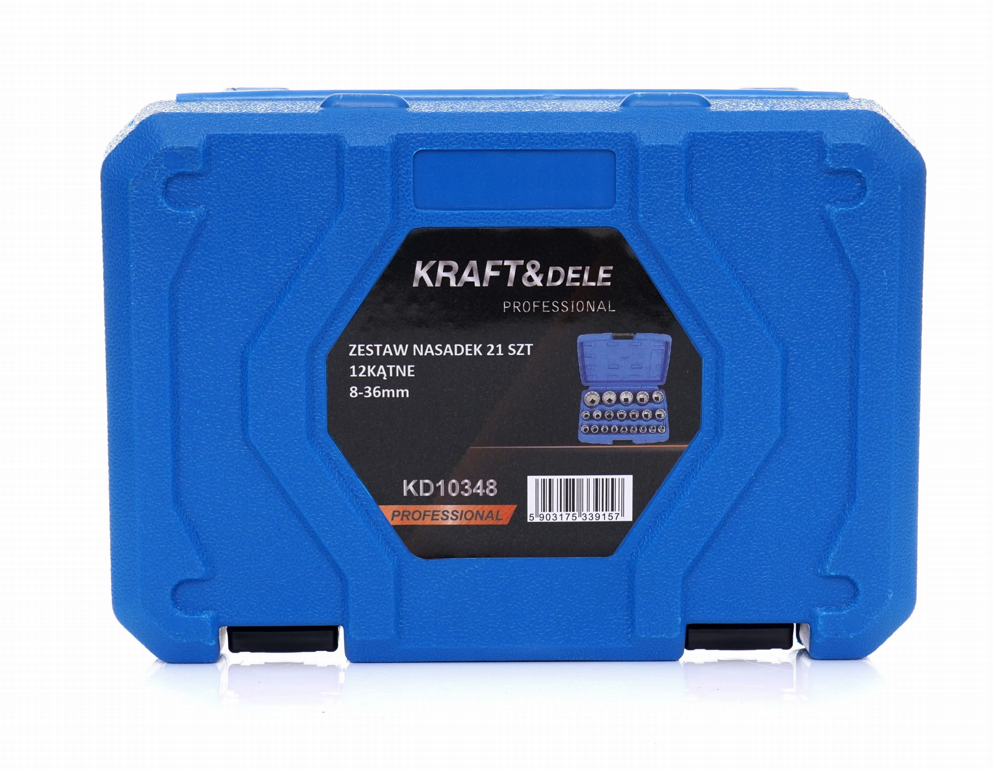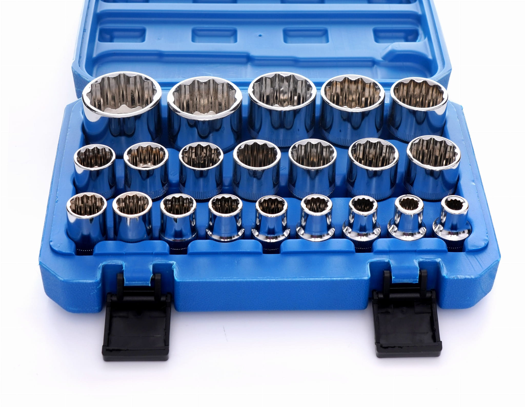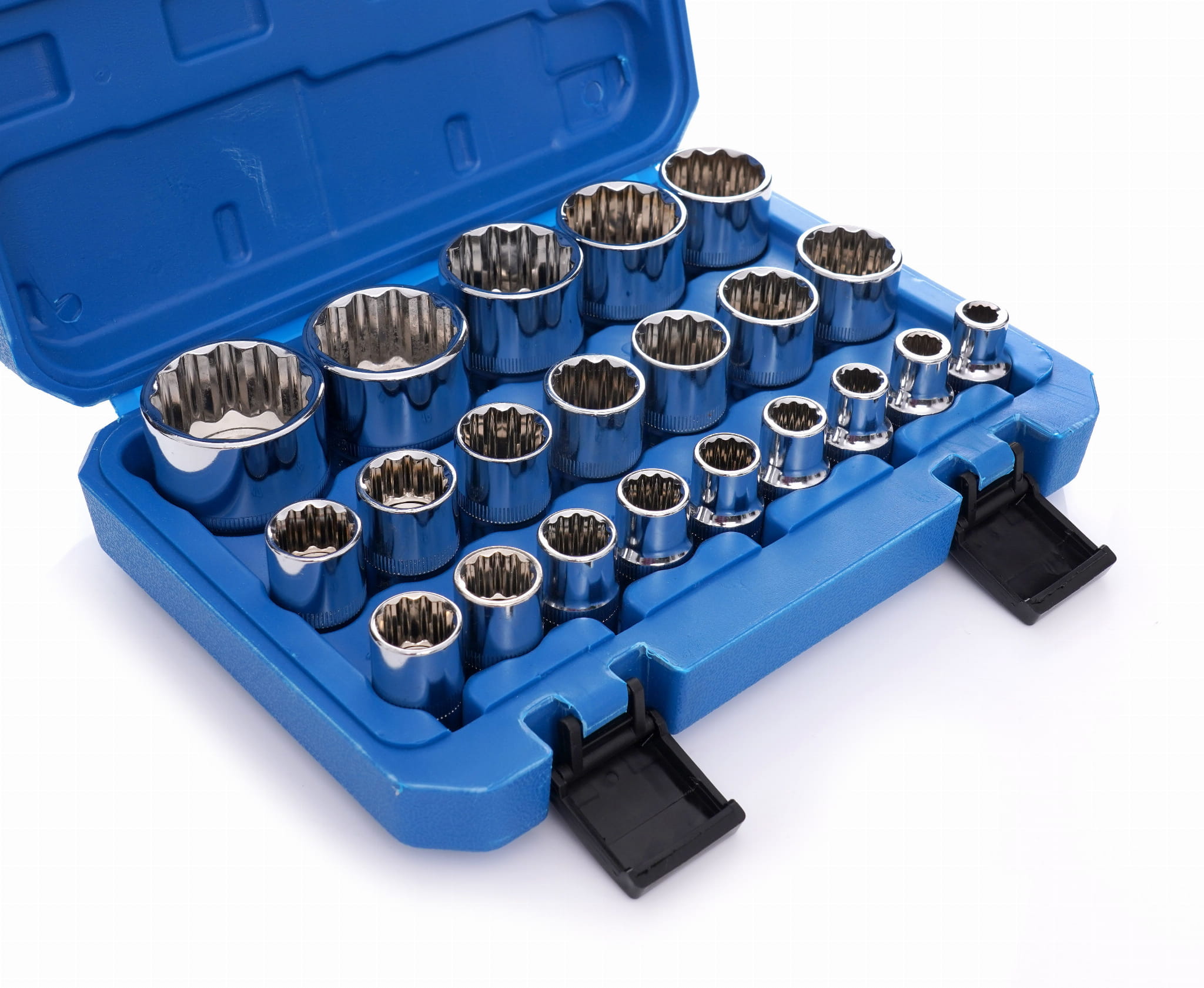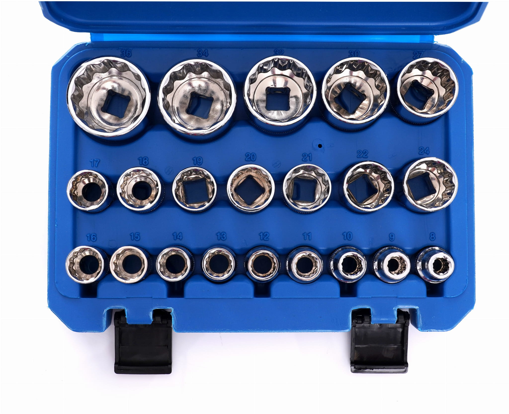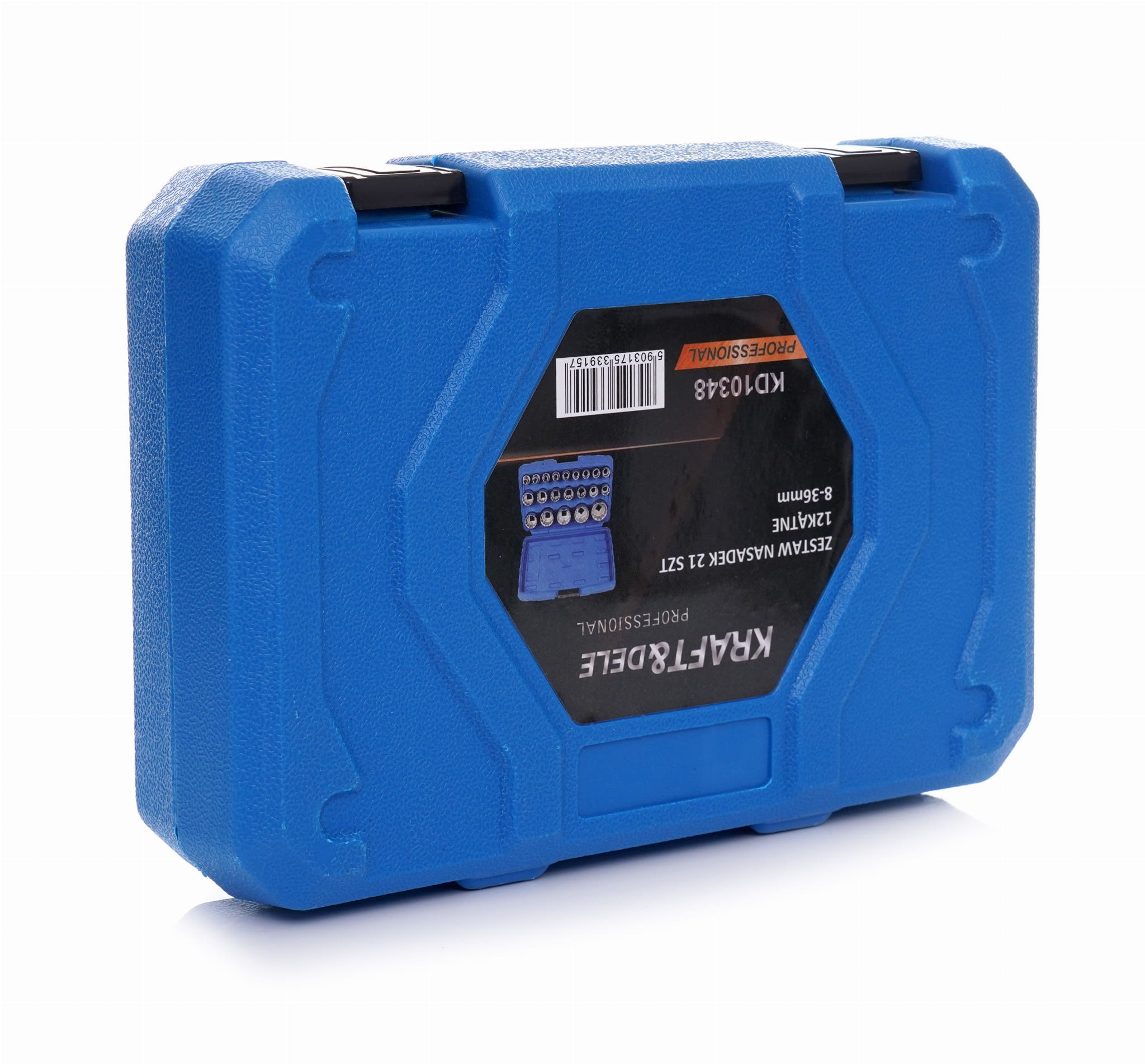 Komplet 21 nasadek 12-kątnych z mocowaniem 1/2" w zakresie rozmiarów od 8 do 36 mm. Zestaw przeznaczony do pracy z łącznikami metrycznymi i calowymi w warunkach warsztatowych i serwisowych. Nasadki wykonano ze stali stopowej chromowo-wanadowej 50BV30, całość dostarczana jest w walizce transportowej.