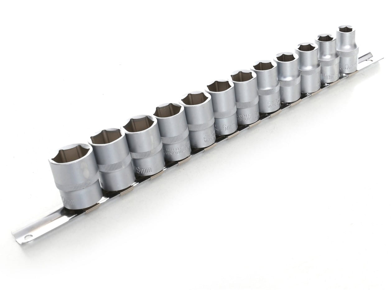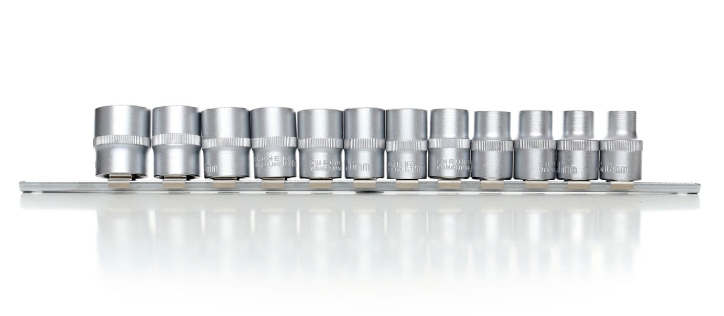 Komplet 12 nasadek sześciokątnych z napędem 1/2" wykonanych ze stali chromowo-wanadowej, obejmujący zakres rozmiarów od 10 do 22 mm. Zestaw przeznaczony do prac montażowych, naprawczych i serwisowych przy pojazdach oraz maszynach.