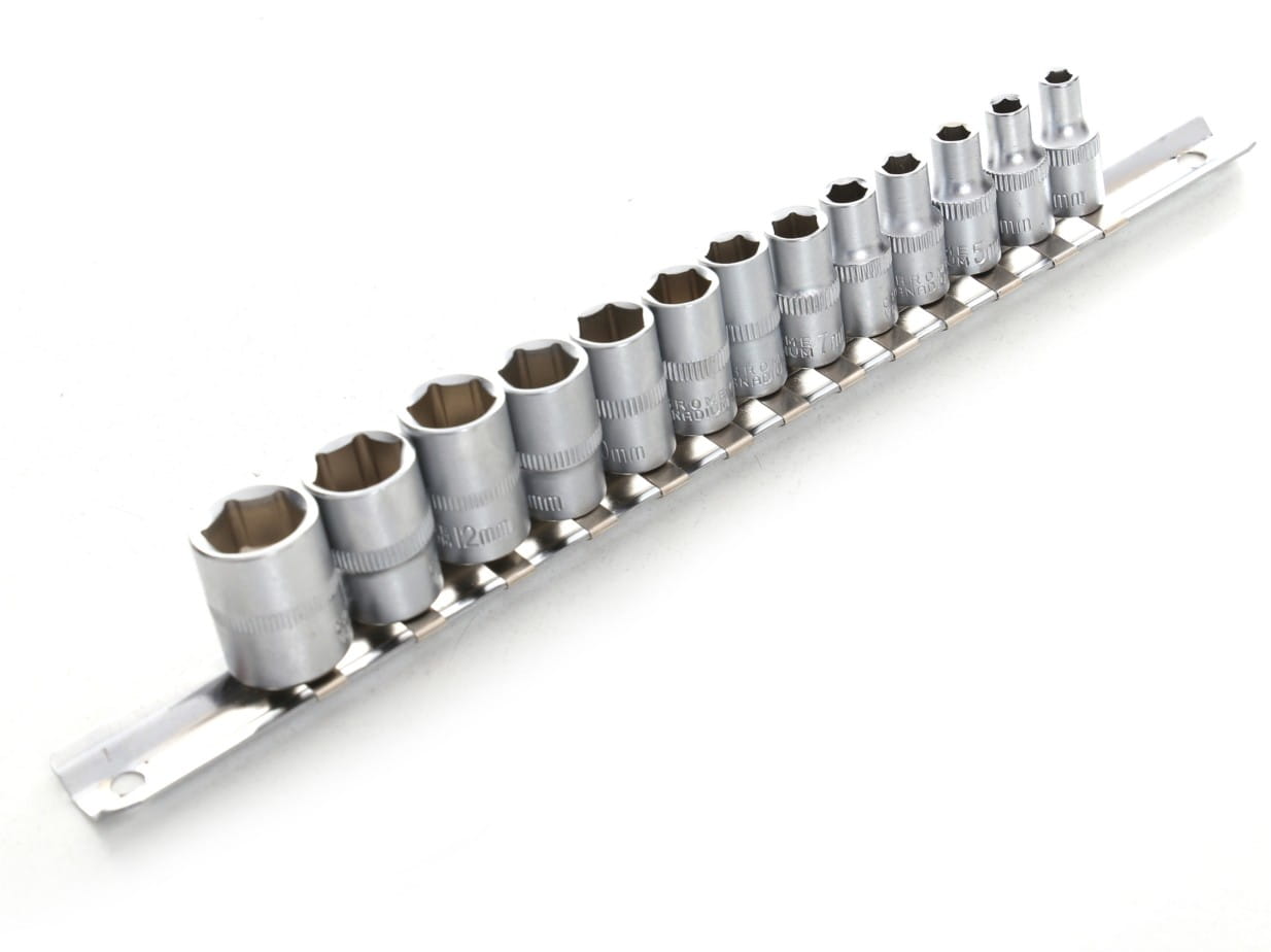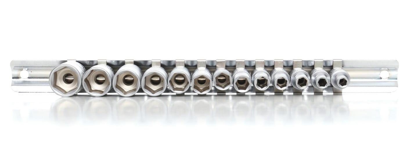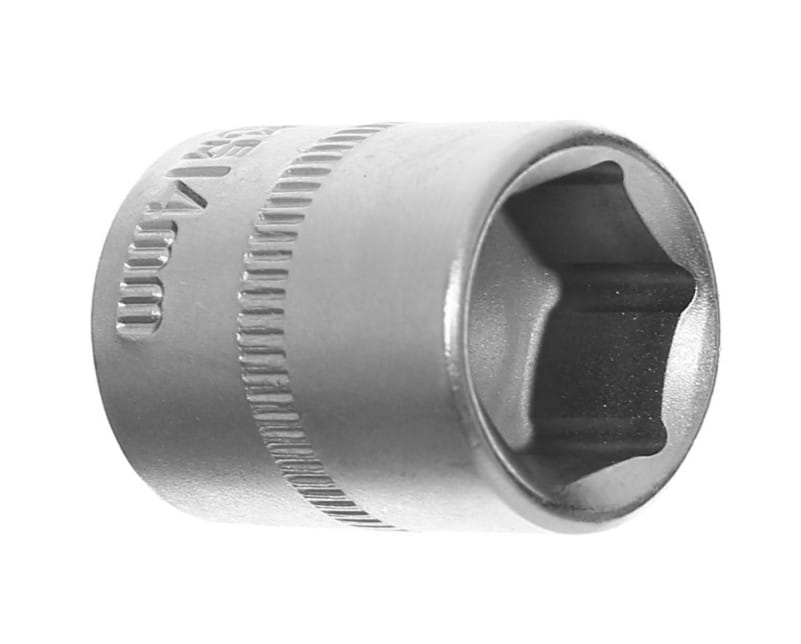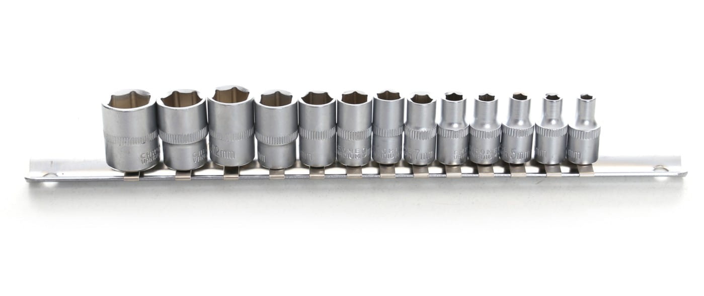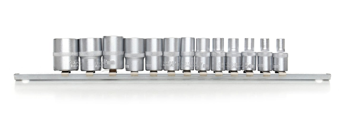 Komplet 13 nasadek sześciokątnych z chwytem 1/4" w zakresie rozmiarów 4–14 mm, wykonanych ze stali chromowo-wanadowej. Zestaw przeznaczony do prac przy złączach śrubowych w miejscach o ograniczonej dostępności, gdzie standardowe narzędzia o większym chwycie są trudne w użyciu.