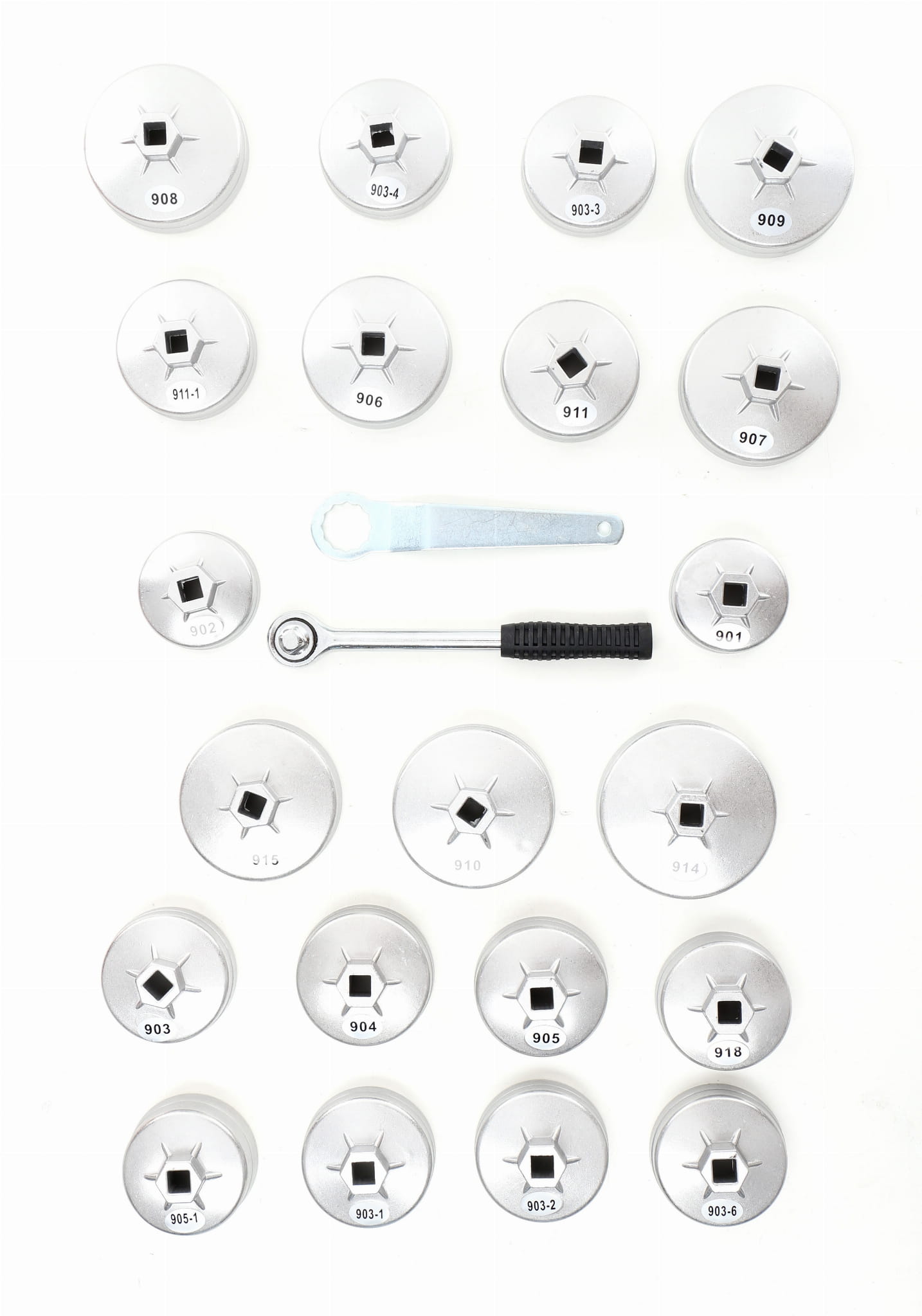 Zestaw 21 nasadek o różnych rozmiarach obejmuje filtry oleju stosowane w samochodach osobowych produkowanych na rynkach europejskim, amerykańskim i azjatyckim. Dzięki temu jeden zestaw wystarcza do obsługi pojazdów wielu marek bez konieczności dobierania nasadek osobno.