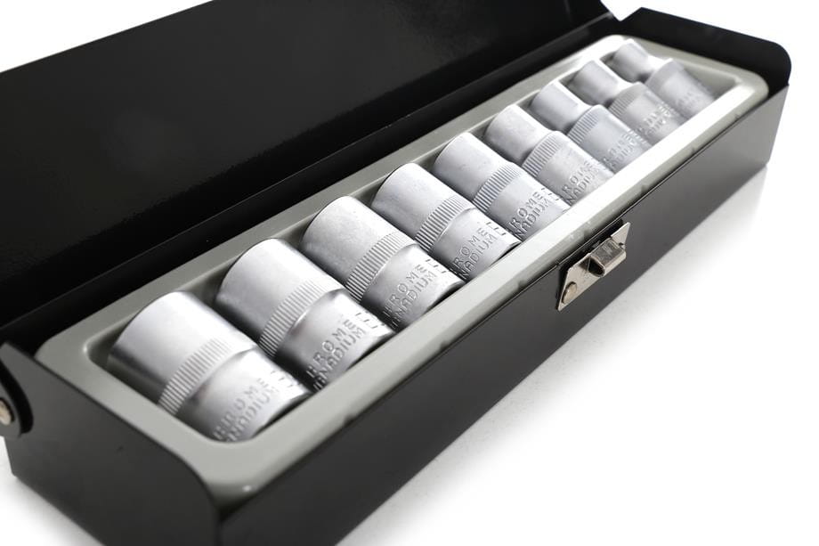 Walizka chroni nasadki przed mechanicznymi uszkodzeniami i zanieczyszczeniami. Stałe miejsca dla każdego rozmiaru ułatwiają szybką identyfikację potrzebnej nasadki i kontrolę kompletności zestawu po zakończeniu pracy.