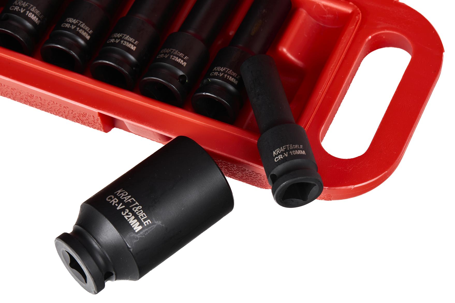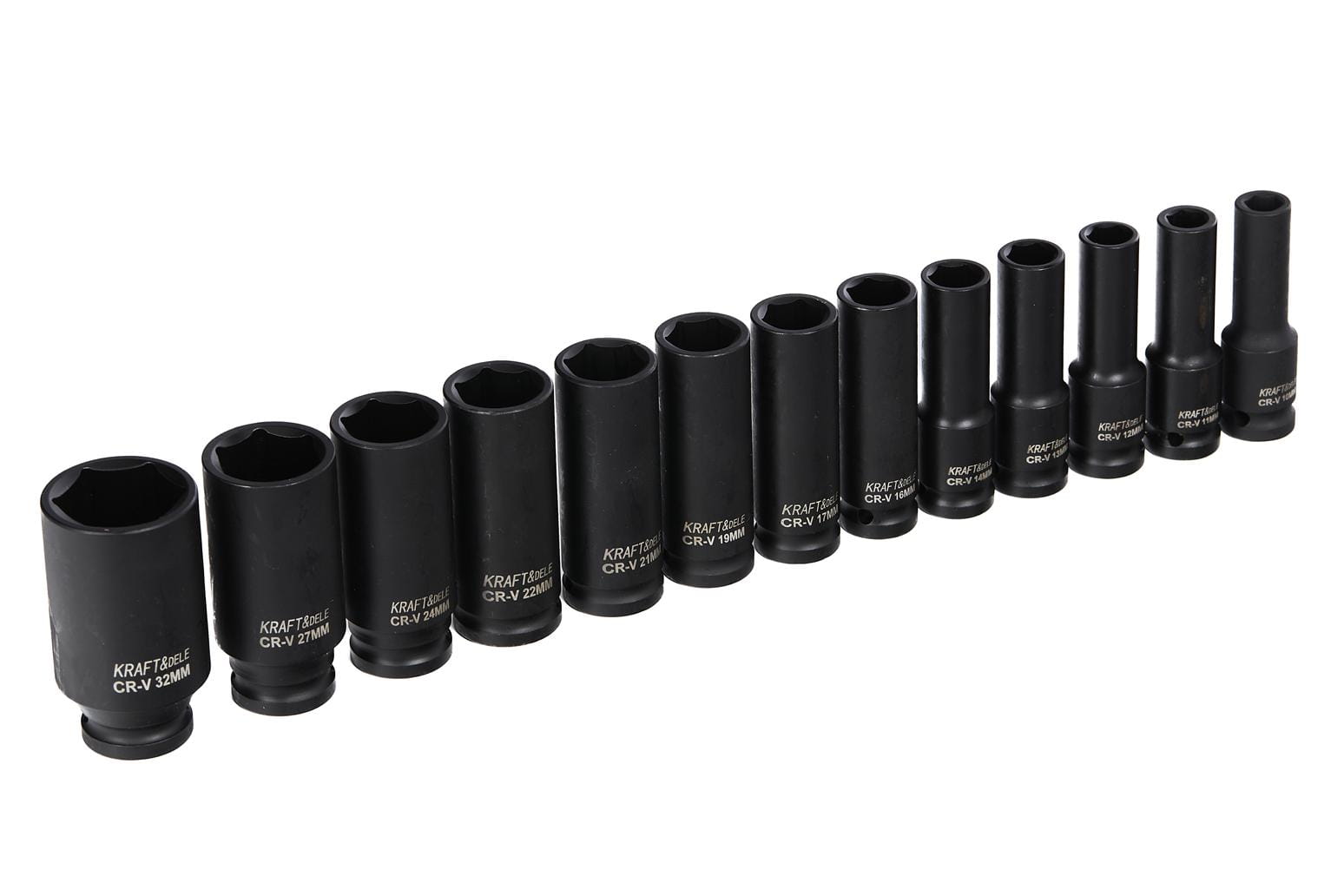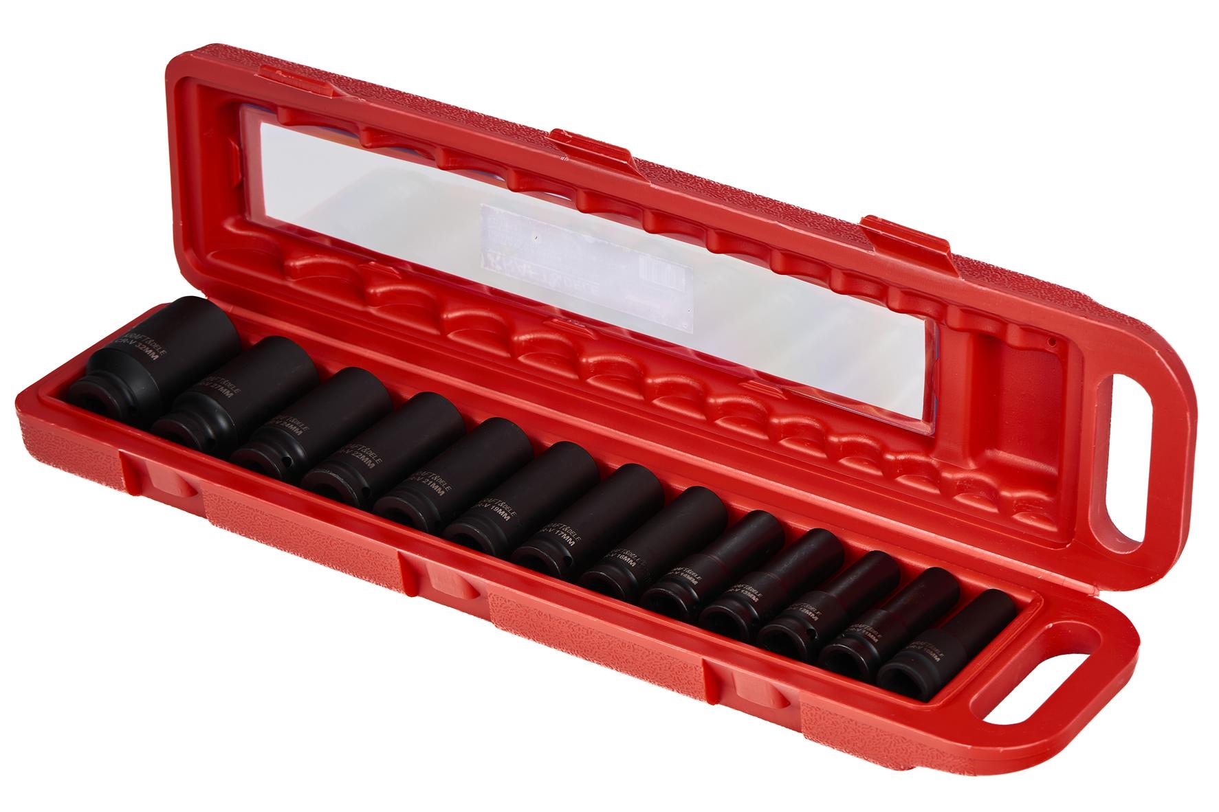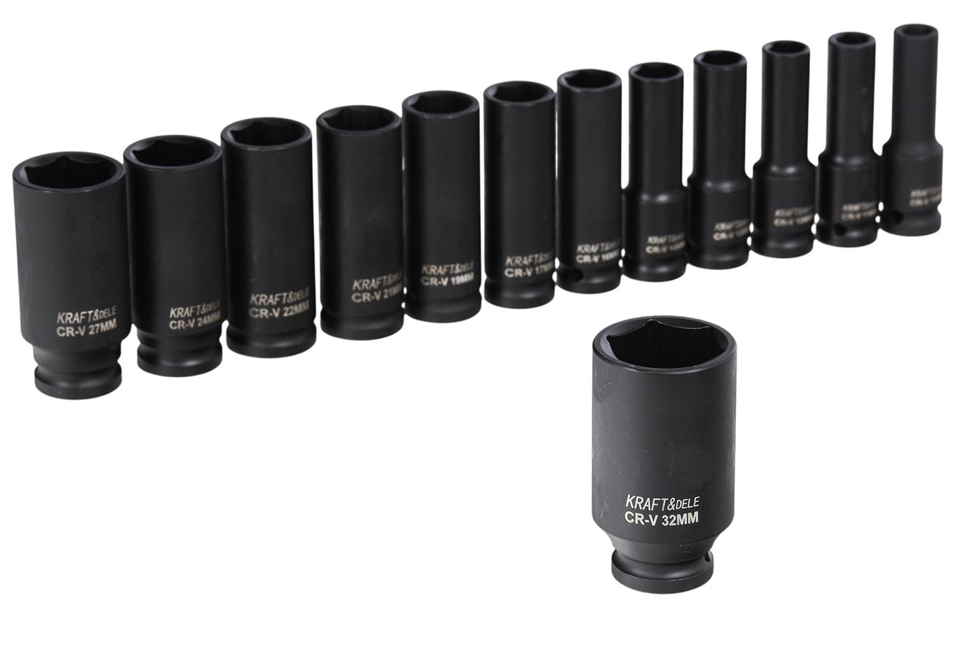 Komplet 13 nasadek udarowych 6-kątnych z gniazdem 1/2", obejmujący rozmiary od 10 do 30 mm. Nasadki przeznaczone do współpracy z kluczami udarowymi pneumatycznymi i elektrycznymi oraz grzechotkami 1/2" — zarówno w warunkach serwisowych, jak i warsztatowych.