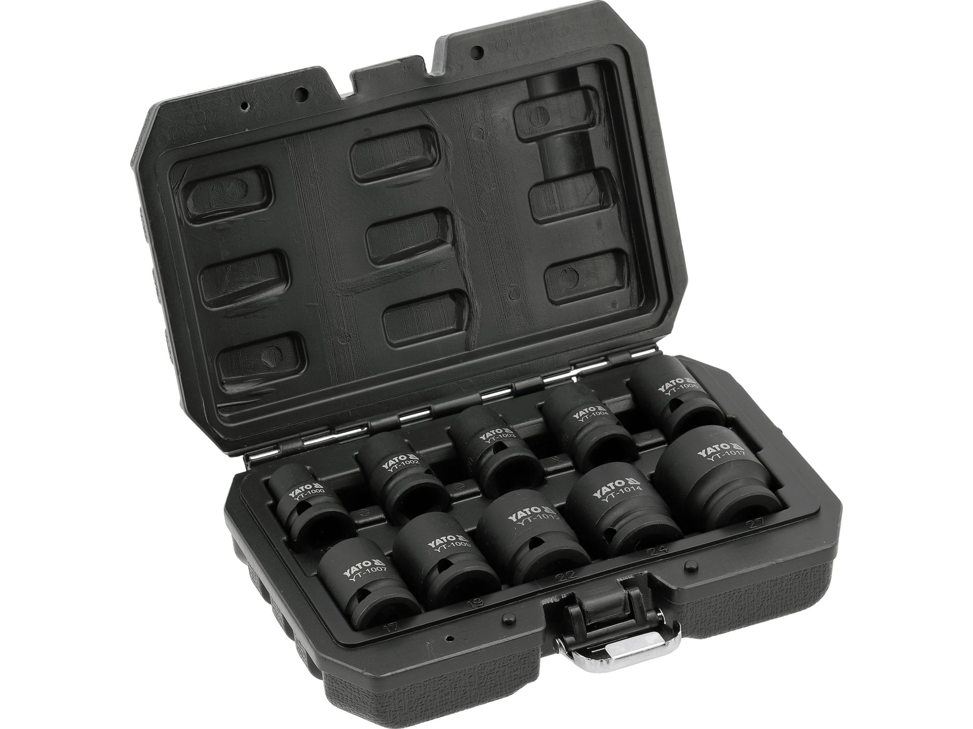 Profesjonalny zestaw 10 nasadek udarowych wykonanych ze stali chromowo-molibdenowej, przeznaczonych do pracy z kluczami pneumatycznymi i elektrycznymi. Krótka konstrukcja umożliwia pracę w ograniczonej przestrzeni, a system AS-Drive chroni krawędzie elementów złącznych.