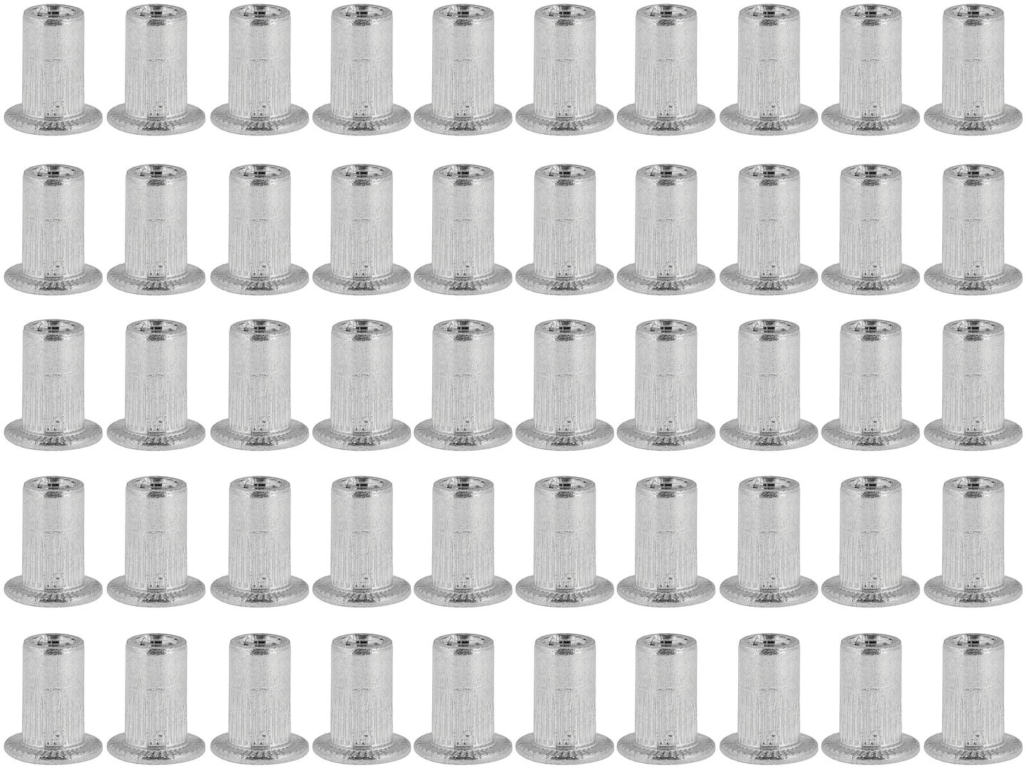 Nitonakrętki aluminiowe M3 w wykonaniu cylindrycznym z kołnierzem płaskim, przeznaczone do osadzania trwałych połączeń gwintowanych w cienkich blachach i profilach zamkniętych o grubości ścianki od 0,5 do 1,5 mm. Zestaw zawiera 50 sztuk przechowywanych w opakowaniu z zamknięciem ZIP.