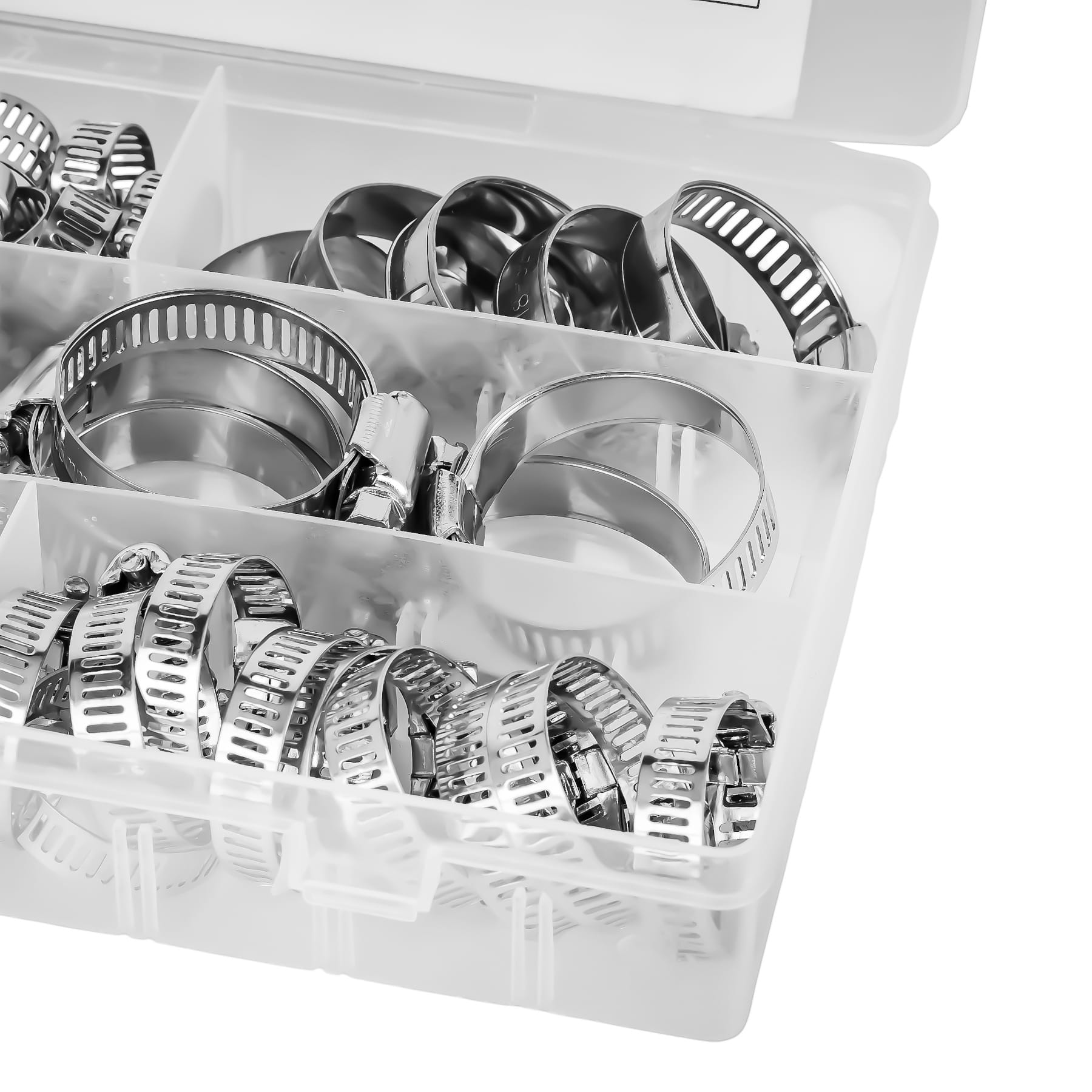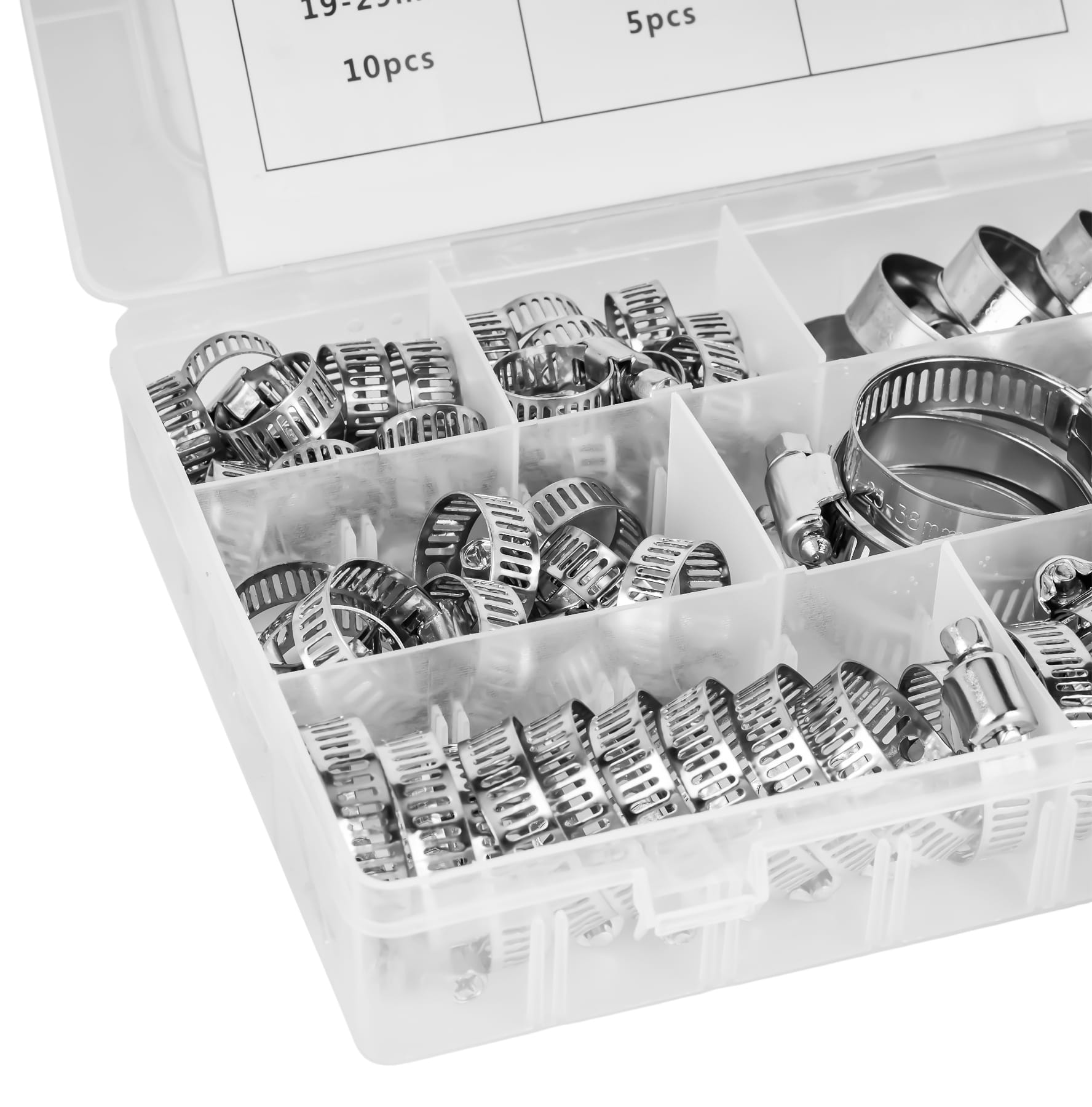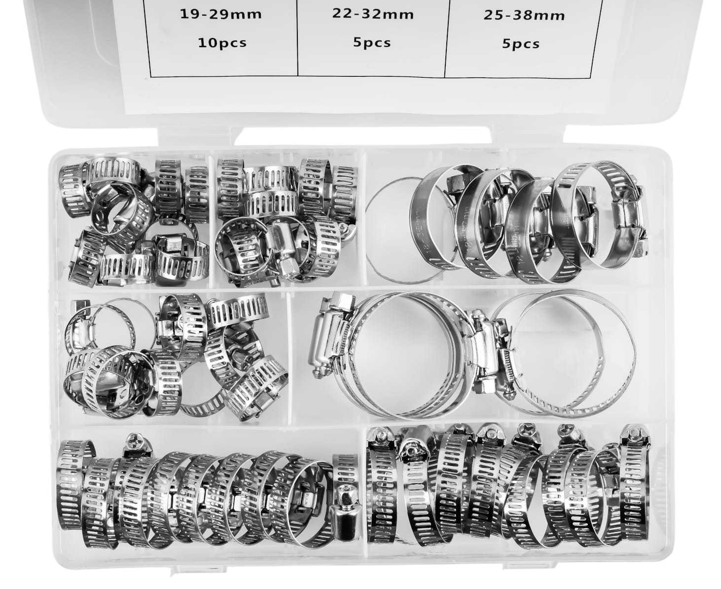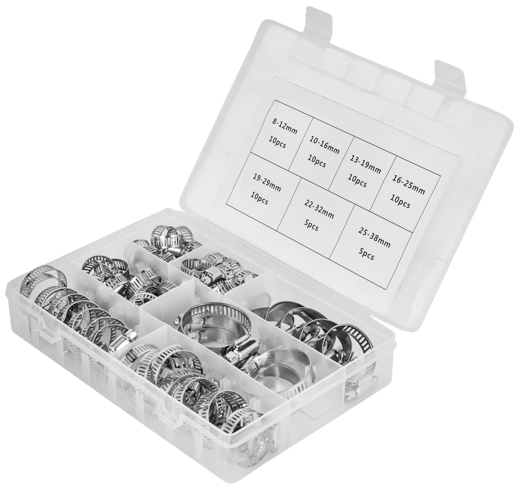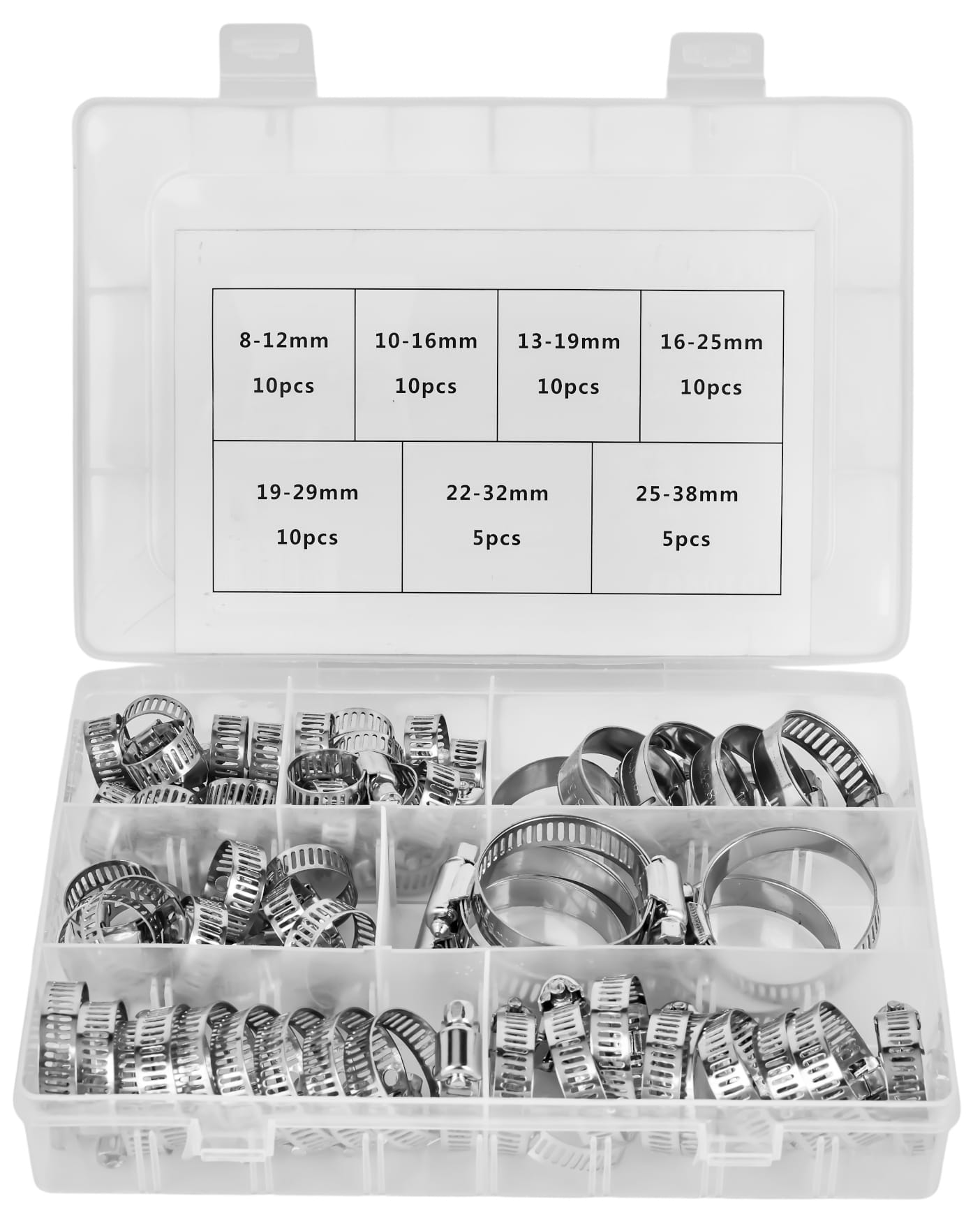 Kompletny zestaw metalowych opasek ślimakowych w siedmiu zakresach zaciskania — od 8 do 38 mm. Przeznaczony do trwałego mocowania węży, przewodów i rur w instalacjach hydraulicznych, paliwowych, chłodniczych oraz przy pracach serwisowych. W zestawie przezroczysty organizer umożliwiający segregację opasek według rozmiaru.