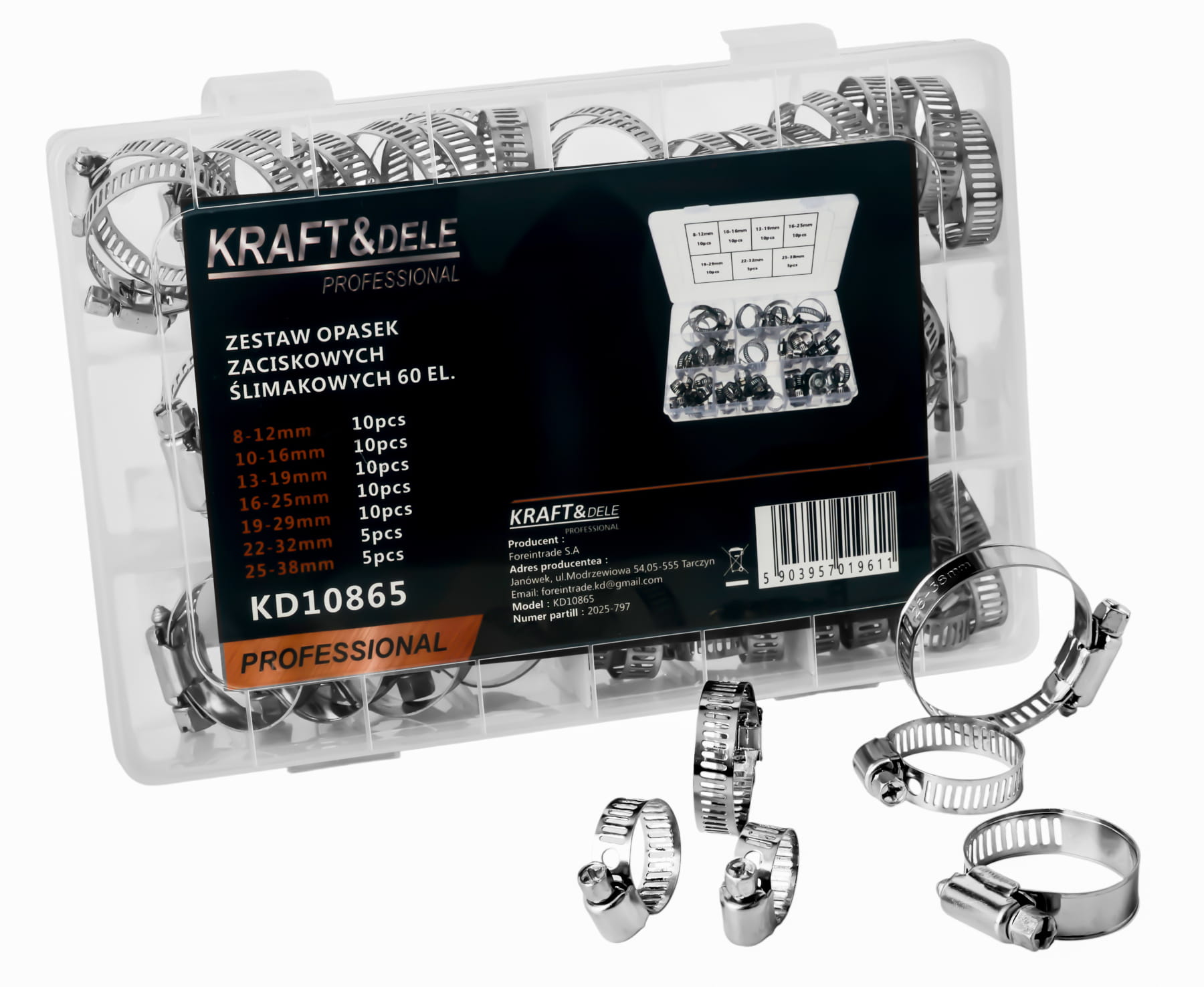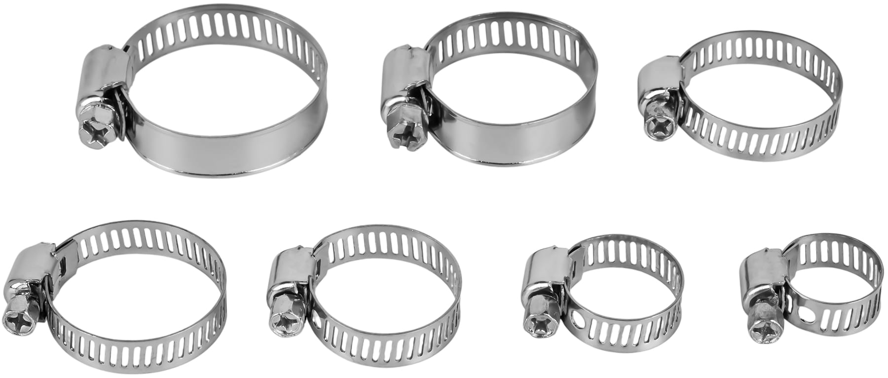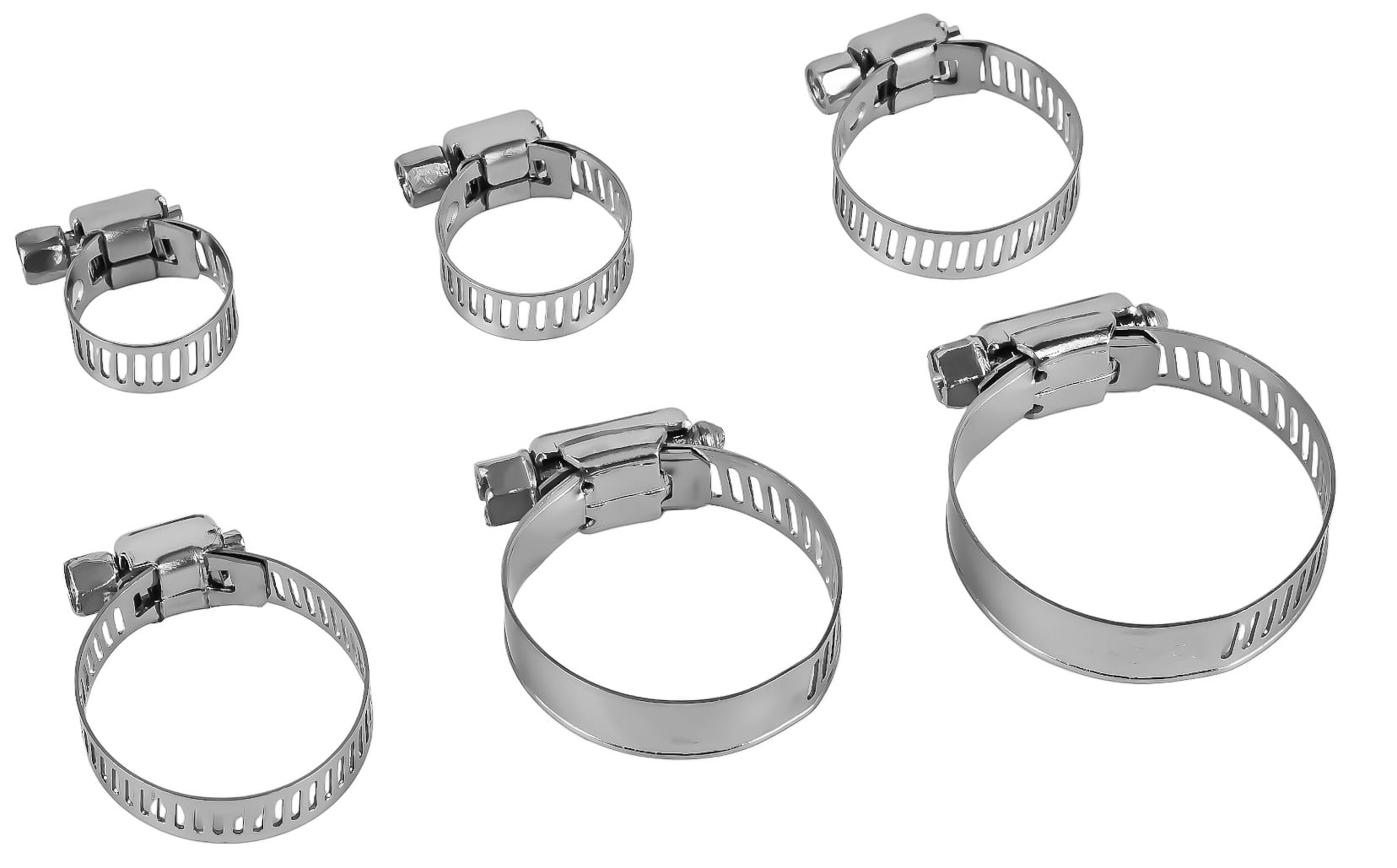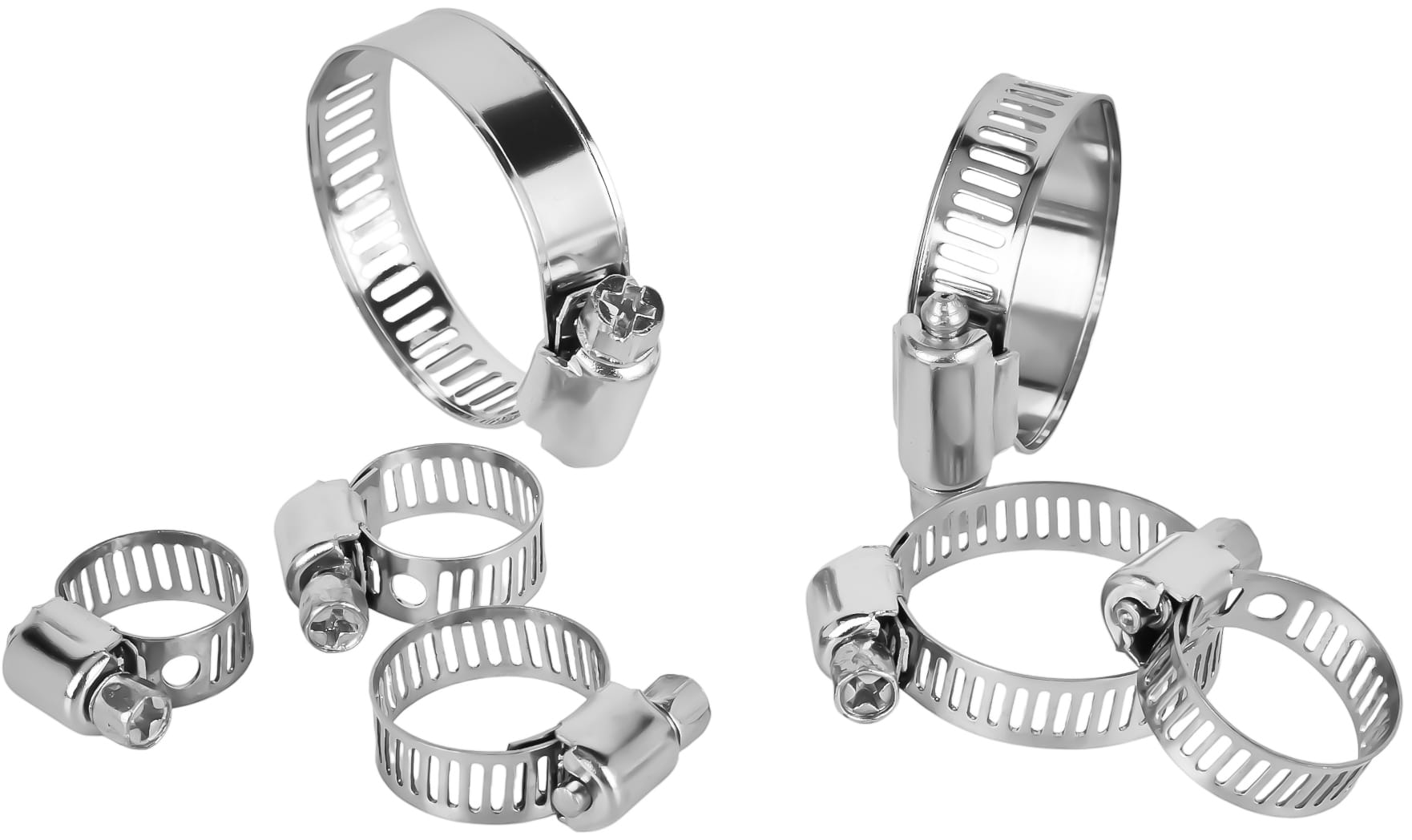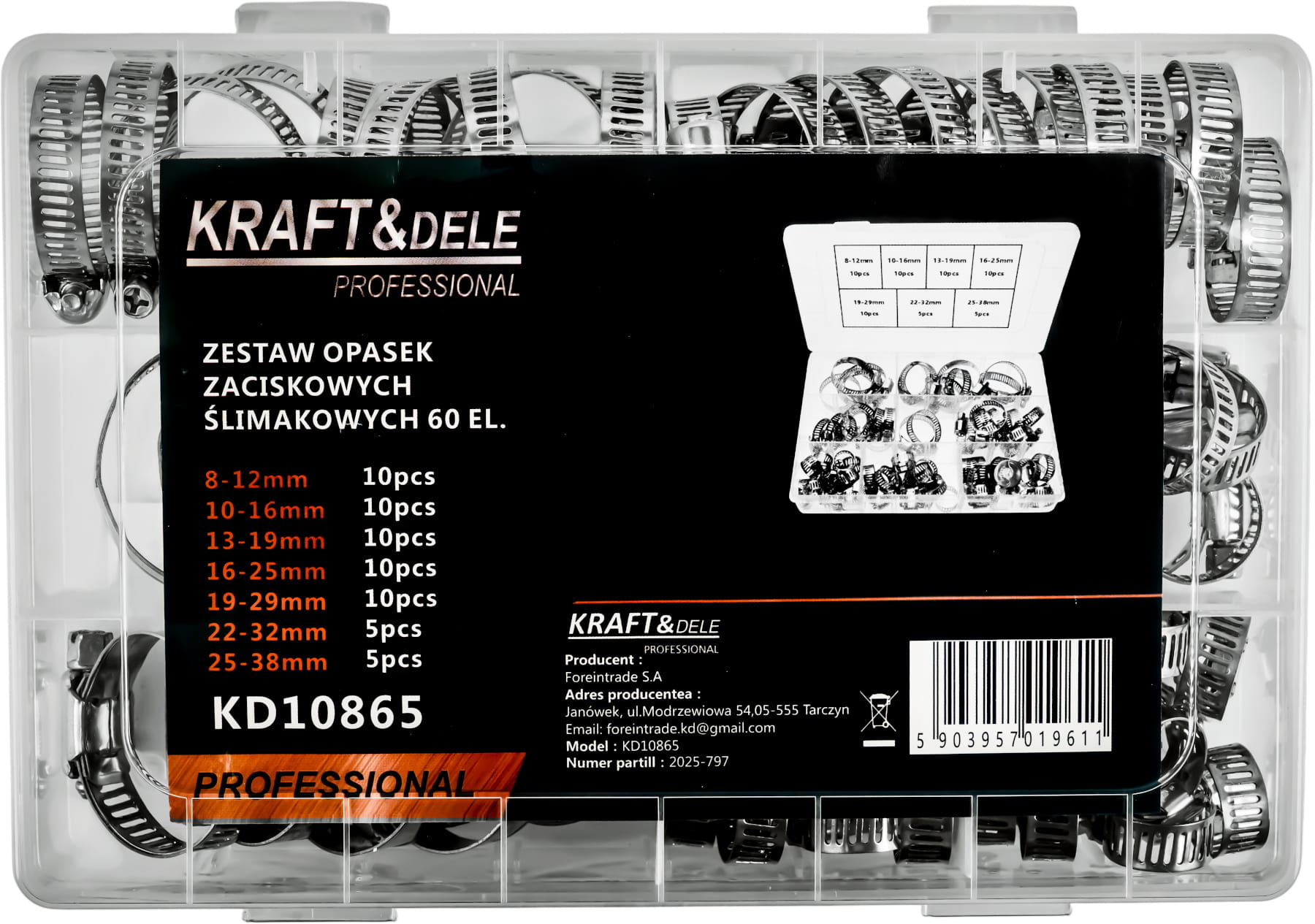 Kompletny zestaw metalowych opasek ślimakowych w siedmiu zakresach zaciskania — od 8 do 38 mm. Przeznaczony do trwałego mocowania węży, przewodów i rur w instalacjach hydraulicznych, paliwowych, chłodniczych oraz przy pracach serwisowych. W zestawie przezroczysty organizer umożliwiający segregację opasek według rozmiaru.