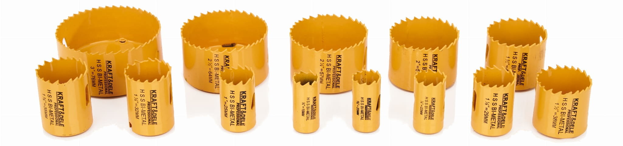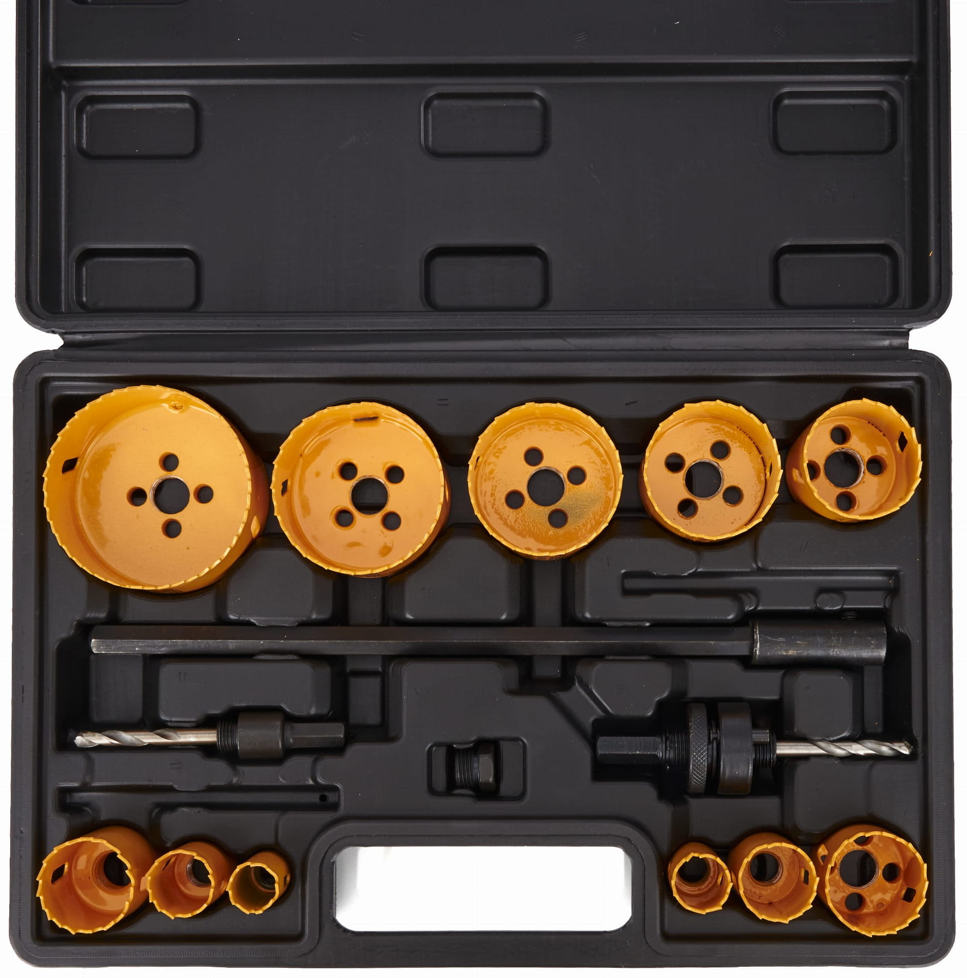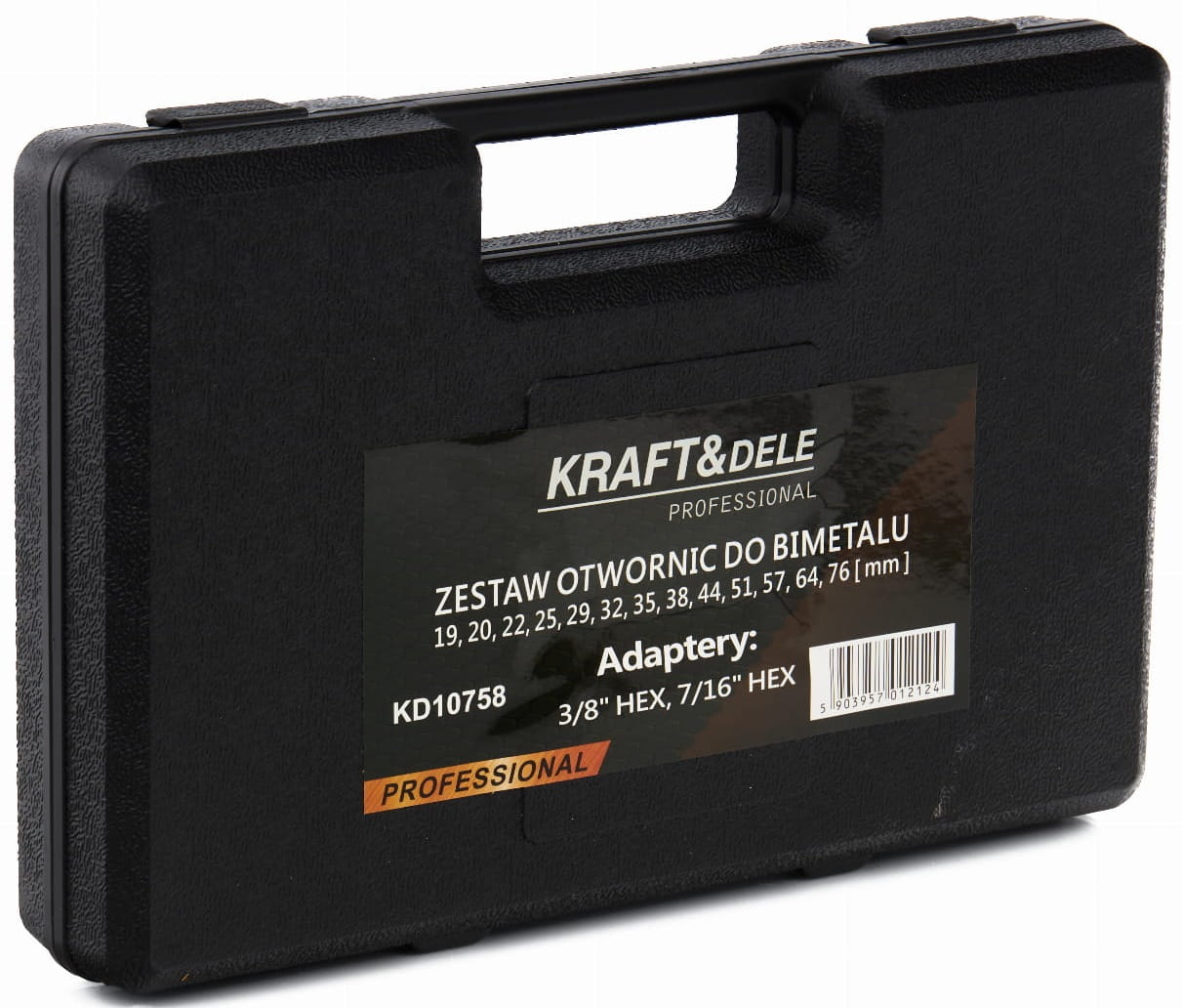 KD10758 to kompletny zestaw 17 otwornic bimetalowych marki Kraft&Dele, obejmujący zakres średnic od 19 do 76 mm. Narzędzia wykonane z połączenia stali HSS i stali wysokowęglowej przeznaczone są do wiercenia otworów w drewnie, metalu, aluminium oraz tworzywach sztucznych. Zestaw zawiera dwa trzpienie, adapter, przedłużkę oraz walizkę transportową.