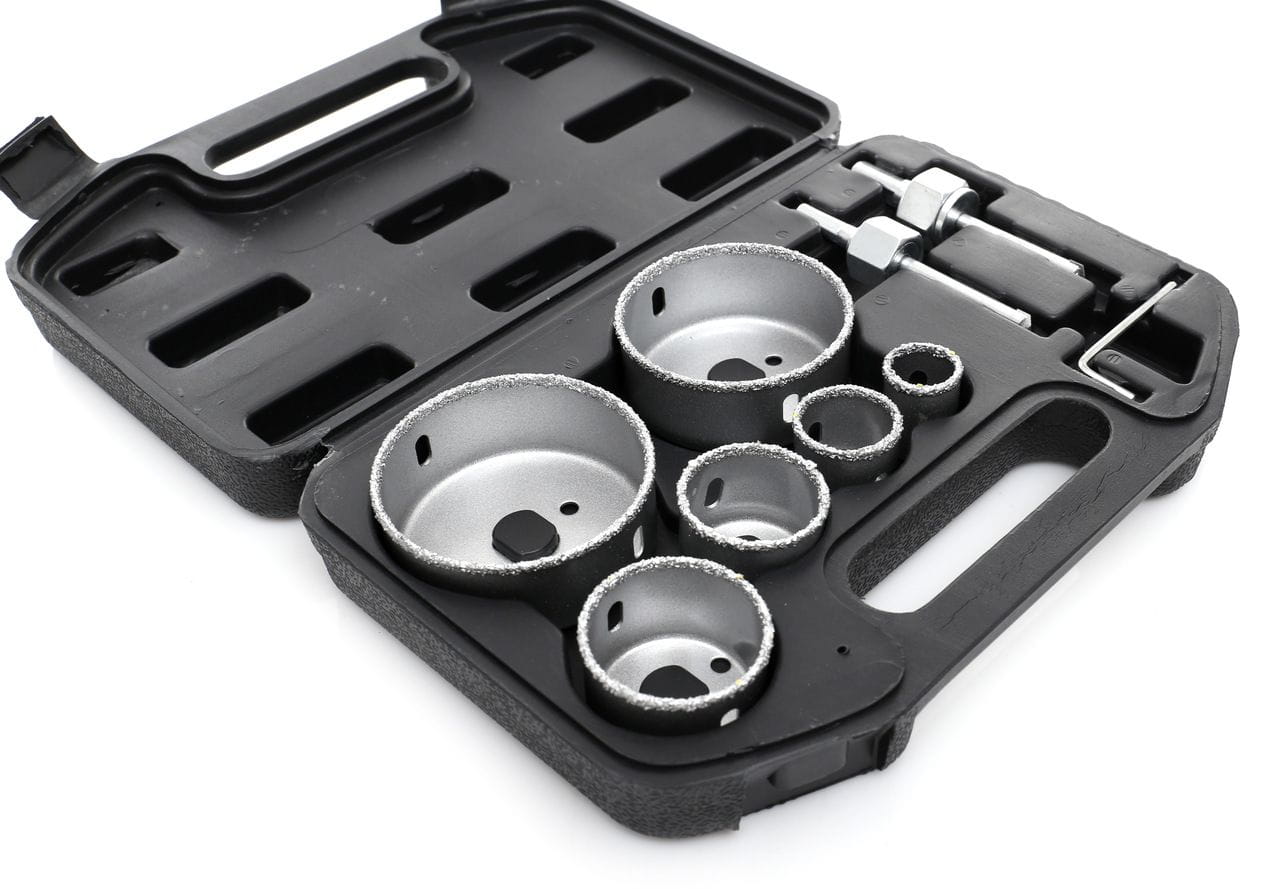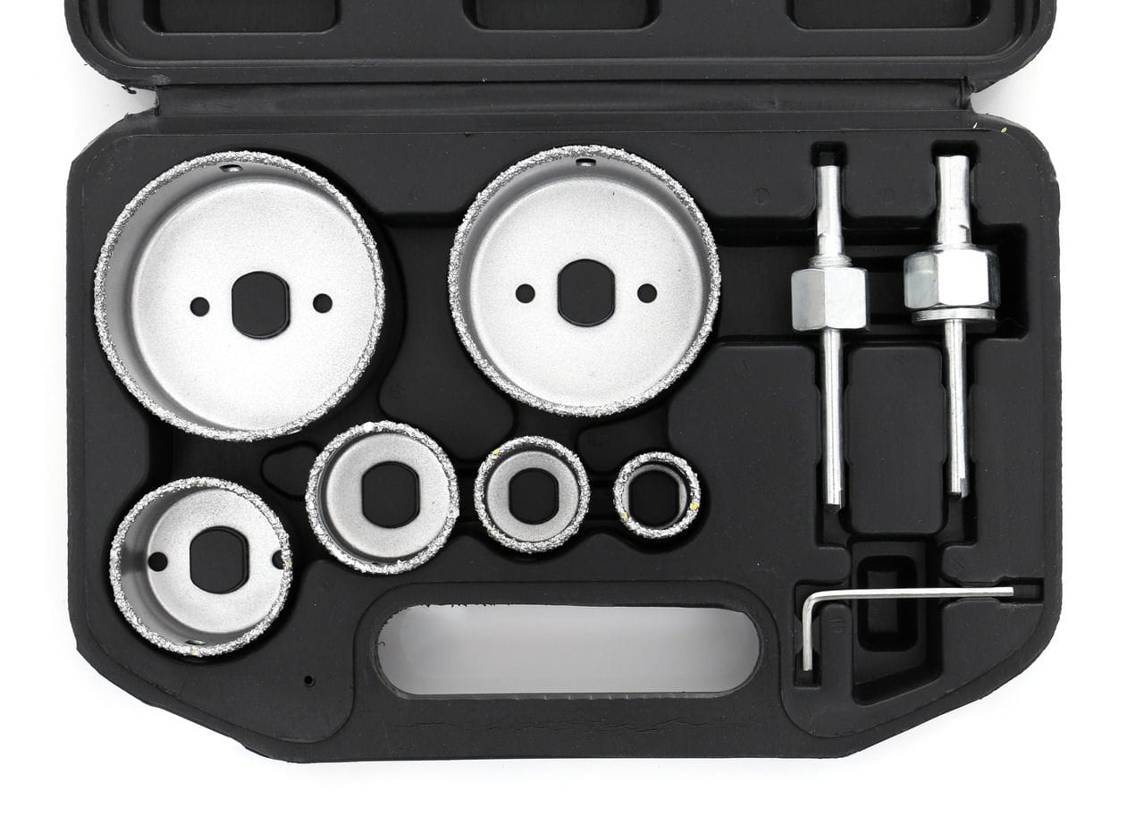 KD10285 to zestaw sześciu otwornic z ostrzami wolframowymi, przeznaczonych do wykonywania okrągłych otworów w twardych materiałach budowlanych — glazurze, terakocie, płytach karton-gips i podobnych podłożach. Zestaw zawiera akcesoria montażowe oraz walizkę transportową, co ułatwia przechowywanie i transport na miejsce pracy.