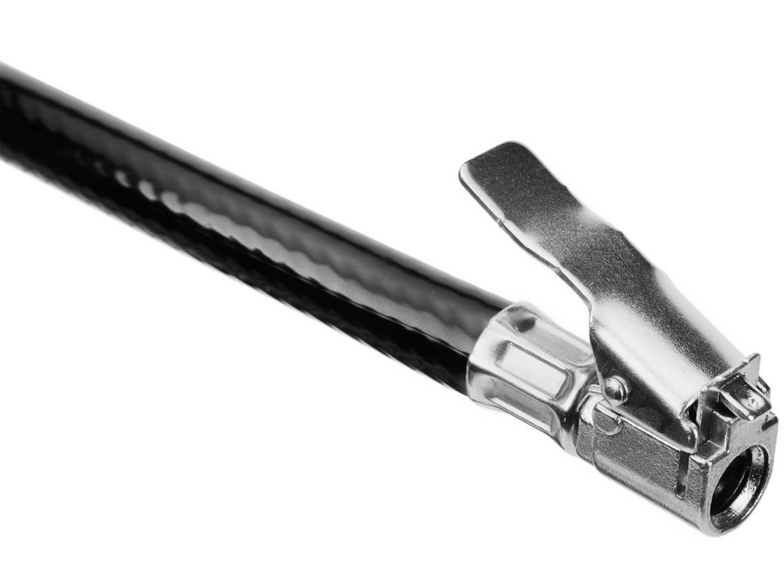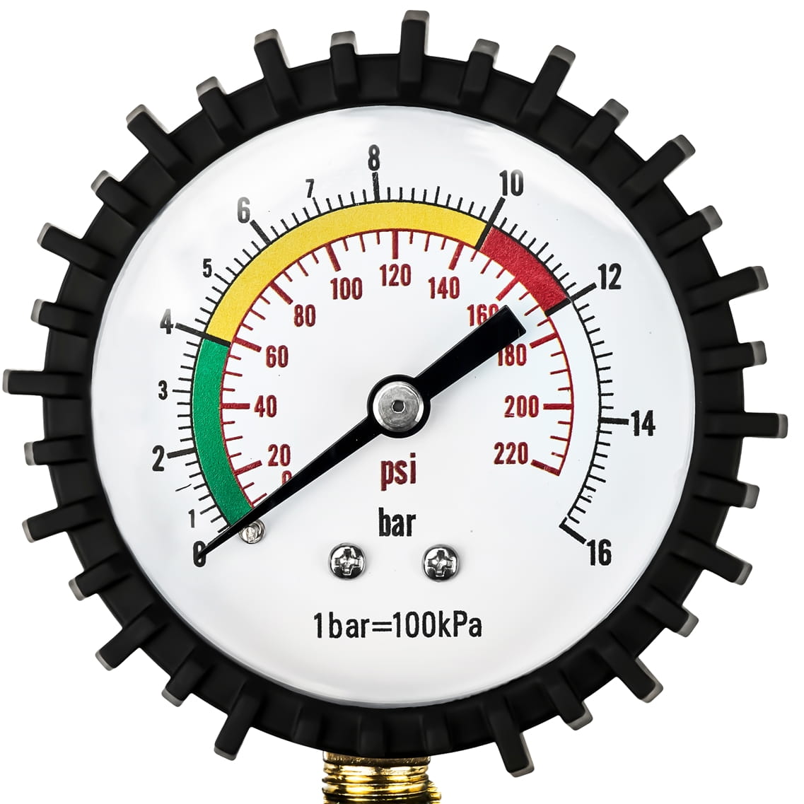 Wbudowany manometr umożliwia bieżącą kontrolę ciśnienia podczas pompowania. Zawór spustowy pozwala na precyzyjne korygowanie ciśnienia bez konieczności odłączania narzędzia — istotne przy pompowaniu opon, gdzie przekroczenie zalecanego ciśnienia wpływa na bezpieczeństwo jazdy.