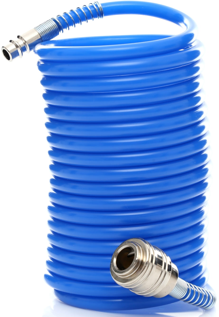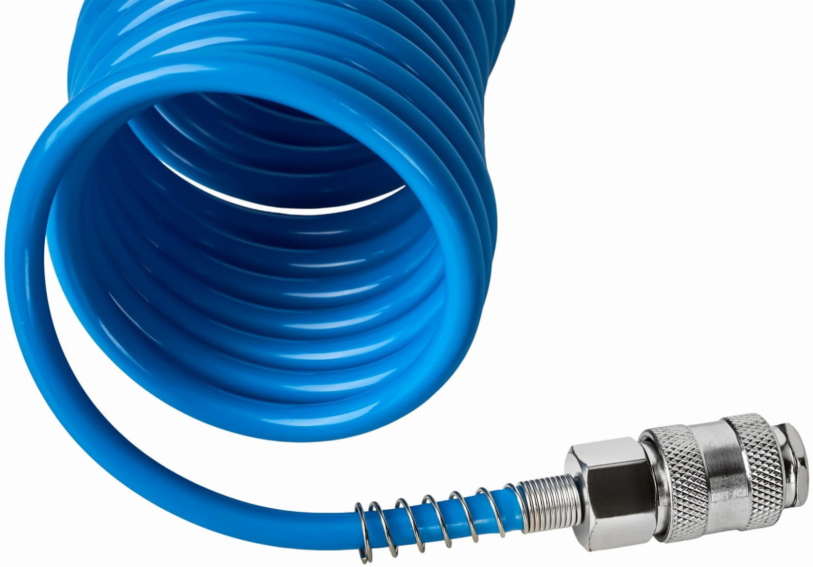 Konstrukcja spiralna sprawia, że wąż samoczynnie wraca do zwiniętej formy po zwolnieniu naciągu, co ogranicza bałagan w miejscu pracy. Długość 5 m zapewnia swobodę manewrowania wokół pojazdu lub stanowiska roboczego bez konieczności przesuwania kompresora.