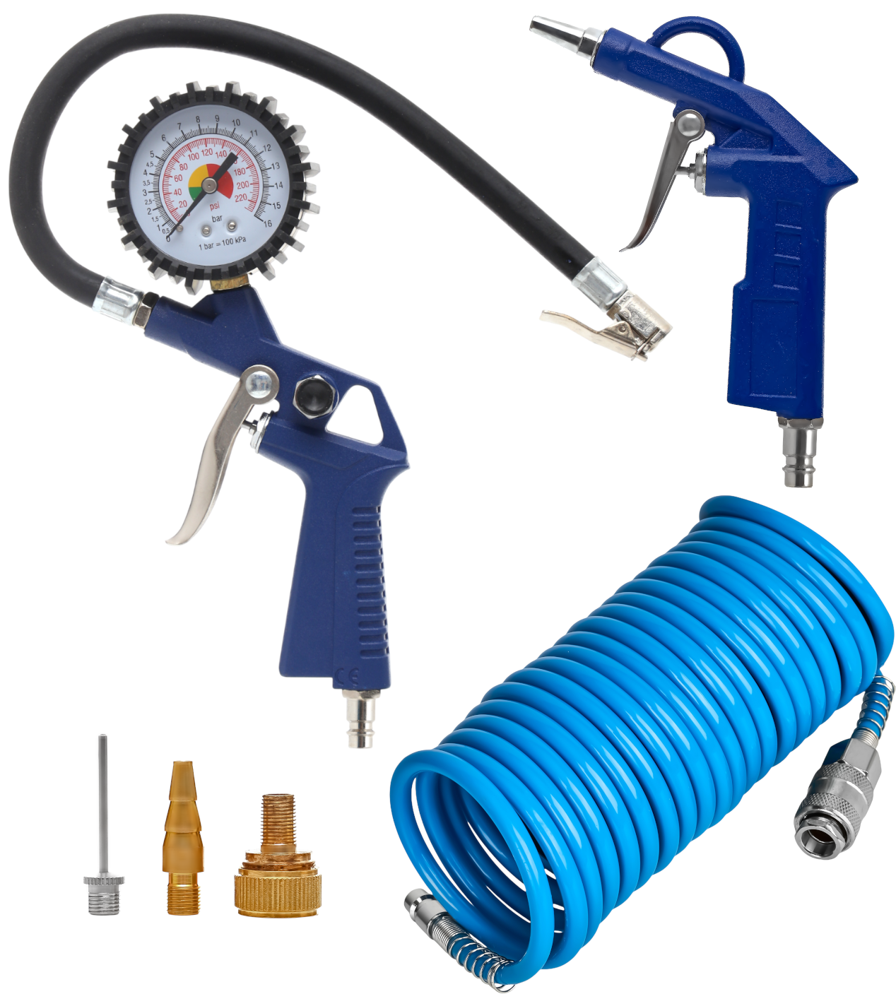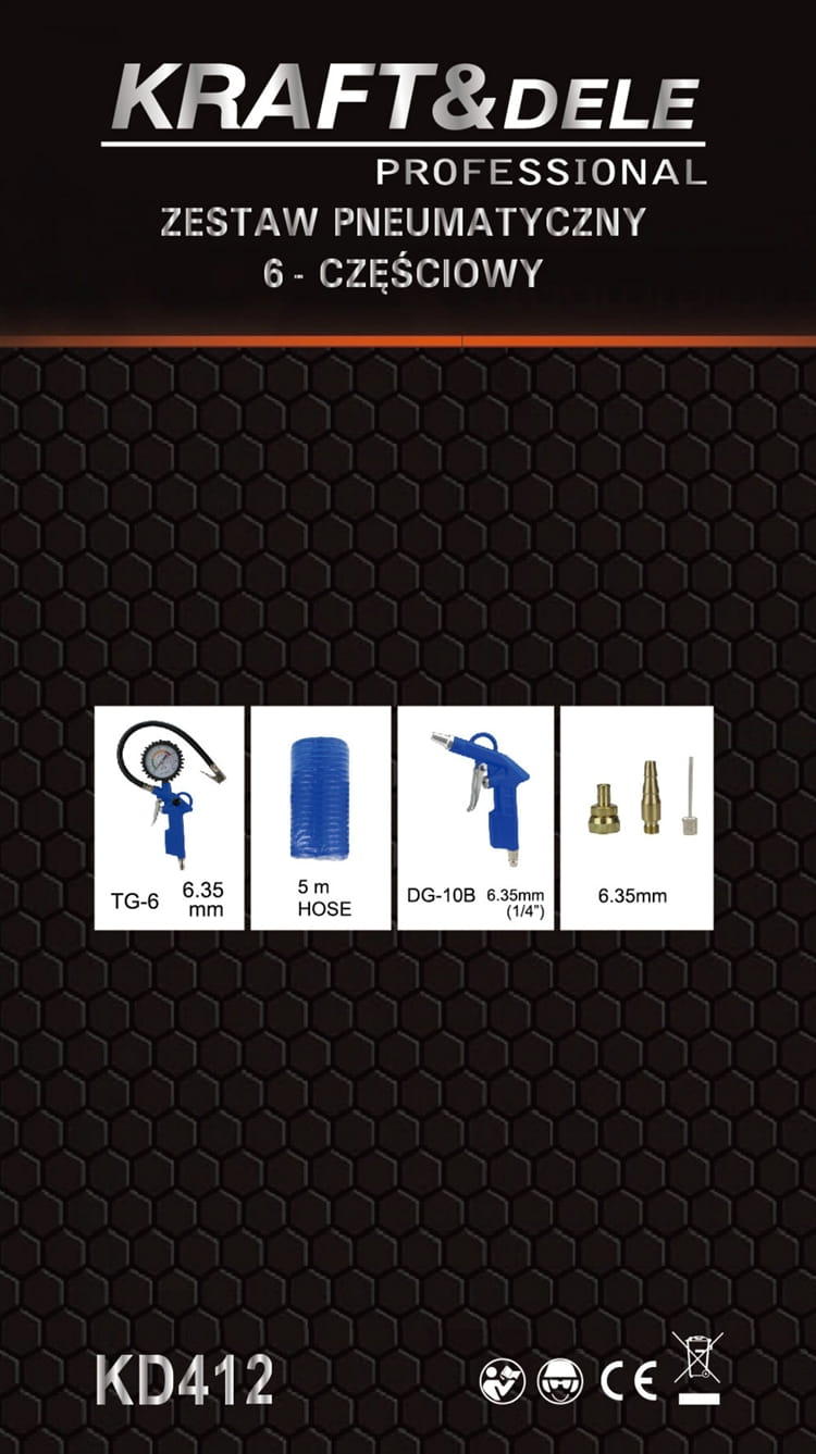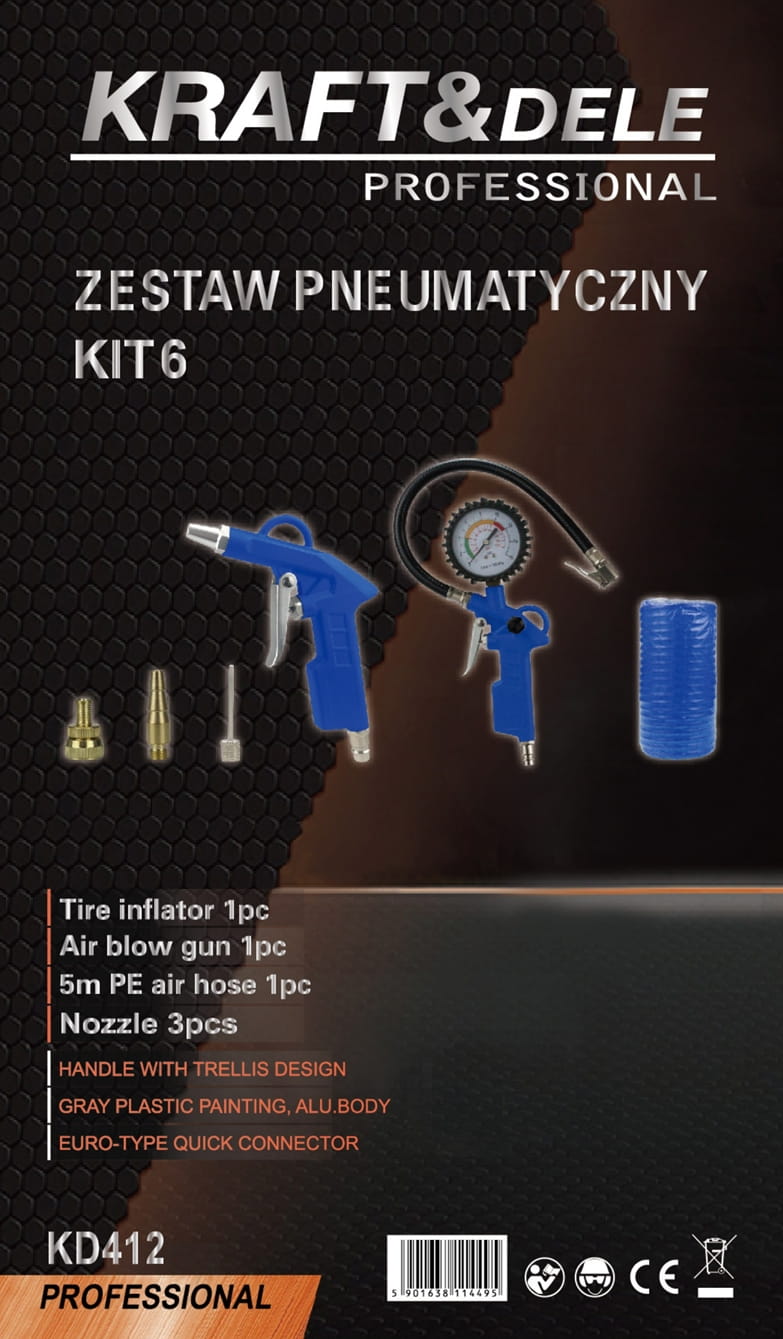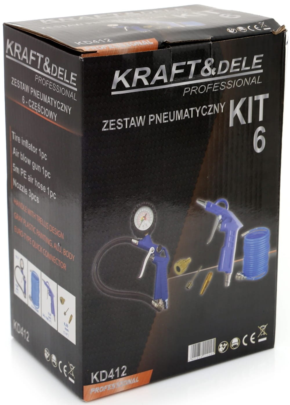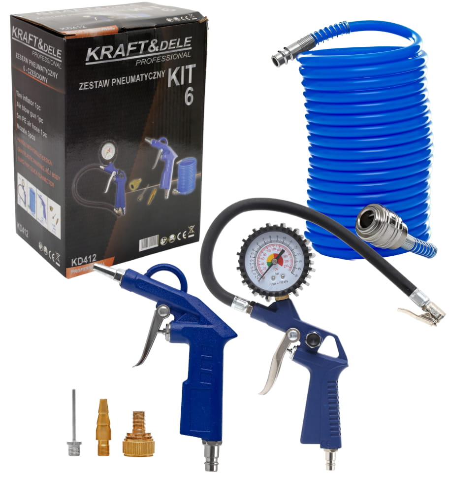 KD412 to zestaw narzędzi pneumatycznych przeznaczonych do prac związanych z pompowaniem i przedmuchiwaniem — zarówno w warsztacie samochodowym, jak i w garażu domowym. W skład zestawu wchodzą dwa pistolety, spiralny wąż pneumatyczny oraz trzy końcówki do pompowania, co pozwala na podłączenie do standardowego kompresora i natychmiastowe rozpoczęcie pracy.