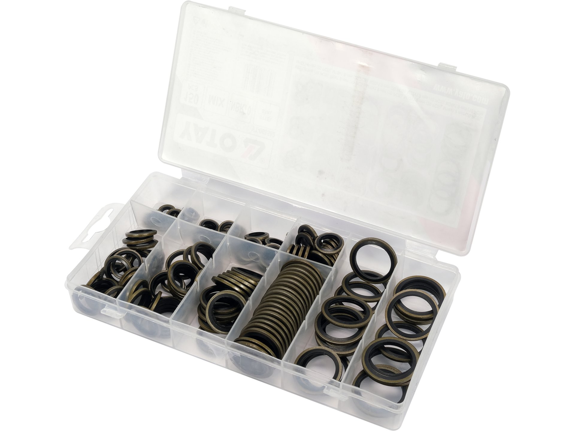 Zestaw 150 podkładek uszczelniających w konstrukcji stalowo-gumowej, przeznaczonych do zabezpieczania połączeń gwintowanych w systemach hydraulicznych, pneumatycznych oraz mechanicznych. Podkładki wykonane z gumą NBR 70 zapewniają skuteczne uszczelnienie i ochronę przed korozją w zakresie gwintów od M6 do M24.