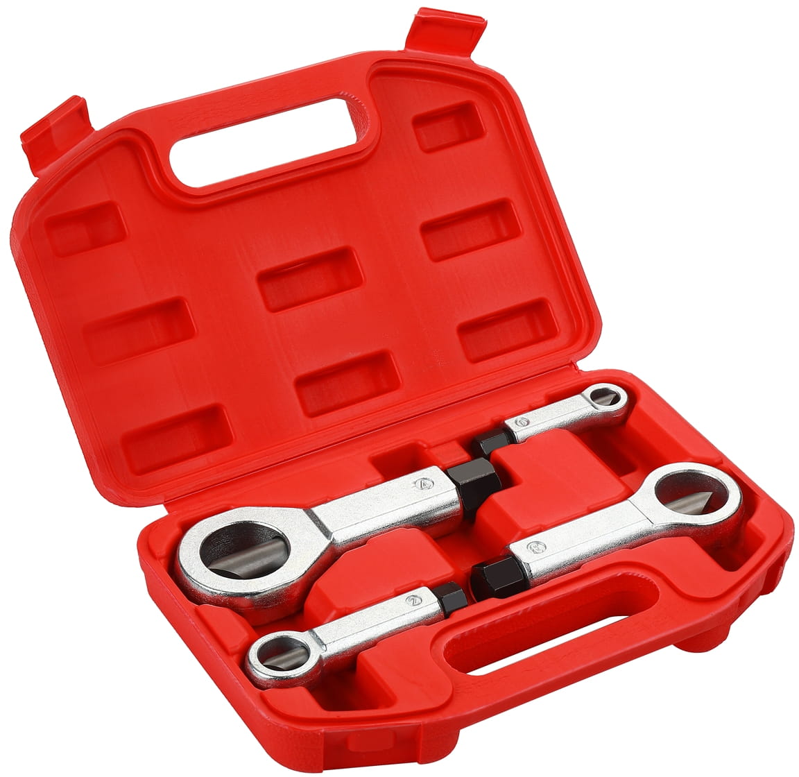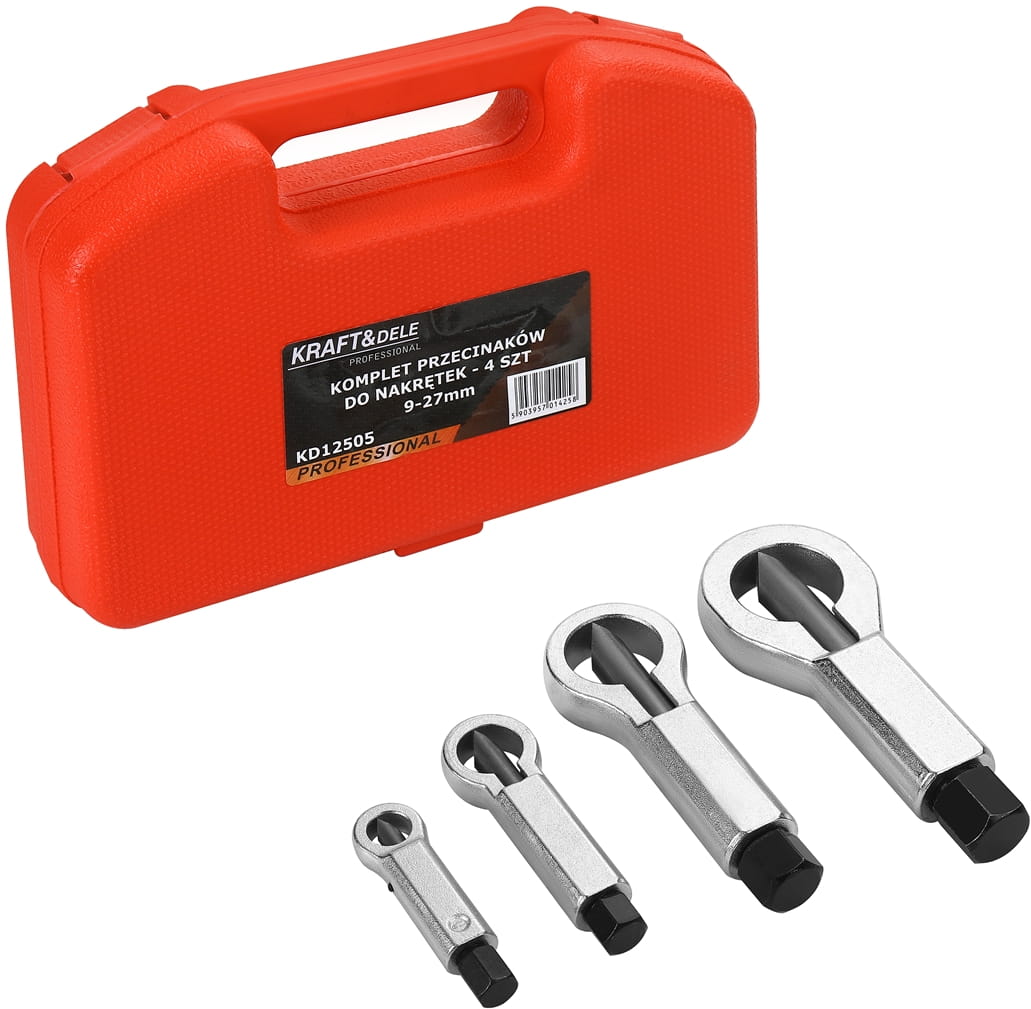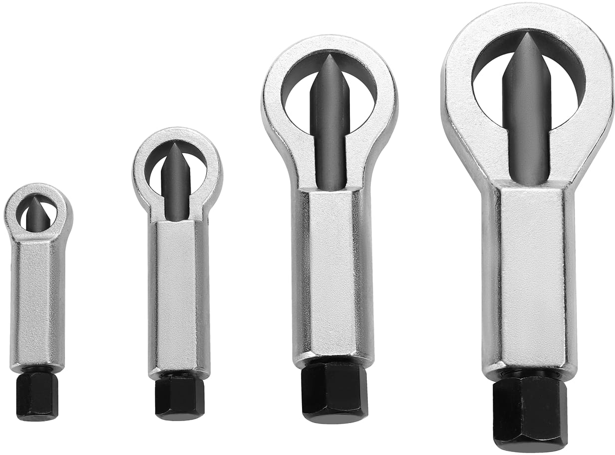 Komplet czterech przecinaków przeznaczonych do mechanicznego usuwania zapieczonych, zardzewiałych lub uszkodzonych nakrętek bez ingerencji w gwint śruby. Narzędzia wykonane ze stali hartowanej obejmują zakres rozmiarów od 9 do 27 mm, co pozwala na pracę z większością standardowych nakrętek metrycznych i calowych spotykanych w motoryzacji i przemyśle.