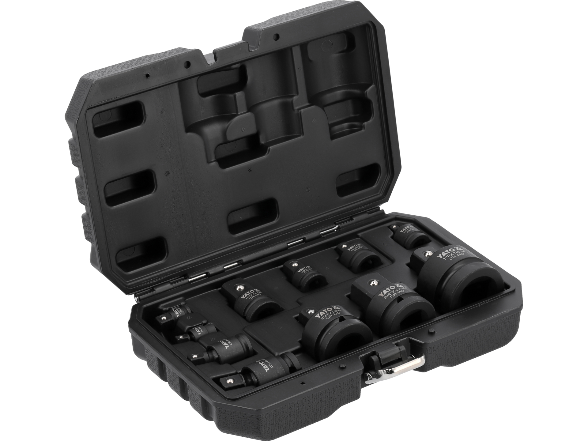 Kompletny zestaw 11 adapterów udarowych i przegubów kątowych wykonanych ze stali chromowo-molibdenowej. Umożliwia konwersję chwytów narzędziowych od 1/4" do 1" oraz pracę w trudno dostępnych miejscach przy użyciu narzędzi udarowych.