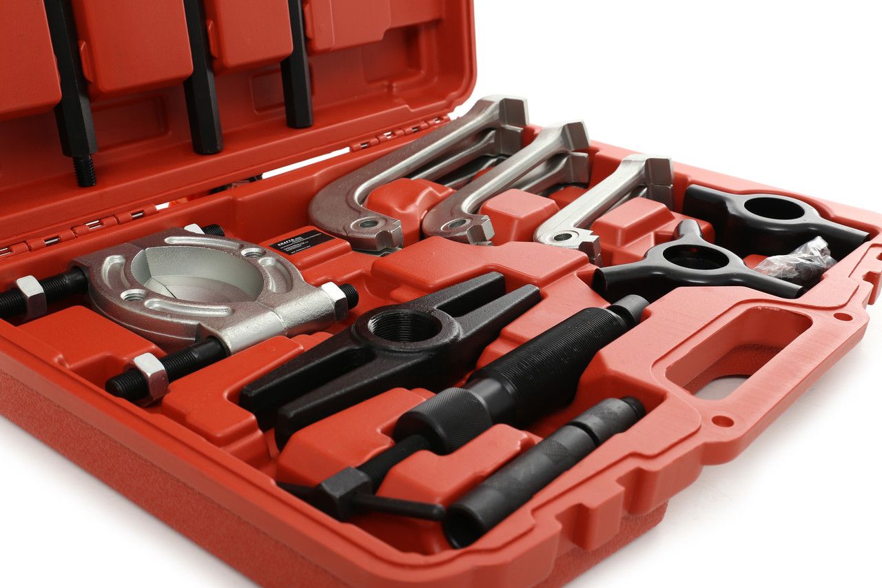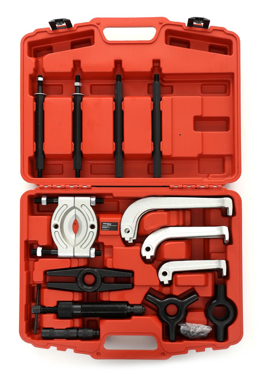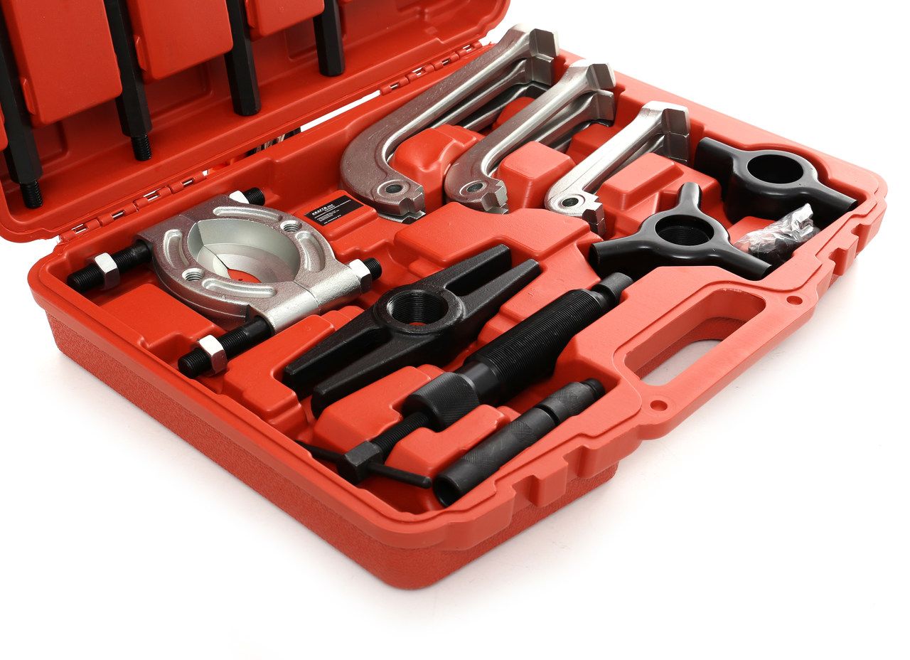 Zestaw jest przystosowany do pracy w warunkach warsztatu samochodowego lub przemysłowego — zarówno do demontażu łożysk kół, jak i łożysk w skrzyniach biegów, alternatorach czy silnikach elektrycznych.