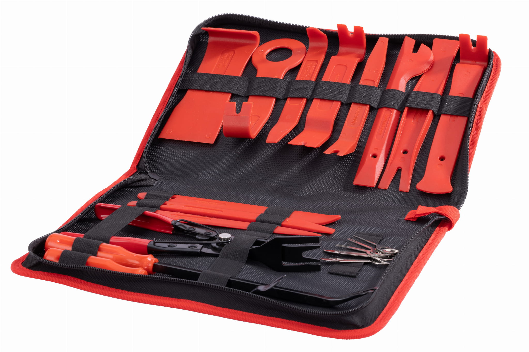 Komplet 19 specjalistycznych narzędzi z utwardzonego nylonu przeznaczonych do demontażu tapicerki, listew ozdobnych i spinek tapicerskich w pojazdach samochodowych. Zróżnicowane profile ściągaczy pozwalają dopasować narzędzie do konkretnego rodzaju zaczepu, co ogranicza ryzyko uszkodzenia elementów wykończeniowych.