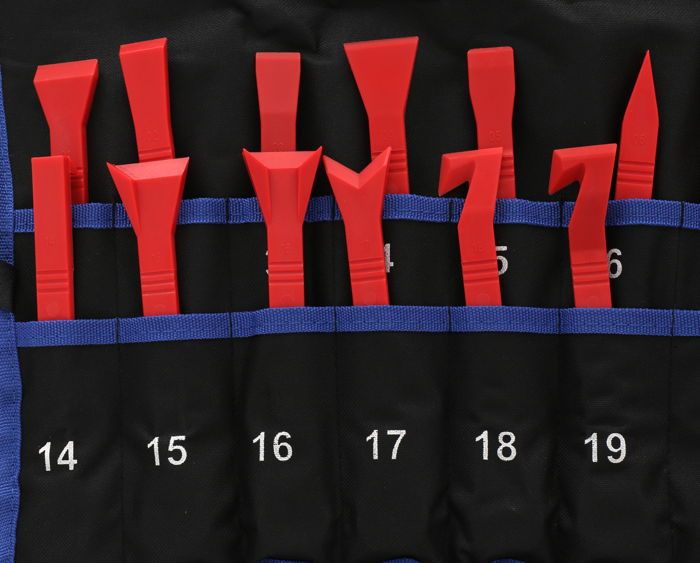Profile narzędzi w zestawie KD1130 umożliwiają użycie dźwigni przy demontażu, co ułatwia wyjmowanie klipsów w ciasnych miejscach.