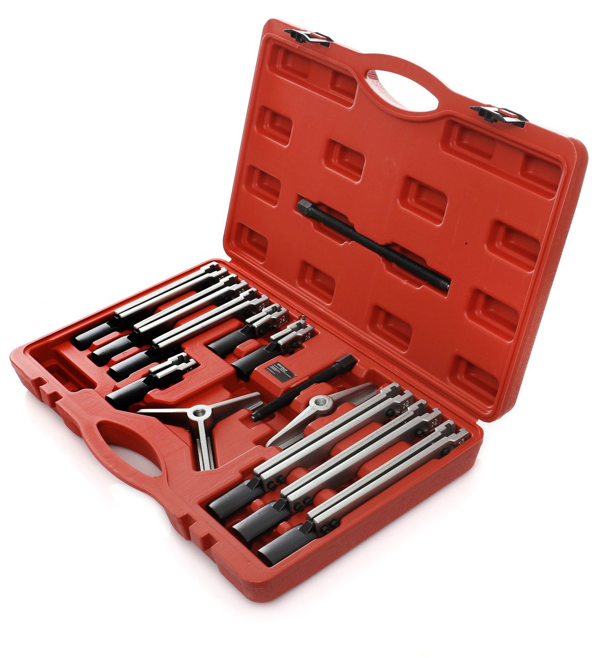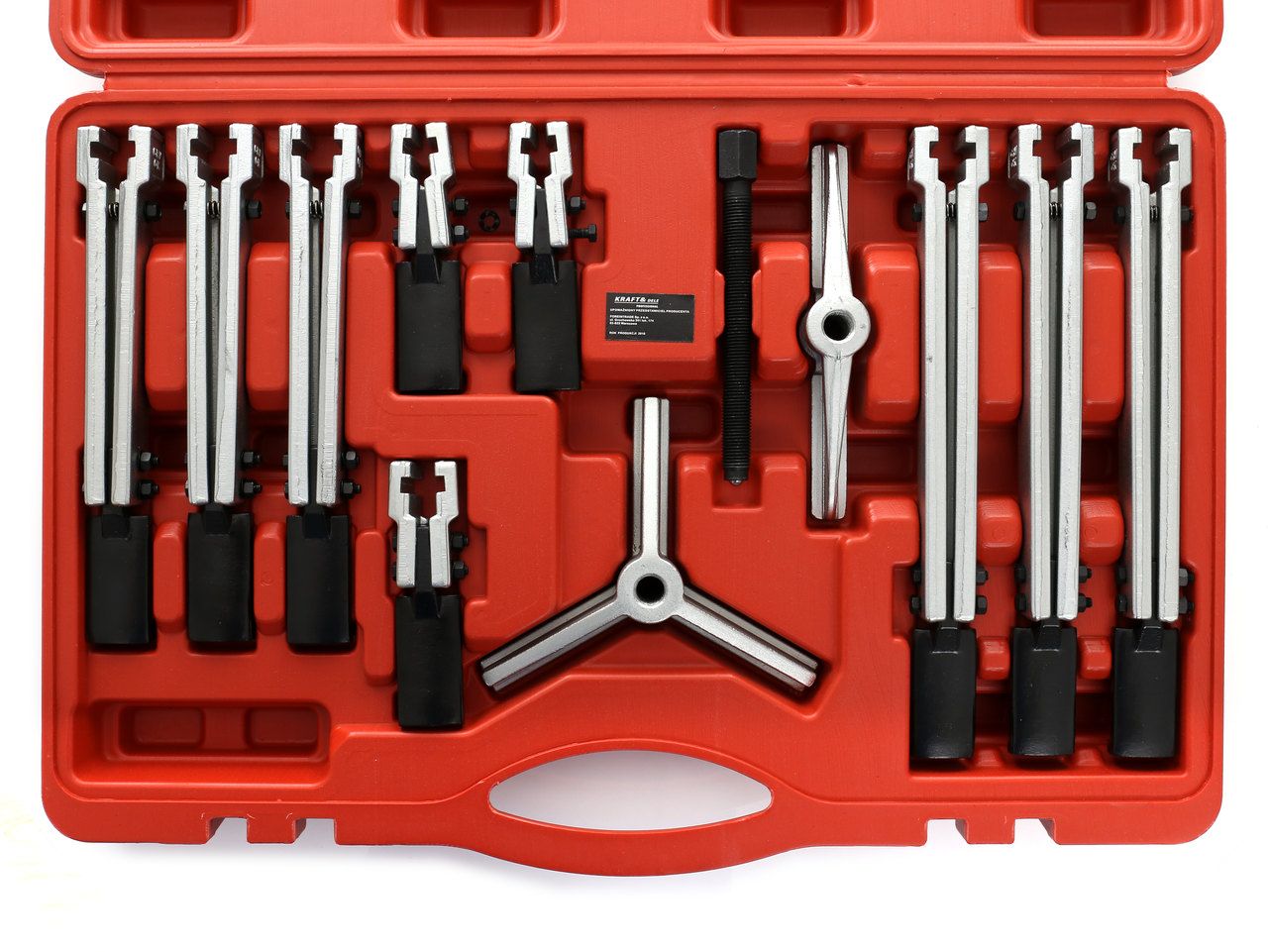 Kompletny zestaw narzędzi do demontażu łożysk, kół zębatych, kół pasowych i wałków — przeznaczony do intensywnej pracy w serwisach mechanicznych i samochodowych. Narzędzia wykonane ze stali wysokowęglowej z napędem śrubowym na gwincie trapezowym drobnozwojnym.