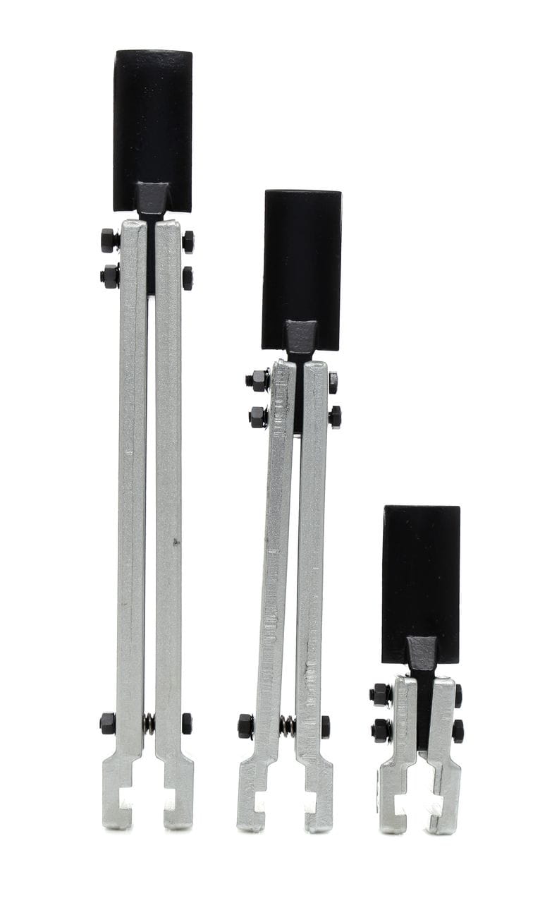 Zestaw zawiera łapy różniące się wielkością stopki, co pozwala na dopasowanie ściągacza do elementów o różnych gabarytach i kształtach. Możliwość zaczepu od wewnątrz lub zewnątrz zwiększa zakres zastosowań bez konieczności posiadania oddzielnych narzędzi.