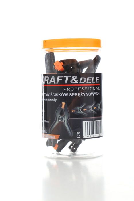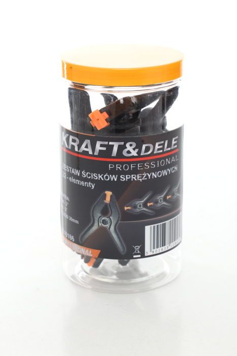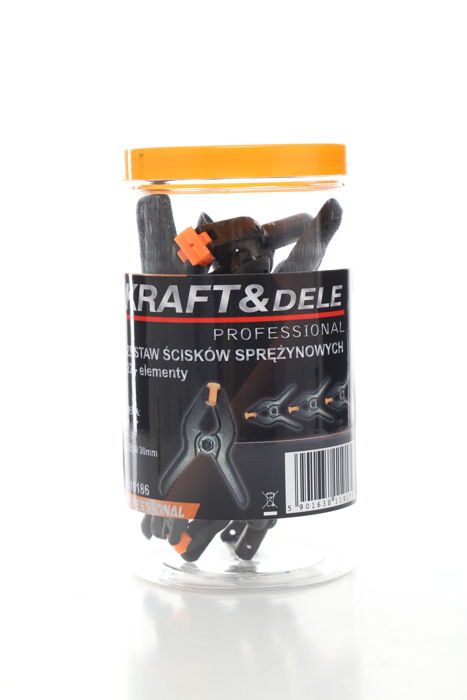 Pojemnik z zakręcaną pokrywką sprawia, że ściski sprężynowe KRAFT&DELE są zawsze w komplecie i gotowe do użycia.