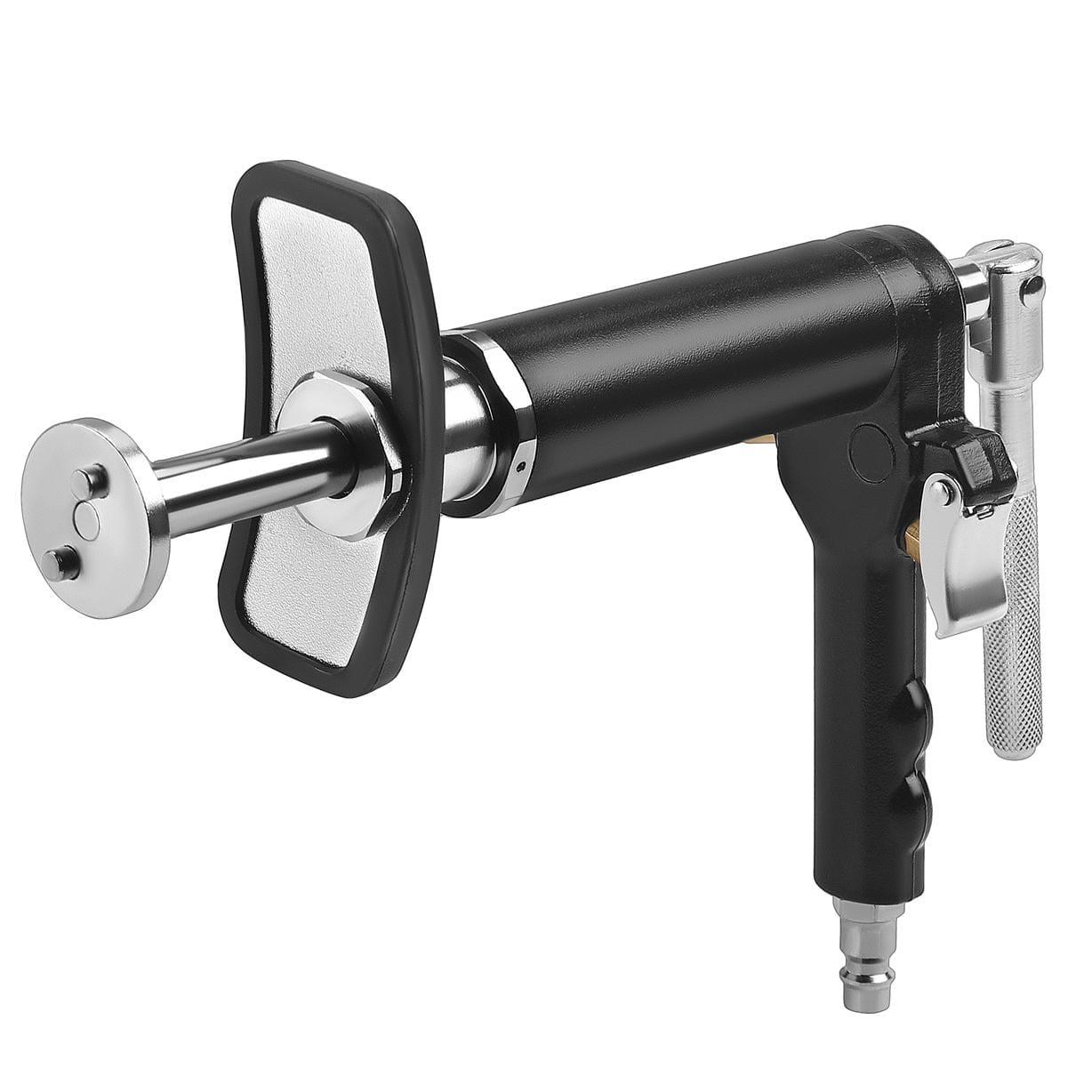 Narzędzie pracuje przy ciśnieniu roboczym 5 bar (maks. 8 bar), co odpowiada parametrom typowych kompresorów warsztatowych. Siłownik pneumatyczny przejmuje wysiłek wciskania tłoka, eliminując konieczność stosowania dużej siły ręcznej — szczególnie istotne przy zaciskach z mocną sprężyną powrotną.