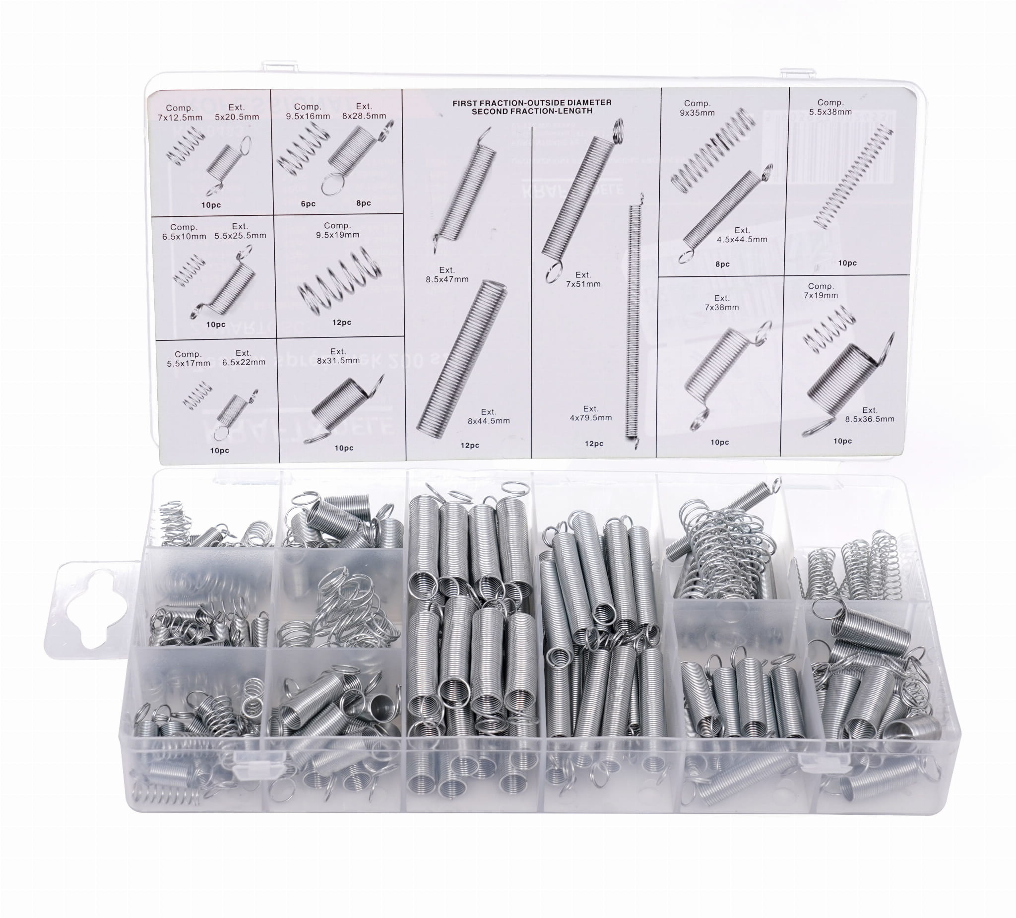 Asortymentowy zestaw sprężyn ze stali ocynkowanej obejmujący 200 sztuk w 20 różnych rozmiarach — zarówno sprężyny rozciągające, jak i ściskające. Zestaw przeznaczony do zastosowań warsztatowych, naprawczych i konstrukcyjnych, gdzie wymagany jest szybki dostęp do elementów sprężystych różnych wymiarów.