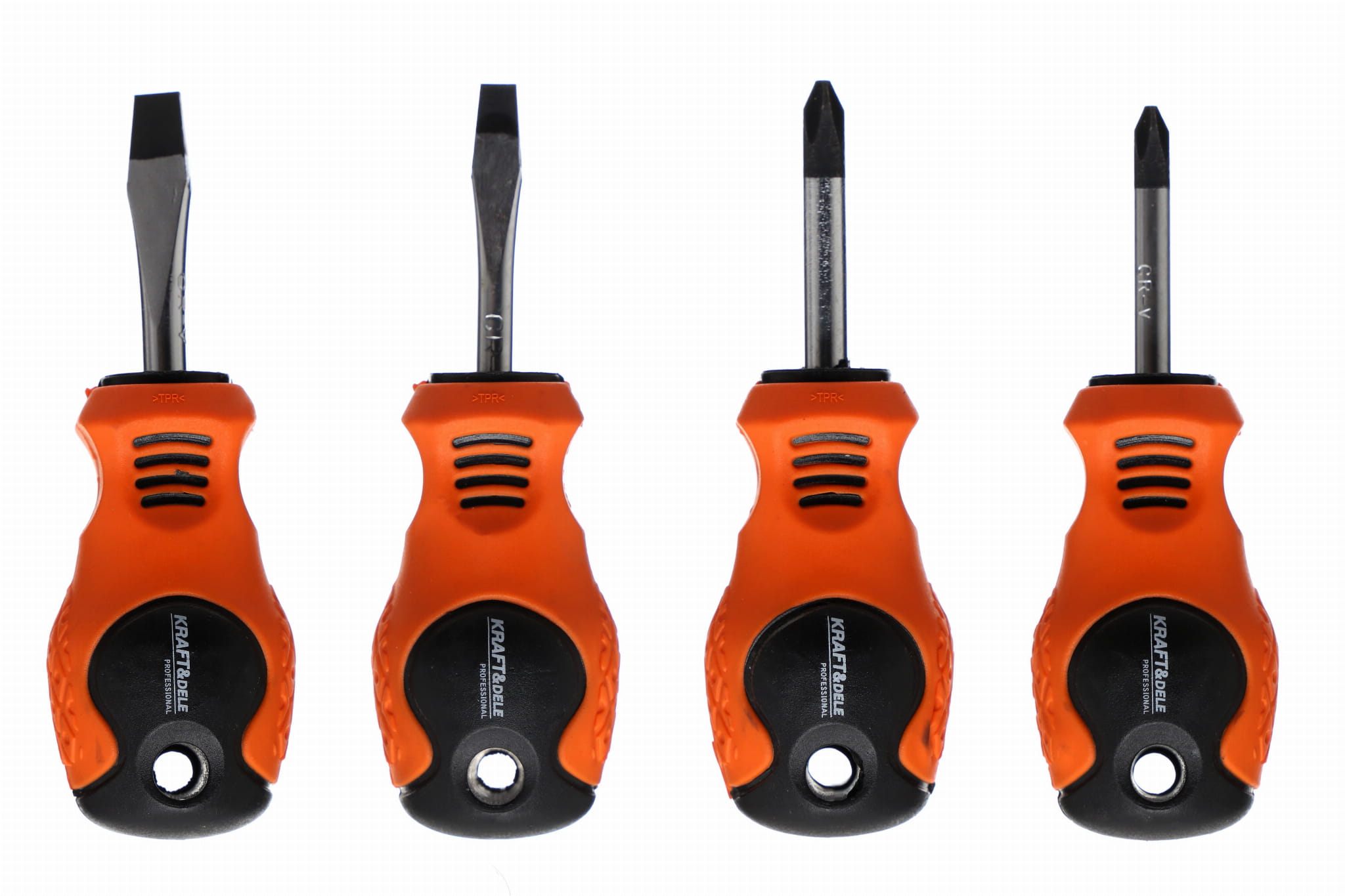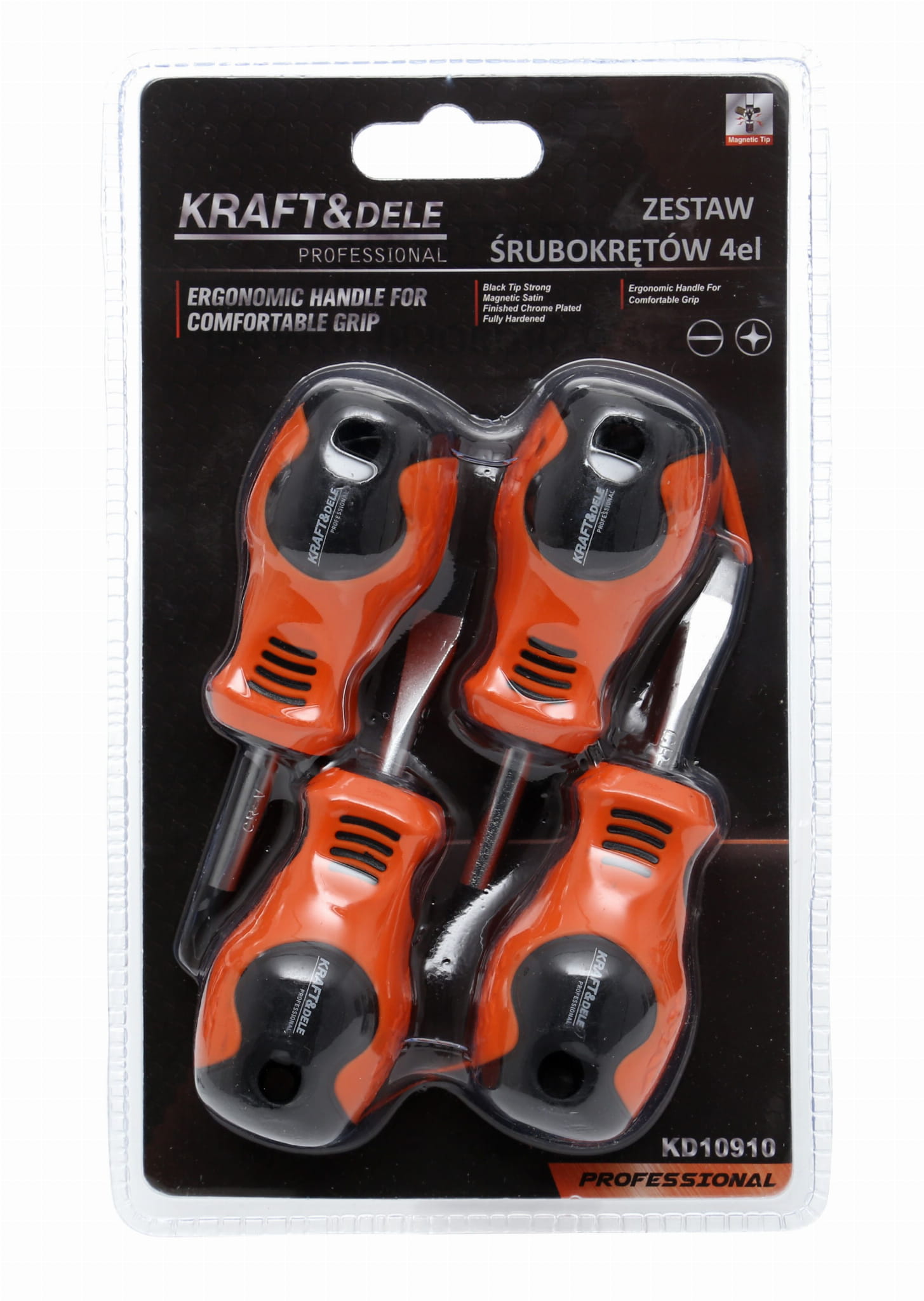 Komplet czterech śrubokrętów obejmujący dwa typy końcówek — płaskie i krzyżowe Phillips — w rozmiarach dobranych do najczęściej spotykanych śrub w pracach warsztatowych, motoryzacyjnych i montażowych. Zestaw pokrywa podstawowe potrzeby zarówno w garażu, jak i podczas prac domowych.
