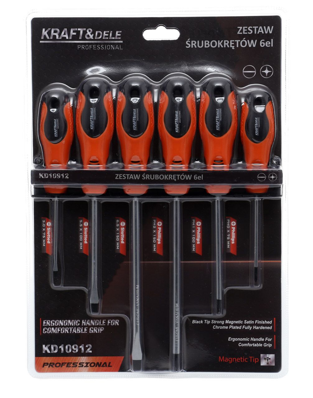 Zestaw śrubokrętów 6el. KD10912 to praktyczny komplet wkrętaków do typowych prac montażowych i serwisowych. Model KD10912 marki KRAFT&DELE pomaga szybko dobrać właściwy grot do śrub płaskich i krzyżowych, bez szukania pojedynczych narzędzi.