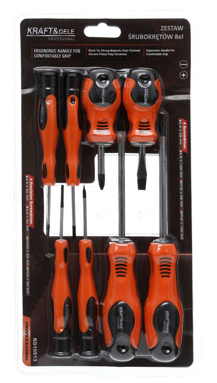 Zestaw śrubokrętów 8el. KD10913 KRAFT&DELE jest dobrym wyborem do warsztatu, garażu i domowej skrzynki narzędziowej. Dzięki połączeniu wkrętaków tradycyjnych i precyzyjnych łatwiej wykonać zarówno standardowe prace montażowe, jak i drobniejsze regulacje.