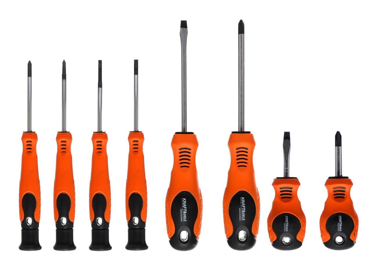 KD10913 to kompletny zestaw ośmiu śrubokrętów marki Kraft&Dele, łączący narzędzia warsztatowe w standardowych rozmiarach z wkrętakami precyzyjnymi do drobnych prac montażowych. Zestaw obejmuje zarówno groty płaskie, jak i krzyżowe Phillips, co pozwala obsłużyć większość typowych połączeń śrubowych spotykanych w gospodarstwie domowym, warsztacie i elektronice.
