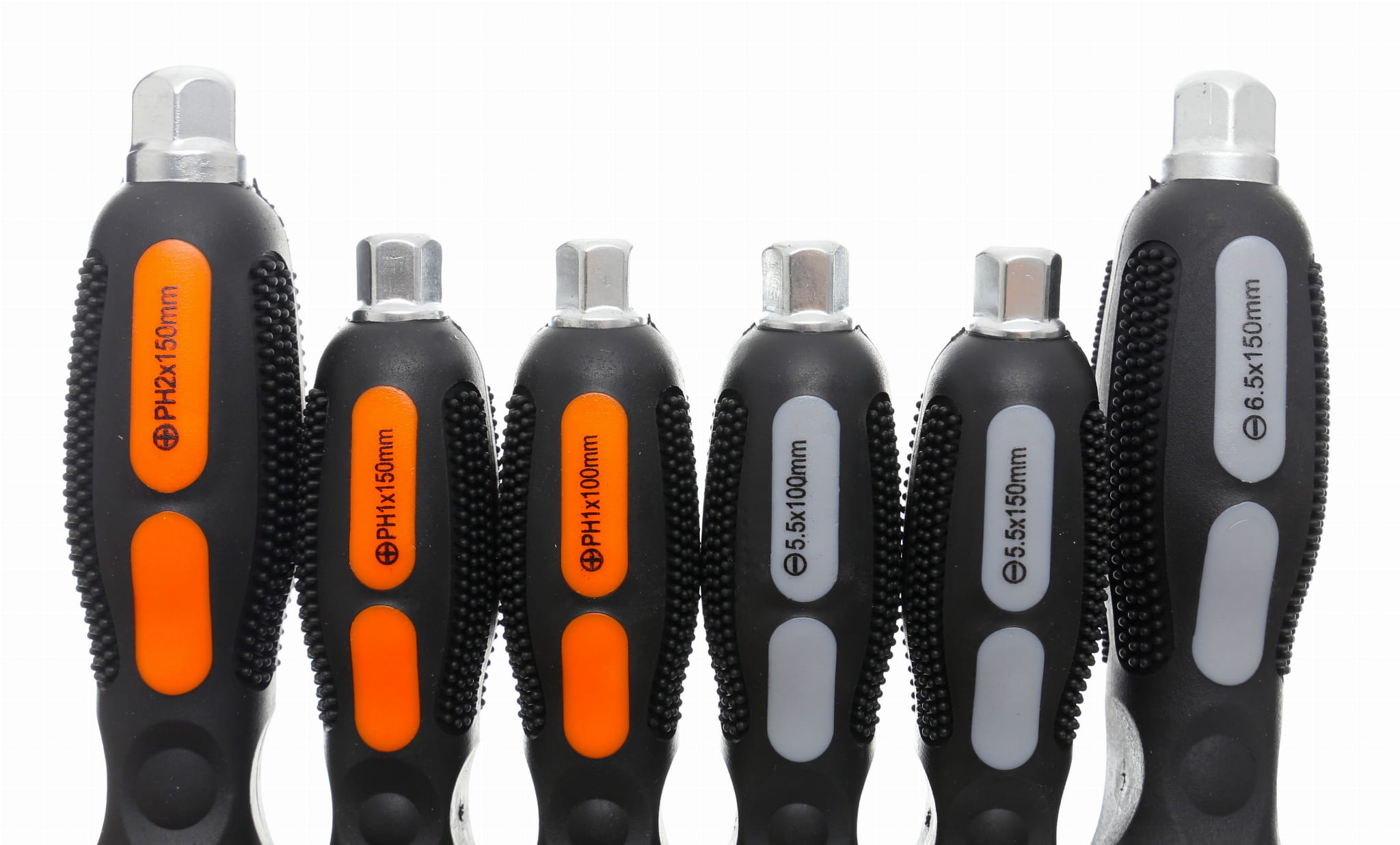 Kompletny zestaw sześciu śrubokrętów przeznaczonych do prac montażowych i serwisowych w warsztacie oraz garażu. Zawiera trzy wkrętaki płaskie i trzy krzyżowe typu PH, dobrane w rozmiarach pokrywających najczęściej spotykane śruby w urządzeniach mechanicznych, elektronicznych i konstrukcjach meblowych.