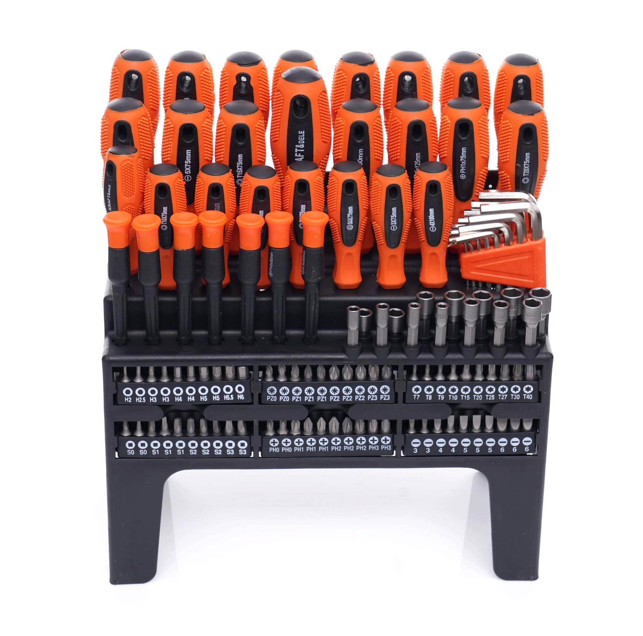 Kompletny zestaw narzędzi ręcznych przeznaczony do prac montażowych, serwisowych i naprawczych. W skład zestawu wchodzą śrubokręty oraz bity różnych typów i rozmiarów, przechowywane w dedykowanym stojaku organizującym przestrzeń roboczą.