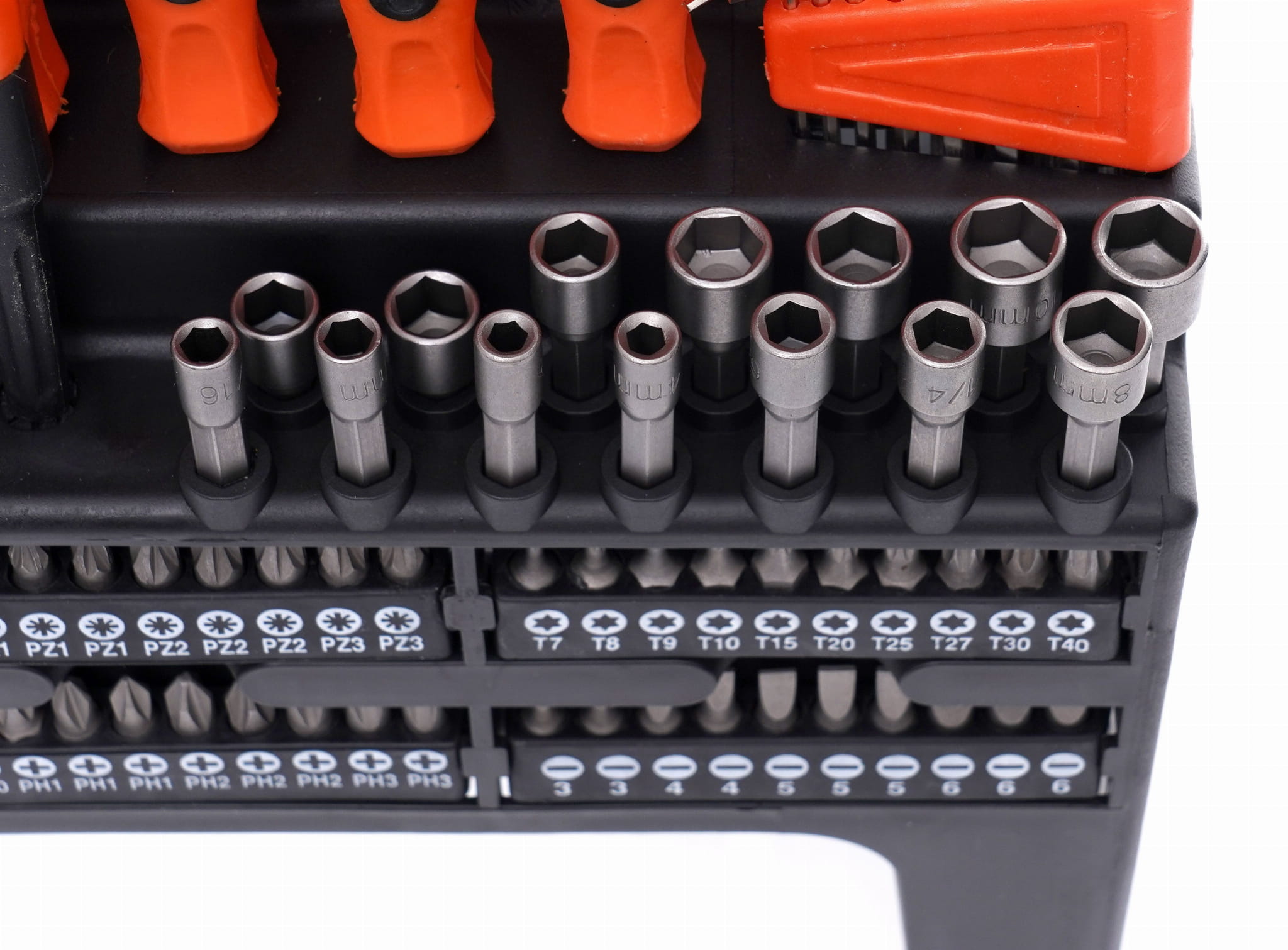 Dołączony stojak umożliwia uporządkowane przechowywanie wszystkich elementów zestawu. Każde narzędzie ma wyznaczone miejsce, co przyspiesza wyszukiwanie odpowiedniej końcówki podczas pracy i zmniejsza ryzyko zagubienia elementów.