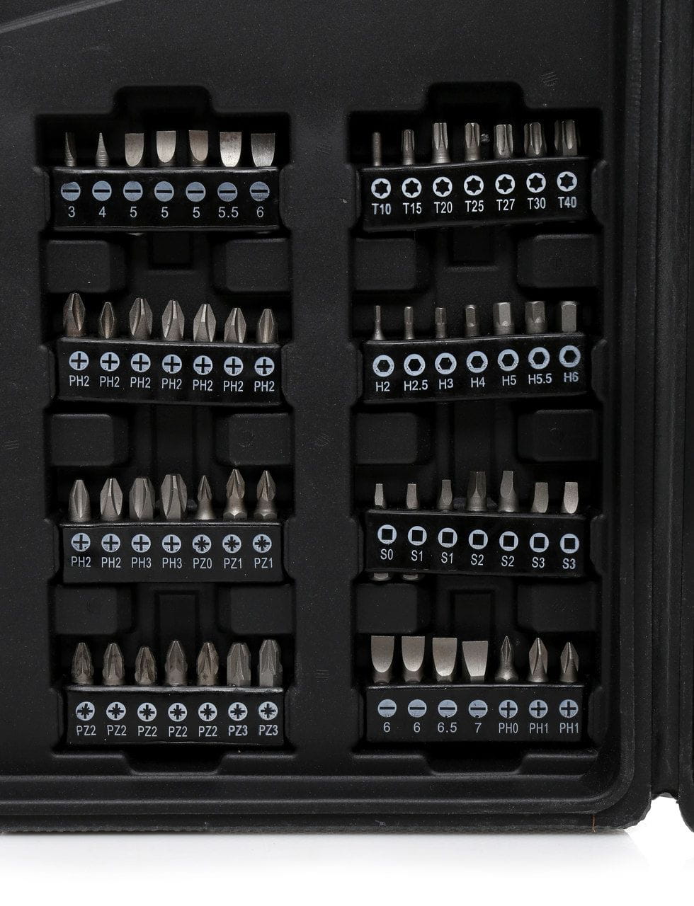 Zestaw zawiera bity i wkrętaki w profilach płaskim, krzyżowym Phillips (PH), Pozidriv (PZ), Torx, sześciokątnym (HEX) oraz kwadratowym (Robertson). Taki dobór pozwala na pracę z przeważającą większością typów łączników spotykanych w elektronice użytkowej, meblach, pojazdach i instalacjach.