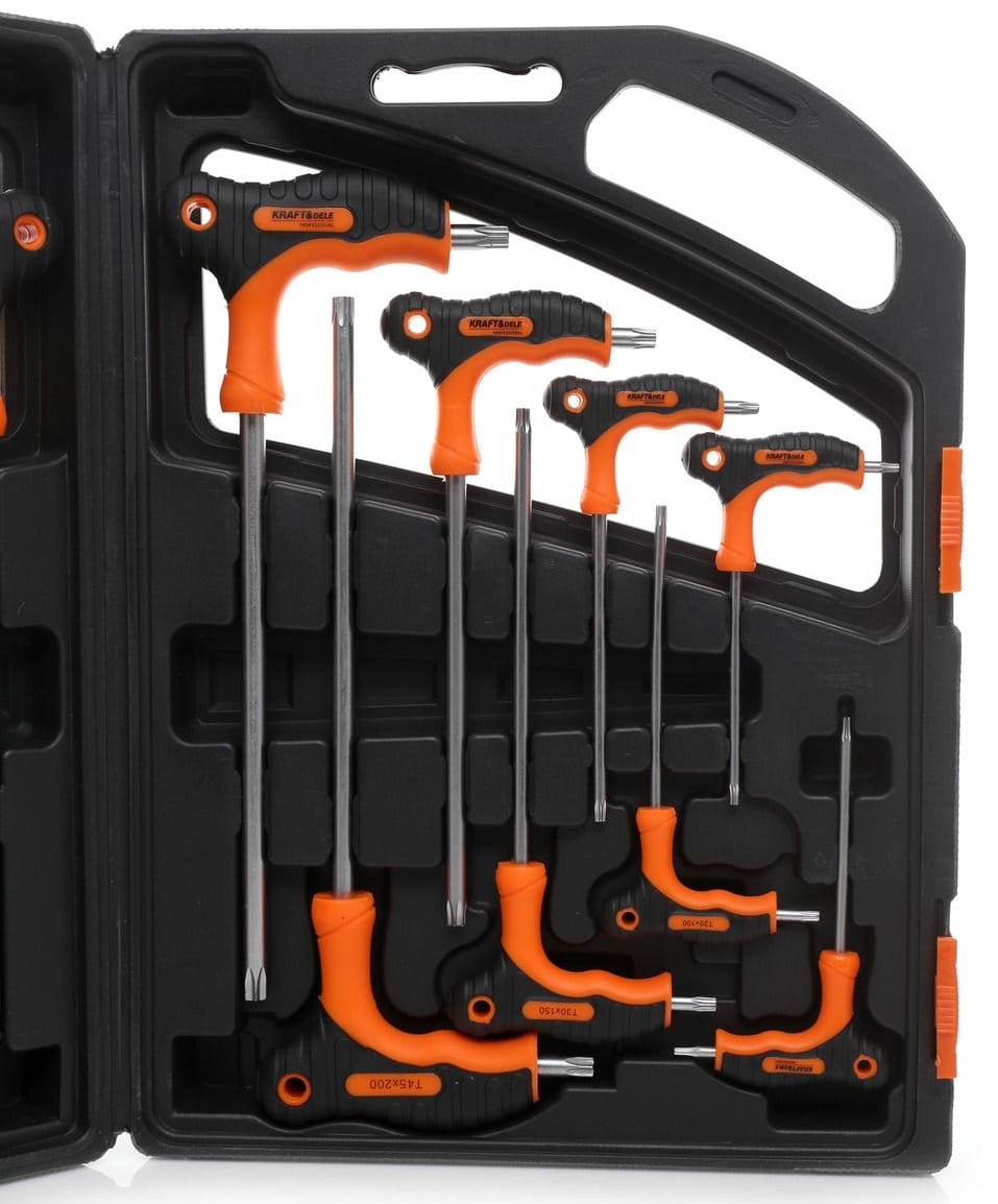 Komplet 16 śrubokrętów z końcówkami TORX, wykonanych ze stali S2 oraz stali chromowo-wanadowej. Zestaw obejmuje pełen zakres rozmiarów — od T10 do T50 oraz od 2,0 do 10,0 mm — i dostarczany jest w walizce transportowej z dedykowanymi miejscami na każde narzędzie.