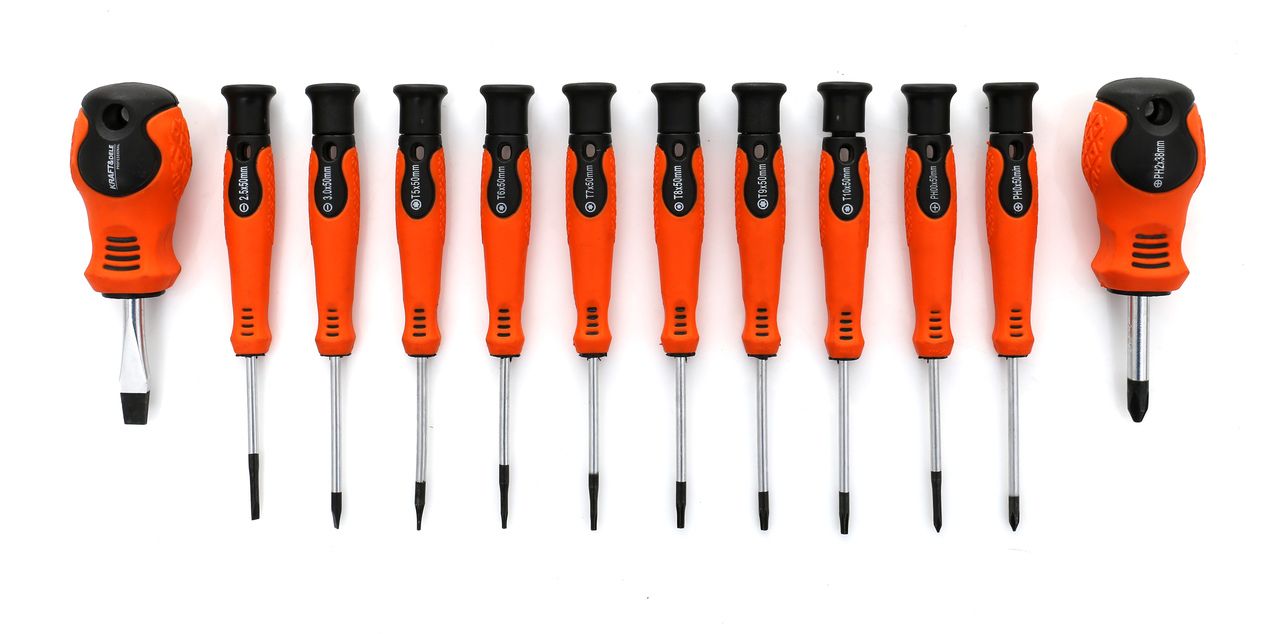 10 wkrętaków precyzyjnych o długości 50 mm obejmuje rozmiary płaskie 2,5 i 3,0 mm, krzyżowe PH0 i PH00 oraz sześć rozmiarów Torx (T5–T10). Taki dobór odpowiada śrubom stosowanym w smartfonach, laptopach, konsolach i innych urządzeniach elektronicznych.
