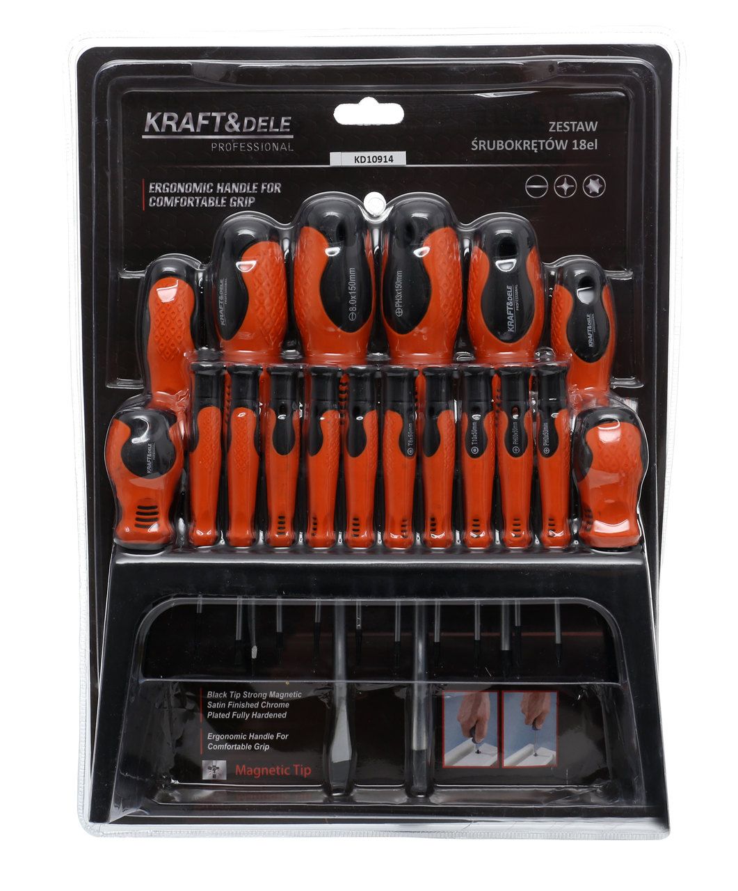 KD10914 to kompletny zestaw 18 śrubokrętów obejmujący narzędzia tradycyjne do prac warsztatowych i garażowych oraz wkrętaki precyzyjne do elektroniki i drobnych mechanizmów. Zestaw łączy wkrętaki płaskie, krzyżowe Phillips i końcówki Torx w jednym komplecie.