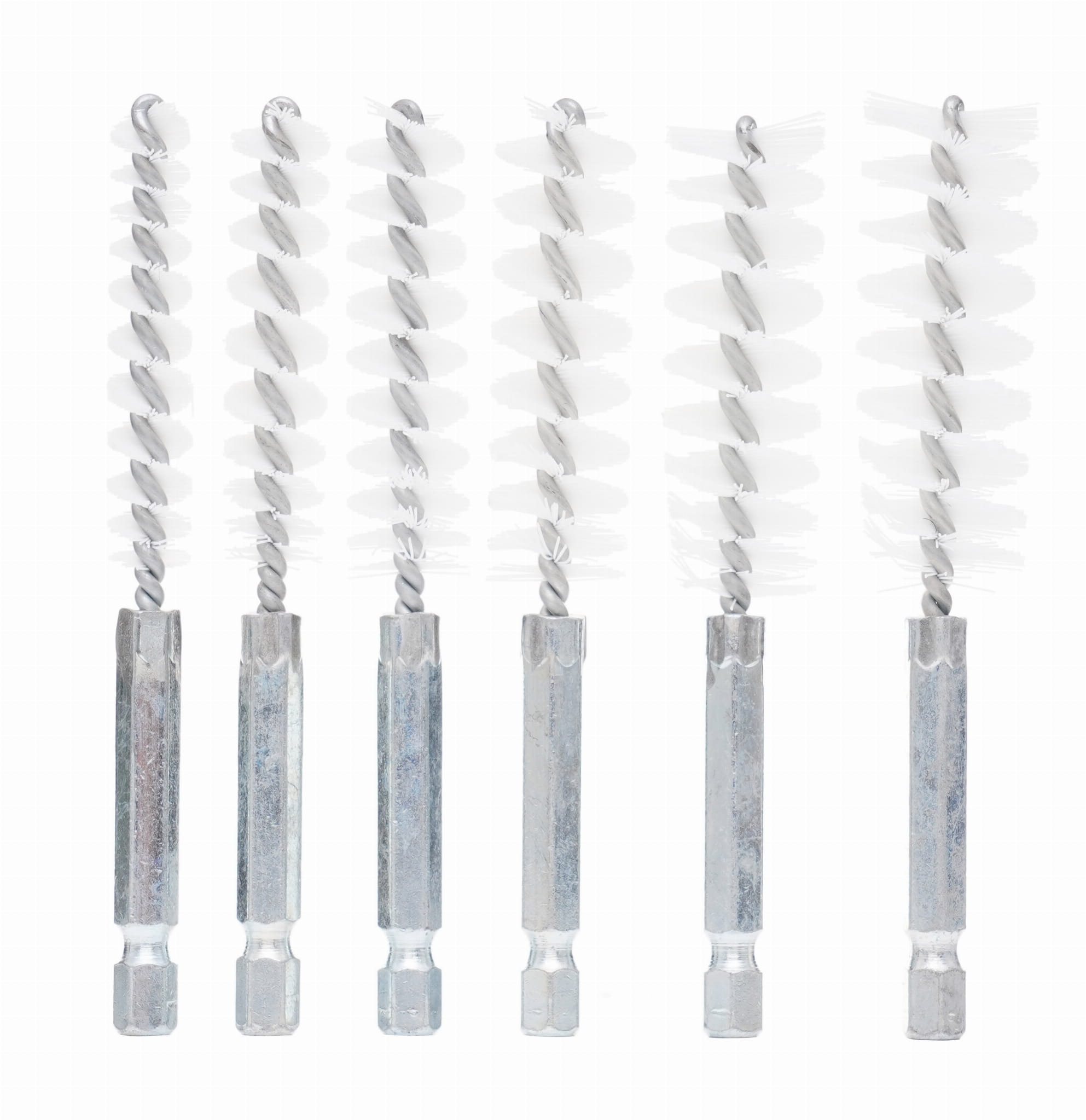 Zestaw zawiera po 6 szczotek stalowych, mosiężnych i nylonowych. Stalowe sprawdzają się przy twardych, zwęglonych osadach. Mosiężne są mniej agresywne i stosowane tam, gdzie ryzyko zarysowania gniazda jest istotne. Nylonowe służą do końcowego czyszczenia i usuwania luźnych zanieczyszczeń bez ingerencji w metal.