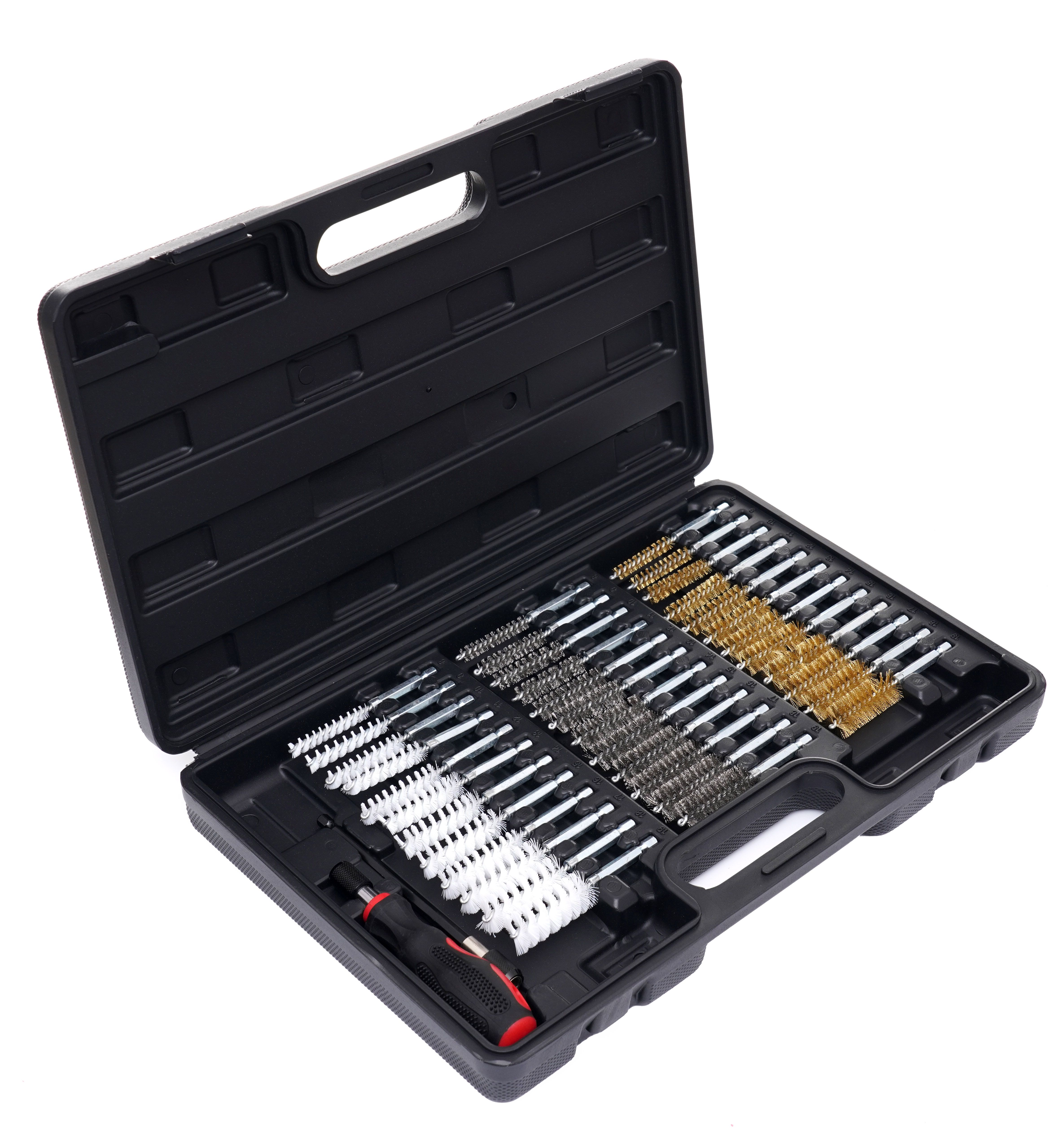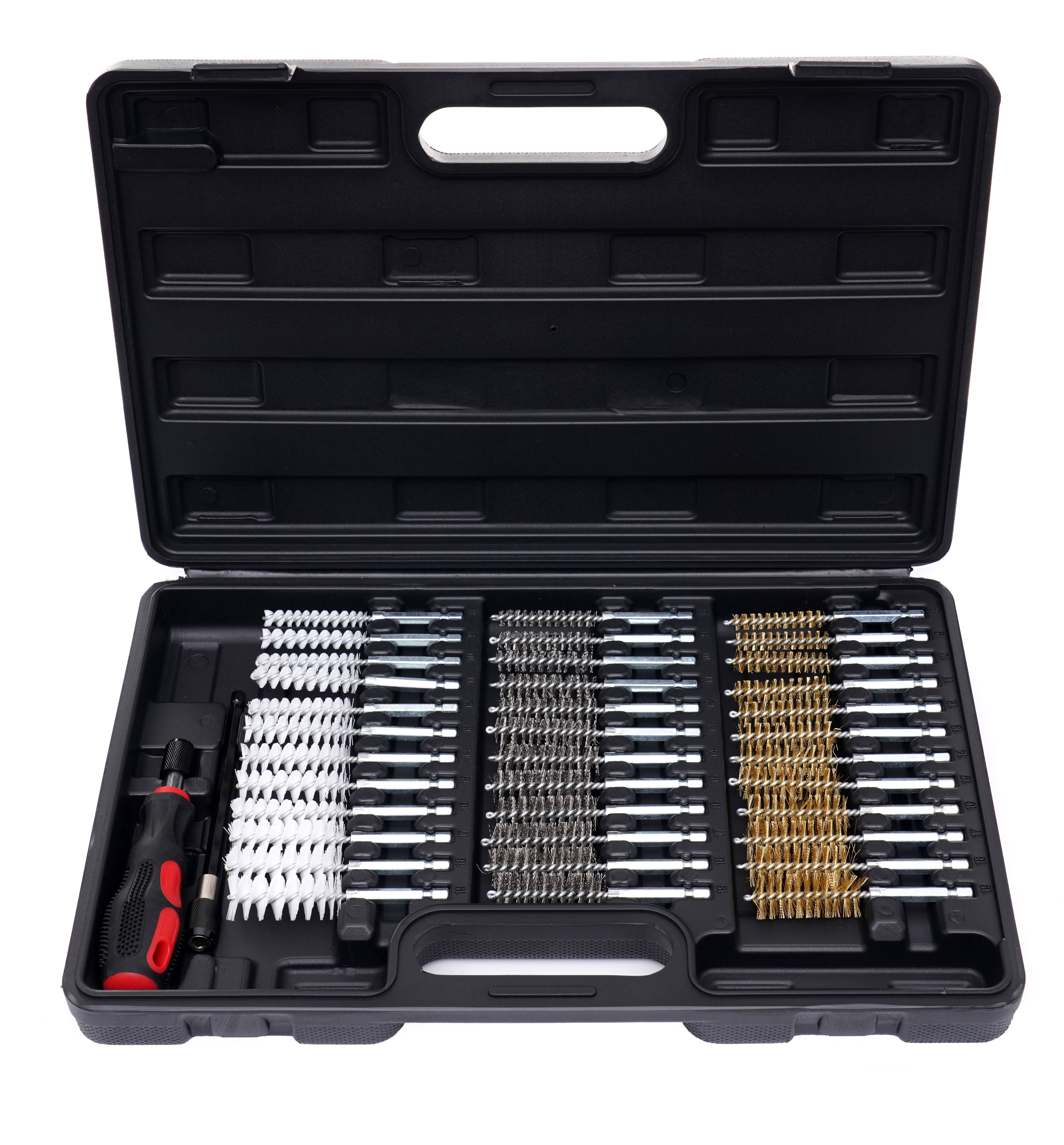 Plastikowy organizer z dedykowanymi przegródkami ułatwia utrzymanie porządku i szybkie znalezienie właściwej średnicy oraz rodzaju szczotki.