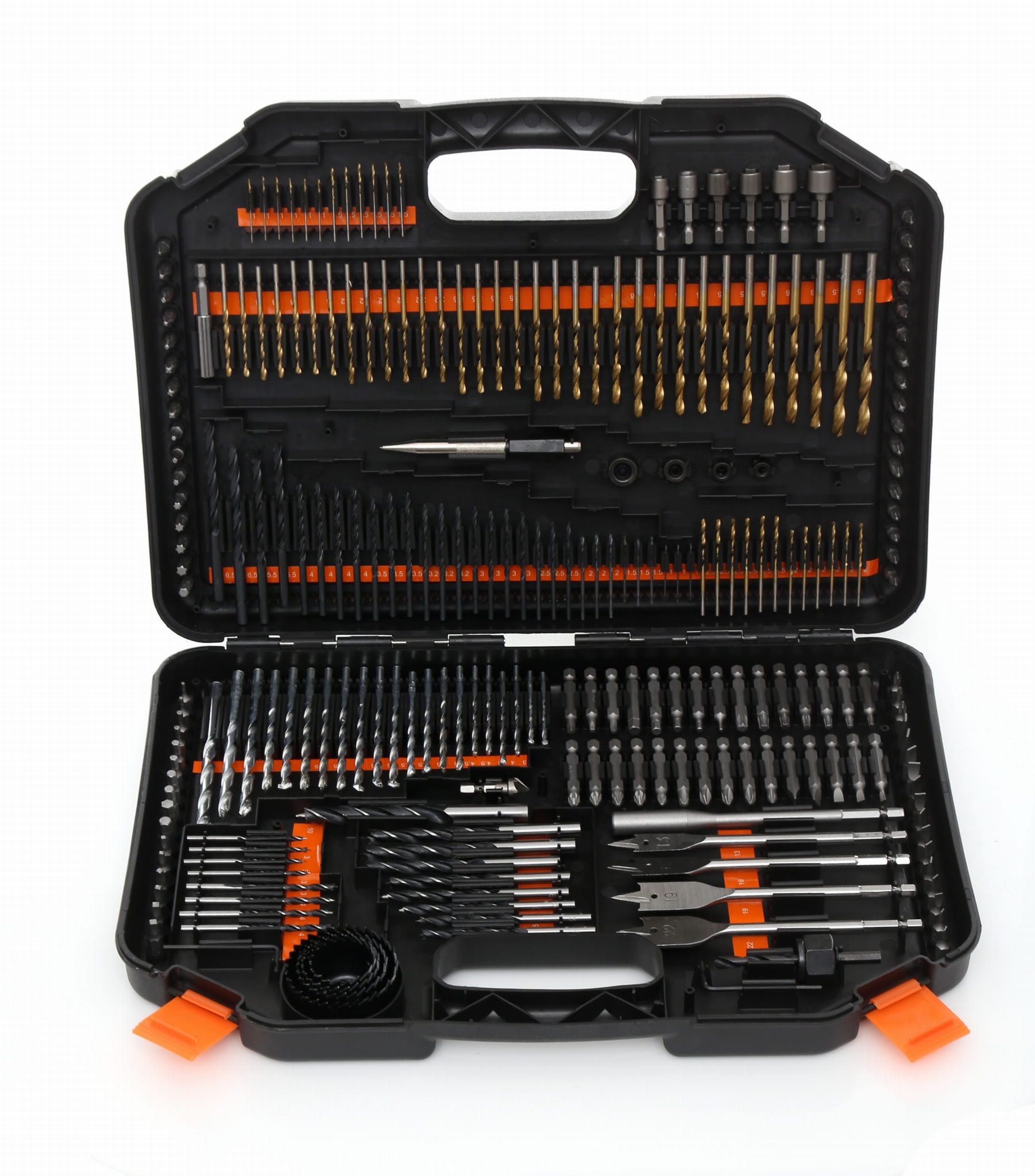 | Elementy zestawu | Wiertła HSS, wiertła kobaltowe HSS, wiertła do drewna, wiertła łopatkowe z przedłużką, wiertła do betonu, ograniczniki głębokości, nasadki trzpieniowe sześciokątne, pogłębiacz stożkowy, otwornice do drewna, punktak, adapter do bitów, bity 25 mm, bity 50 mm |